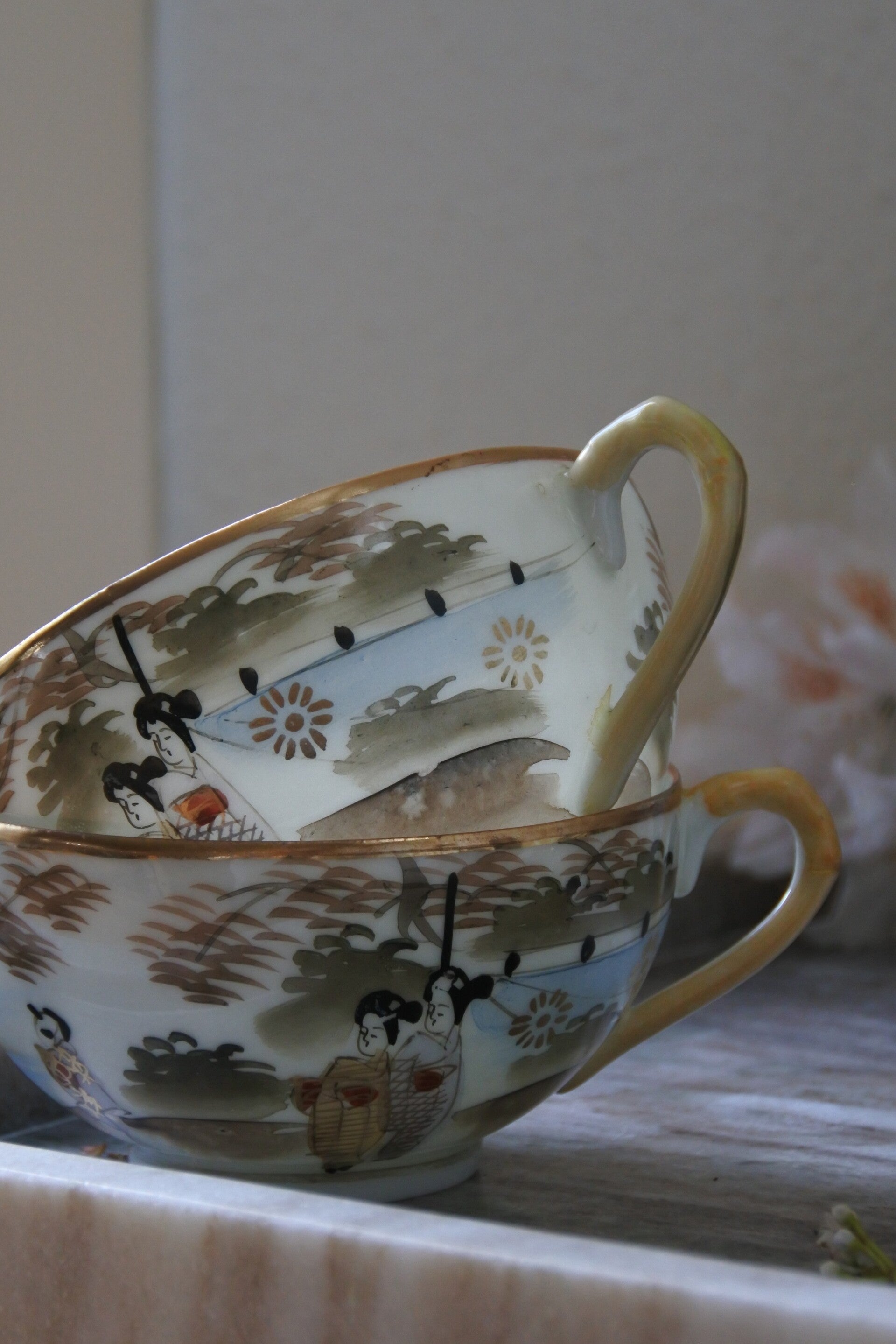 Vintage delicaat Japanse hand beschilderde eierschaal kopjes met prachtige tekening rondom en fijne goudkleurige details. Deze kopjes zijn echte 'oudjes' van zeer dun porselein, wanneer je de kopjes tegen het licht houd kijk je er bijna doorheen!