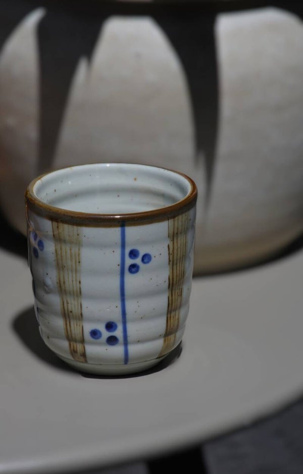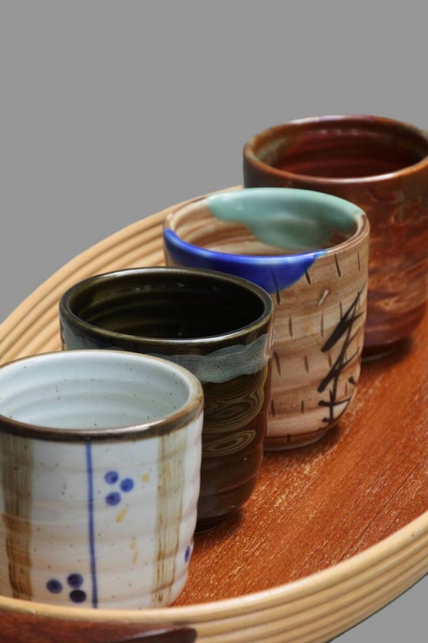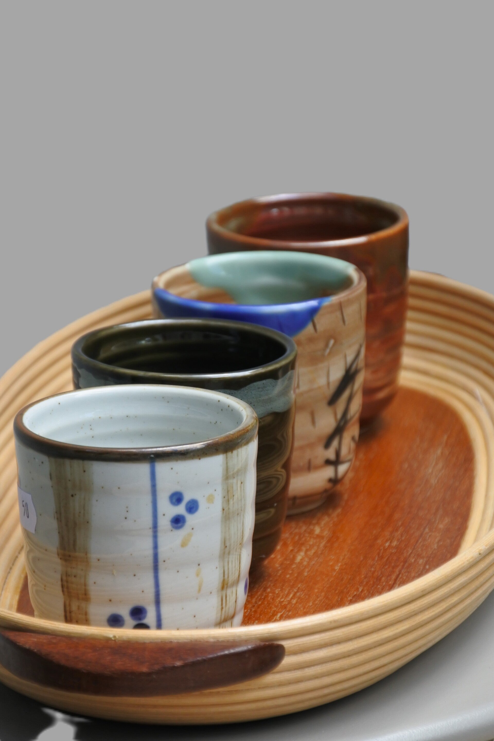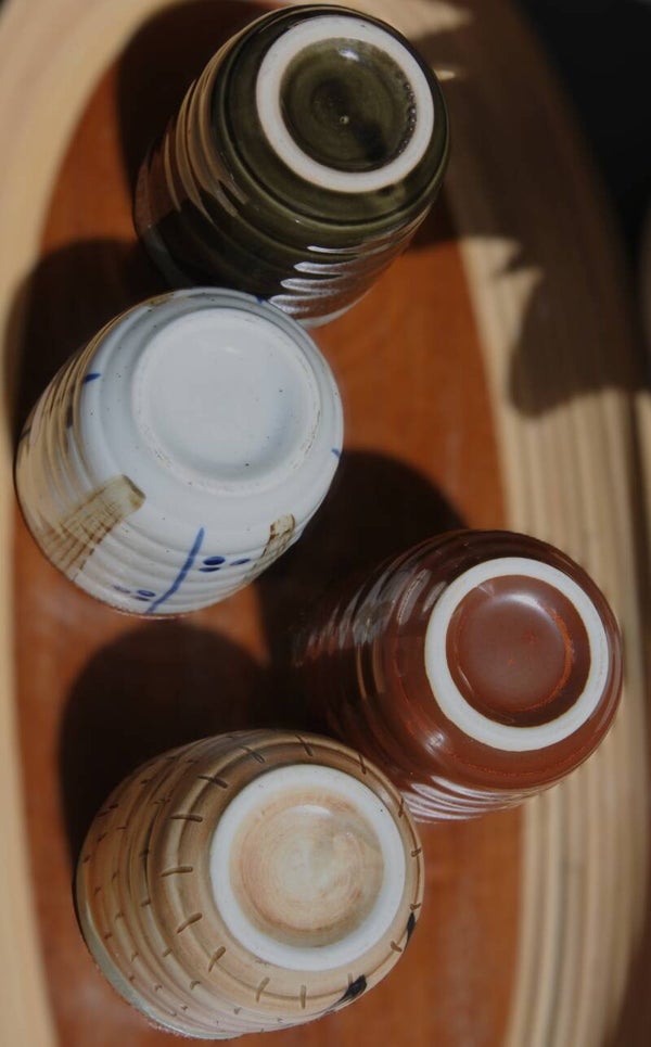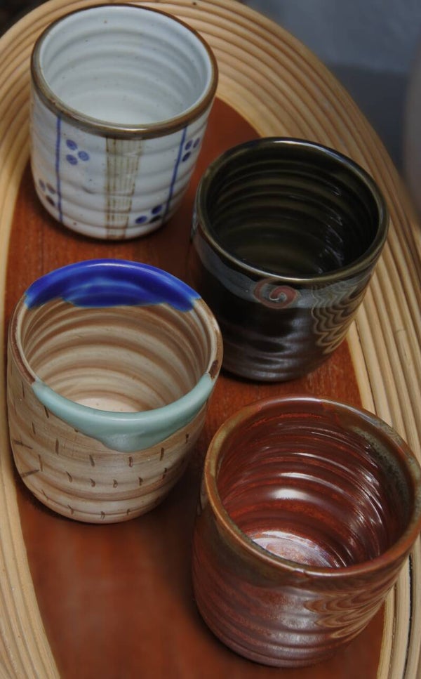 Set van 4 Japanse sake - koffie - thee - toetjes mokjes (ook leuk voor nootjes of het presenteren van een smeerseltjes, ok nu stoppen we) van keramiek. Alle 4 de mokjes hebben hun eigen stijl en zijn toch super matchy bij elkaar.