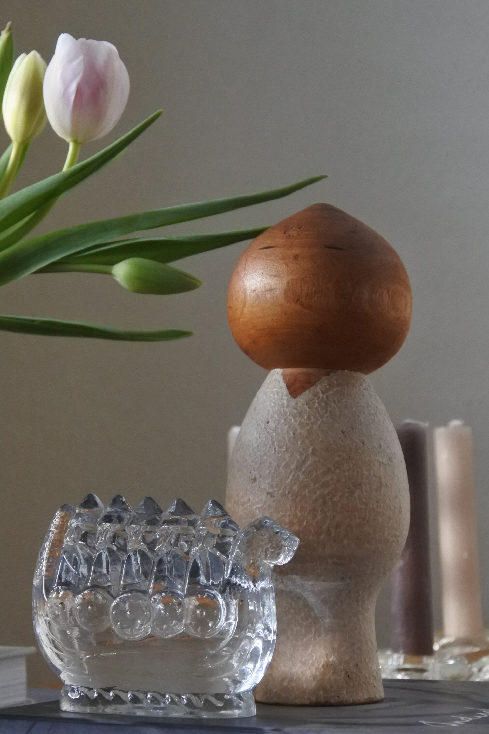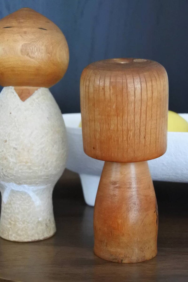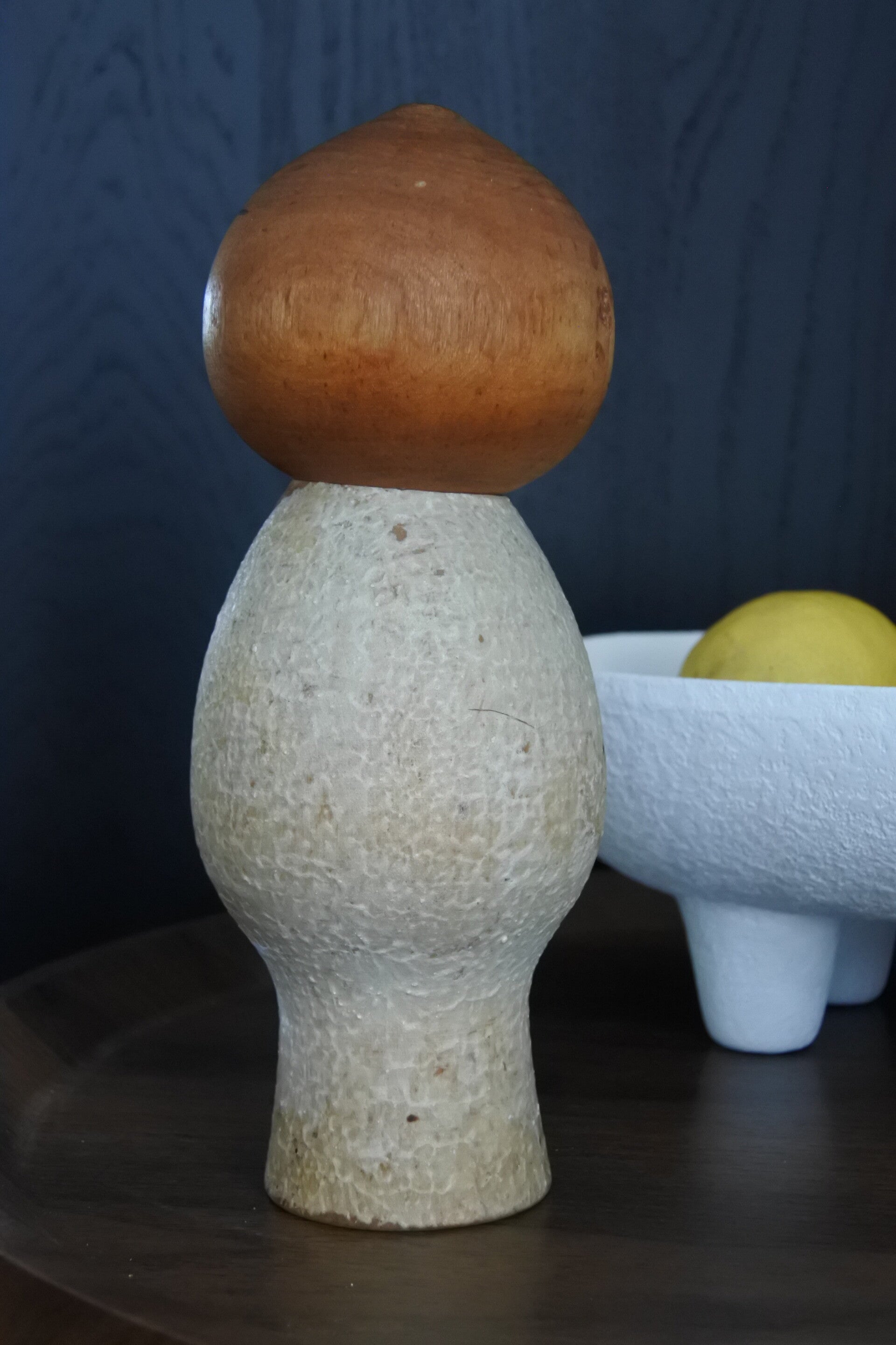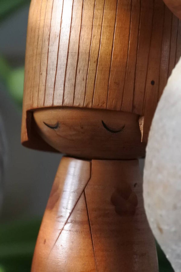 Prachtig vintage Japanse houten kokeshi gemaakt door Meester Vakman Watanabe Masao, getiteld Mushin. Dit mooie beeld van hout is vervaardigd uit 1 stuk.