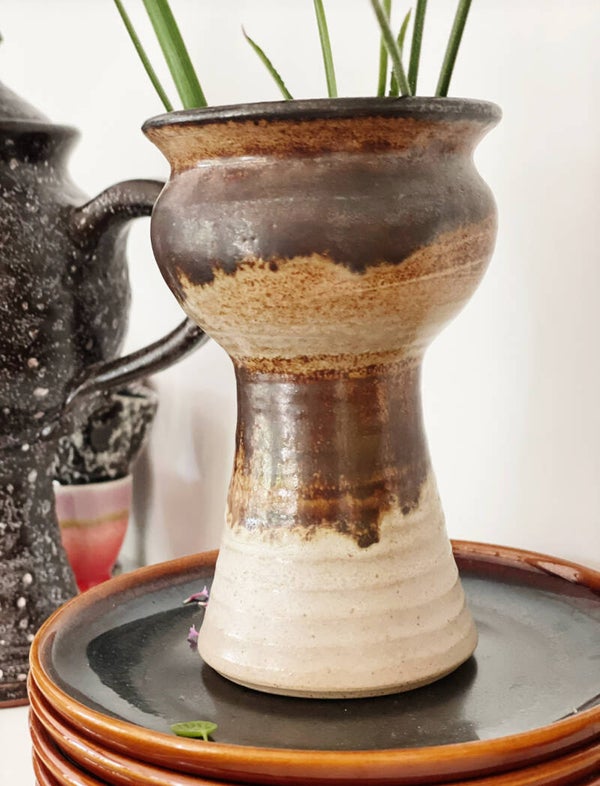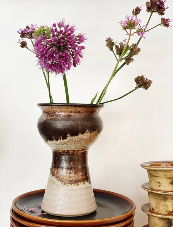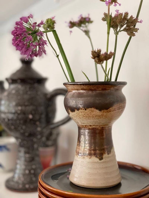 Mooi vintage aardewerk vaasje (maar ook net zo mooi als bloempotje) heeft een leuke speelse vorm en een mooi kleurverloop.