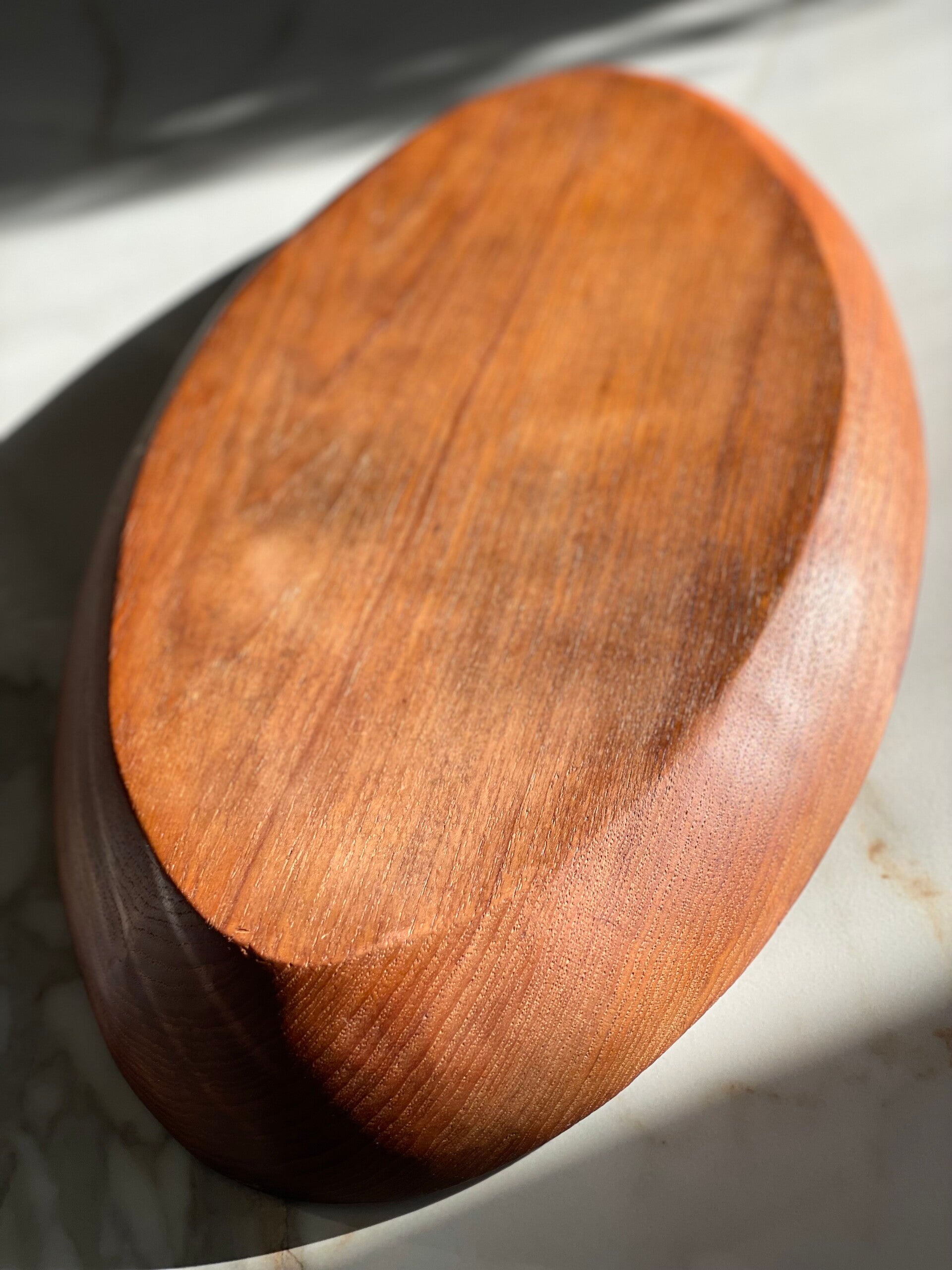 Mooie vintage serveerschaal van teakhout ontworpen door Laur Jensen voor Odense Denmark. Deze mooie teakknapperd is perfect voor het presenteren van fruit of beleg bij een zondags ontbijt, nootjes, tapasjes en ga zo maar door.