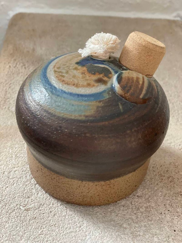 De stukken van Joke Stroes zijn door vintage keramiek verzamelaars heel geliefd en wij begrijpen waarom! dit mooie olielampje ontworpen voor Mobach Utrecht heeft een mooie steen grijs-zand kleur met bruin en blauwe accentjes. Een zowel lief (doordat we een paddenstoeltjes associatie hebben bij dit lampje) als stoer item dus welke in vrijwel elk hedendaags interieur past door zijn tijdloze design.