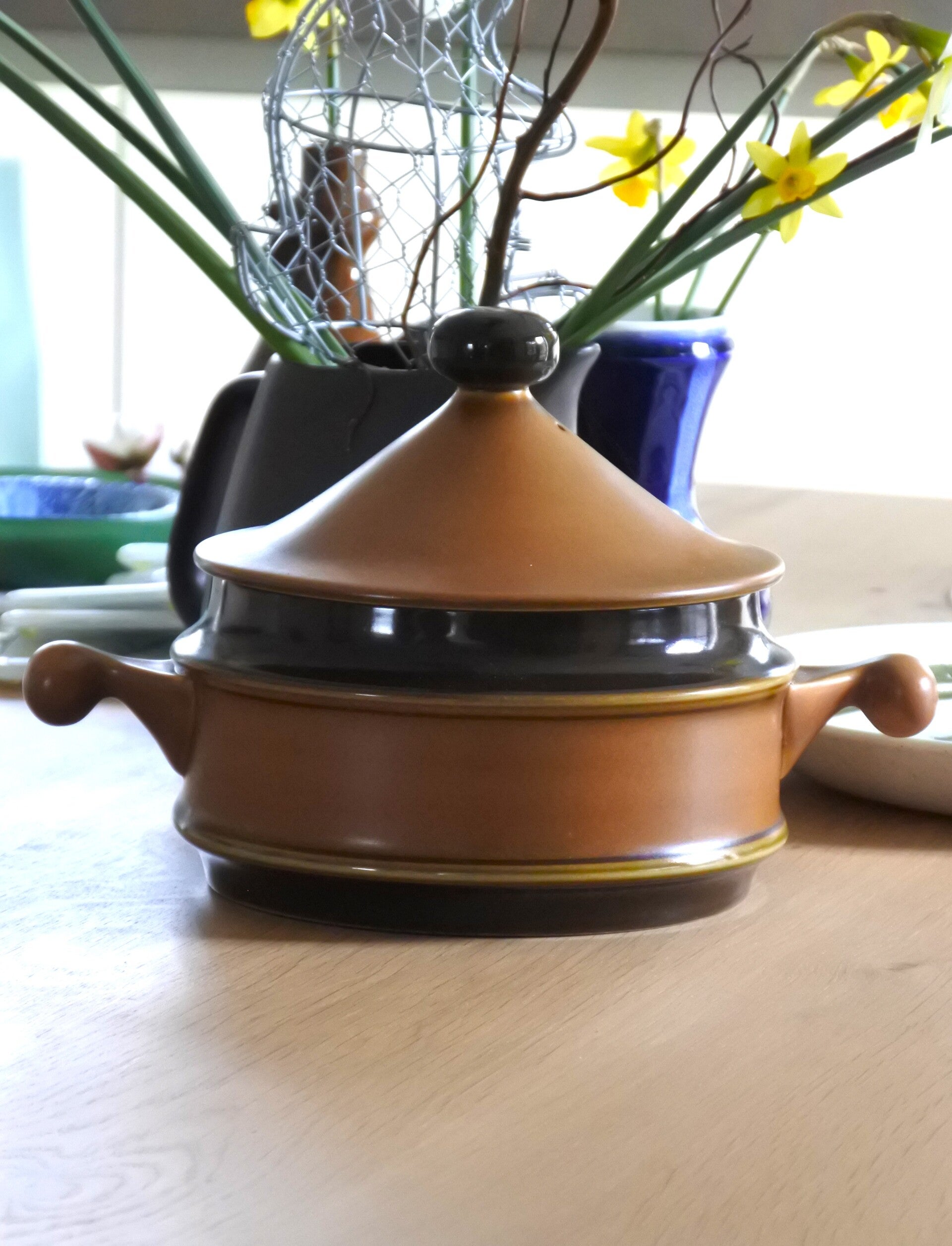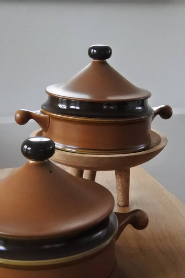 Mooie tijdloos vormgegeven dekschalen van Goebel uit de serie Bretagne. De schalen hebben een zacht bruin-groenige kleur en donkere accenten rondom en op de handvaten. Prijs per stuk.
