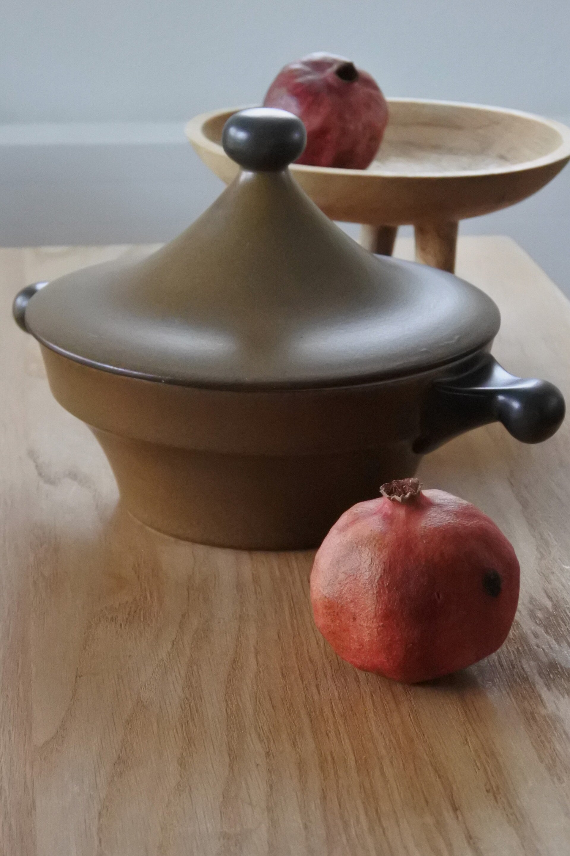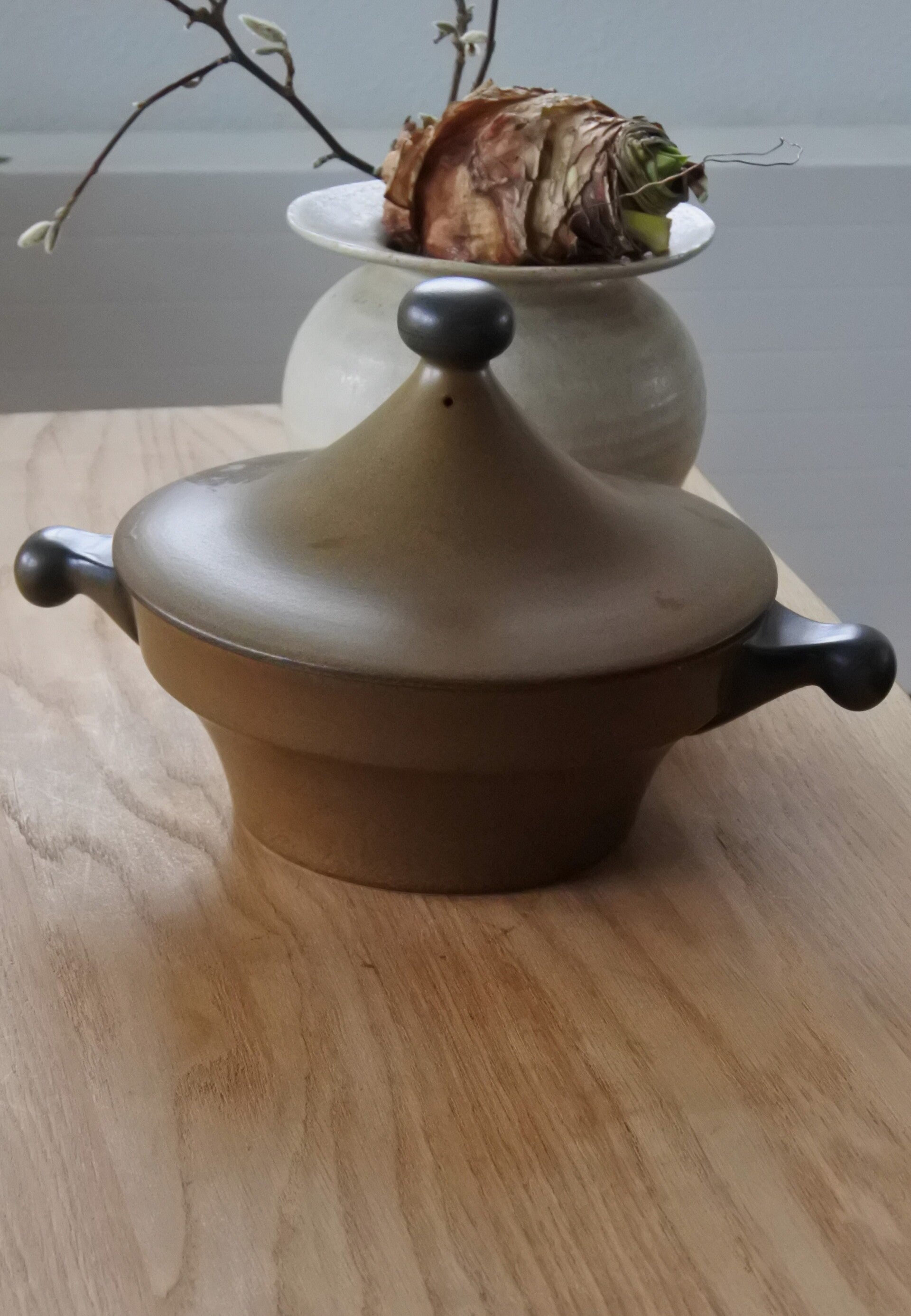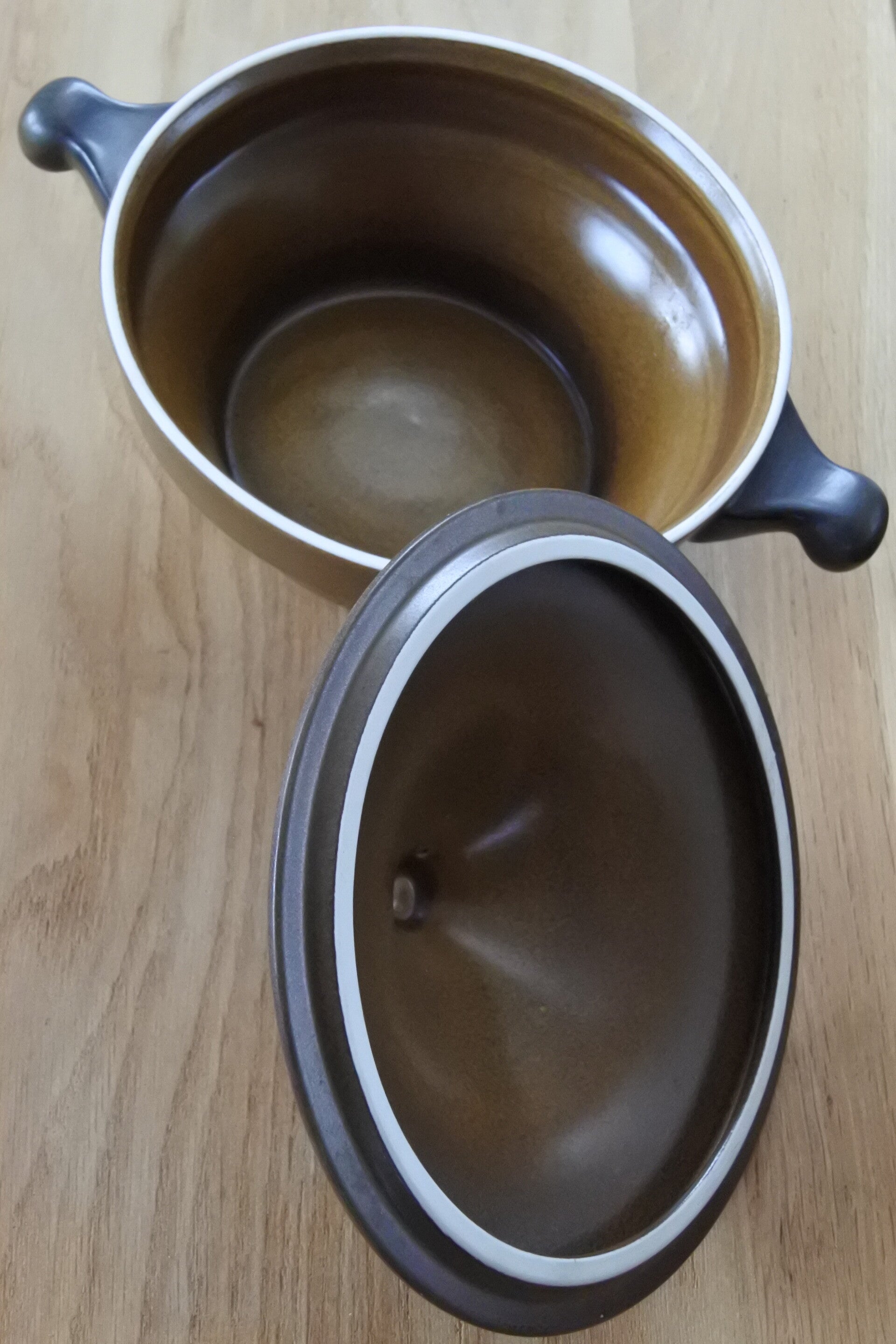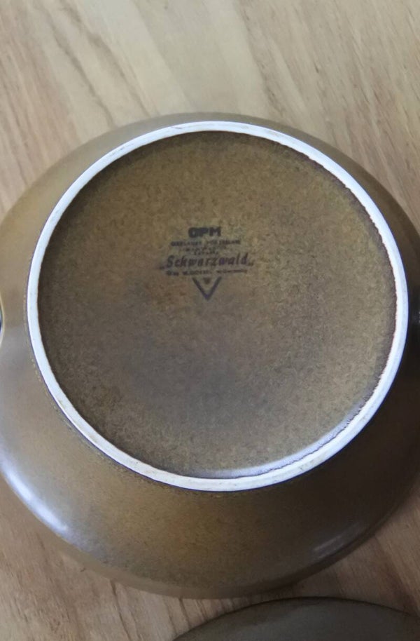 Mooie tijdloos vormgegeven dekschalen van DPM Schwarzwald West Germany. De schalen hebben een mooie koffiekleur en donkere accenten op de handvaten. Prijs per stuk.