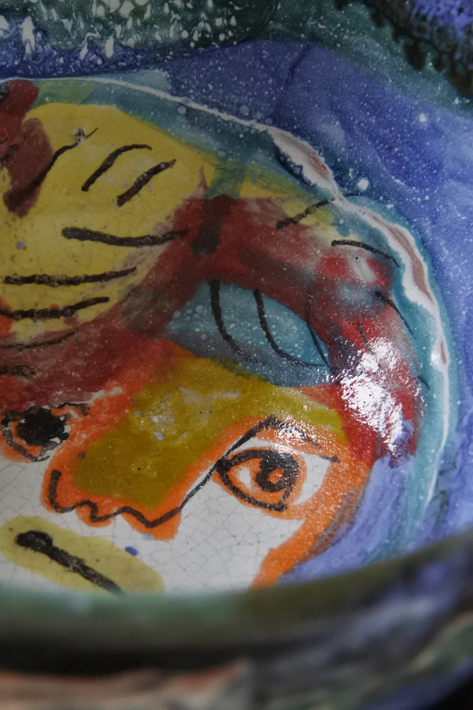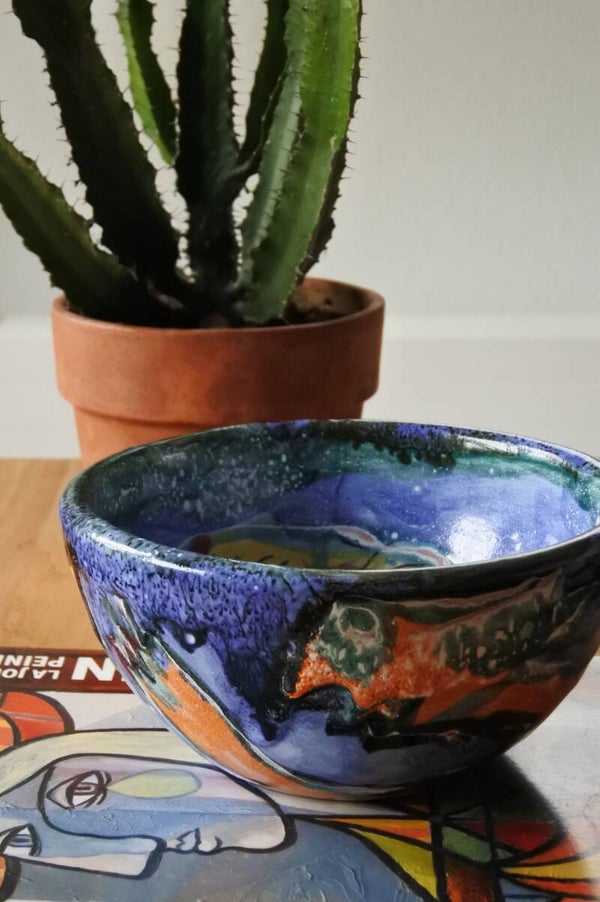 Goedemorgen, mensen, kinderen, die is mooi. T'lijkt wel een Picasso man! tsja we heten misschien wel zjiek maar als we zoiets moois tegen het lijf lopen dan vergeten we spontaan chic te blijven. Deze ronde aardewerken schaal is aan zowel de binnen- als buitenzijde prachtig gedecoreerd in picasso stijl. Je kunt hem gebruiken als fruitschaal maar wij zouden deze knapperd persoonlijk puur decoratief neerzetten anders komt de mooie binnenzijde niet tot zijn recht. Maar als jij er pasta in wilt serveren, who are we to judge ;)