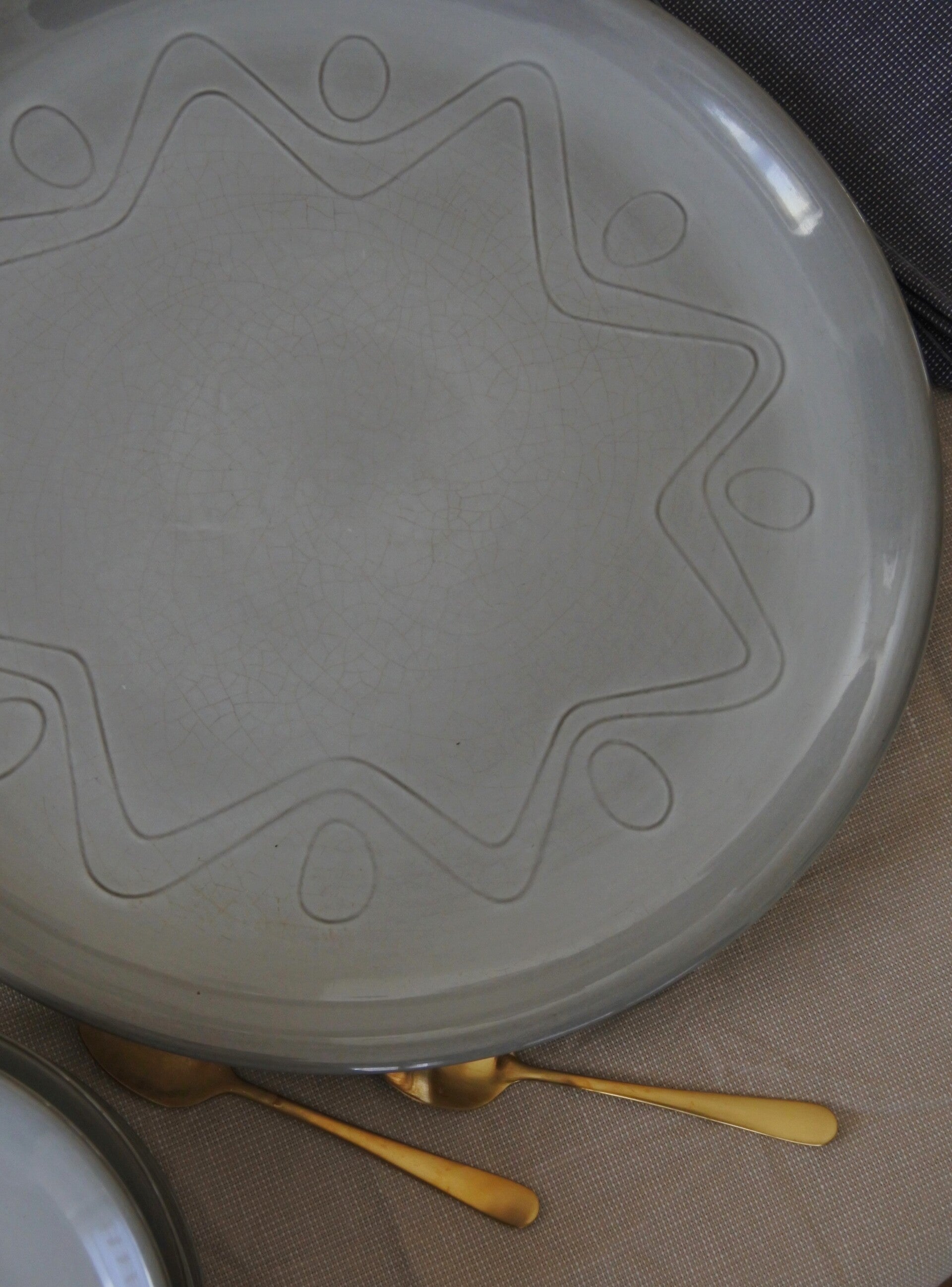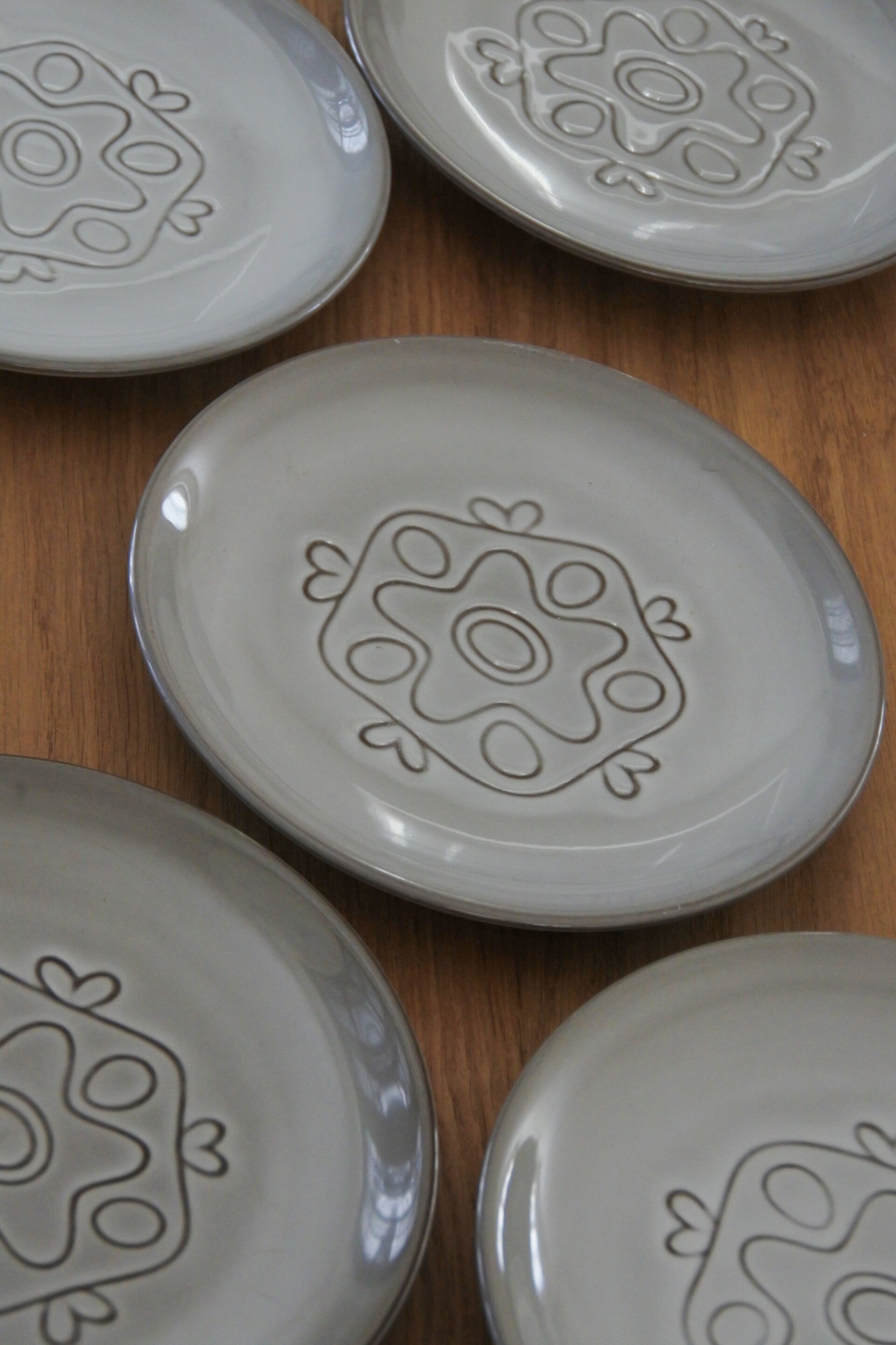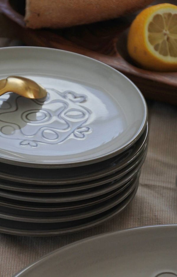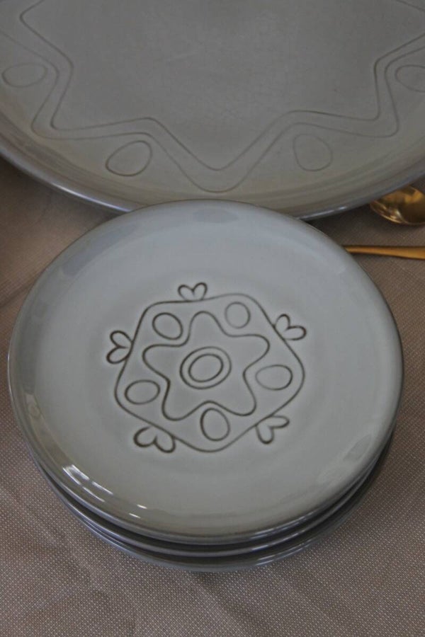 Vintage gebakstel met reliëf patroon in zacht grijs-taupe kleur. Ontworpen door Wim de Vries in de jaren 50 voor de keramiek fabriek Fris te Edam.