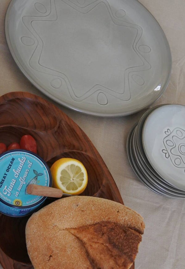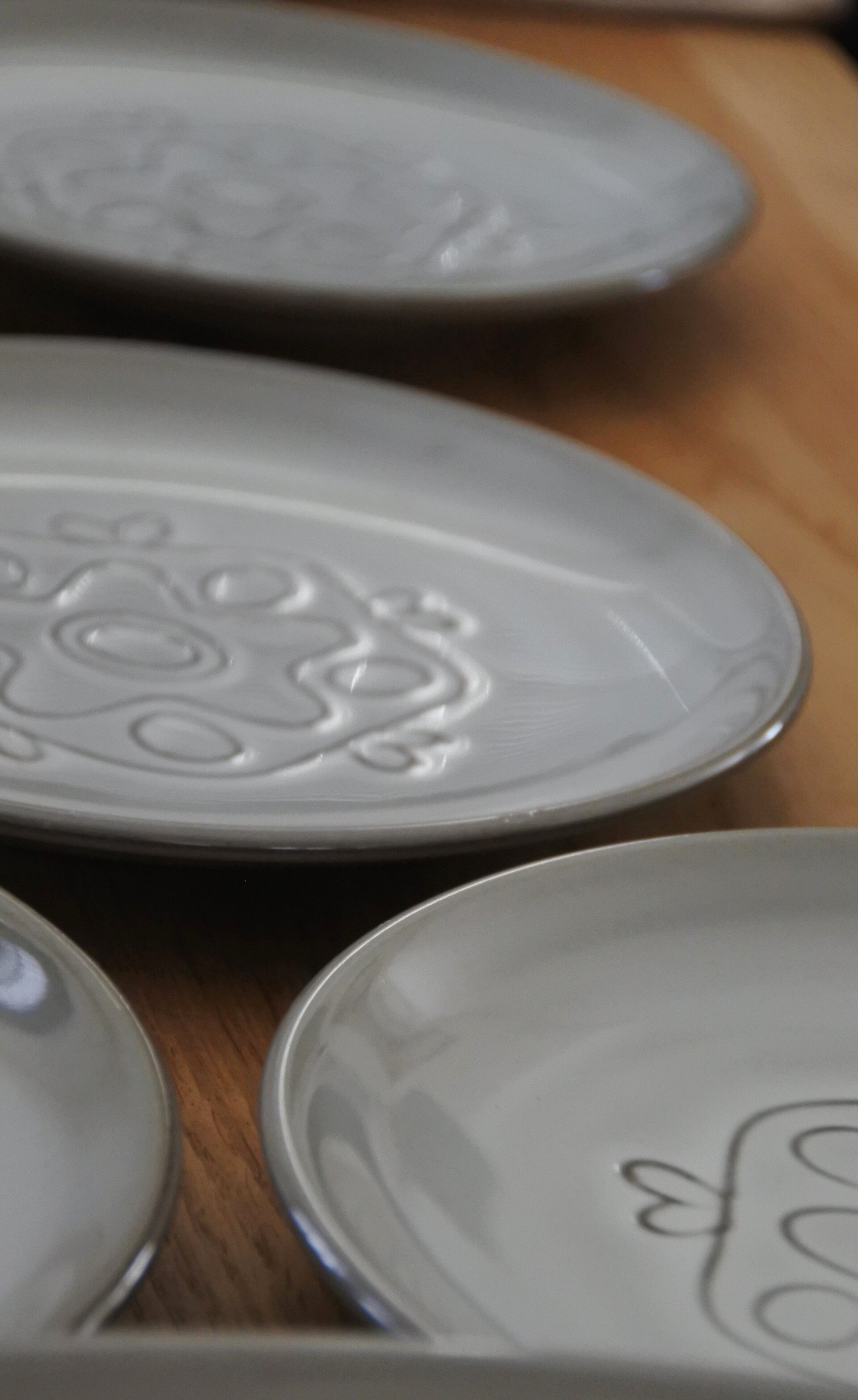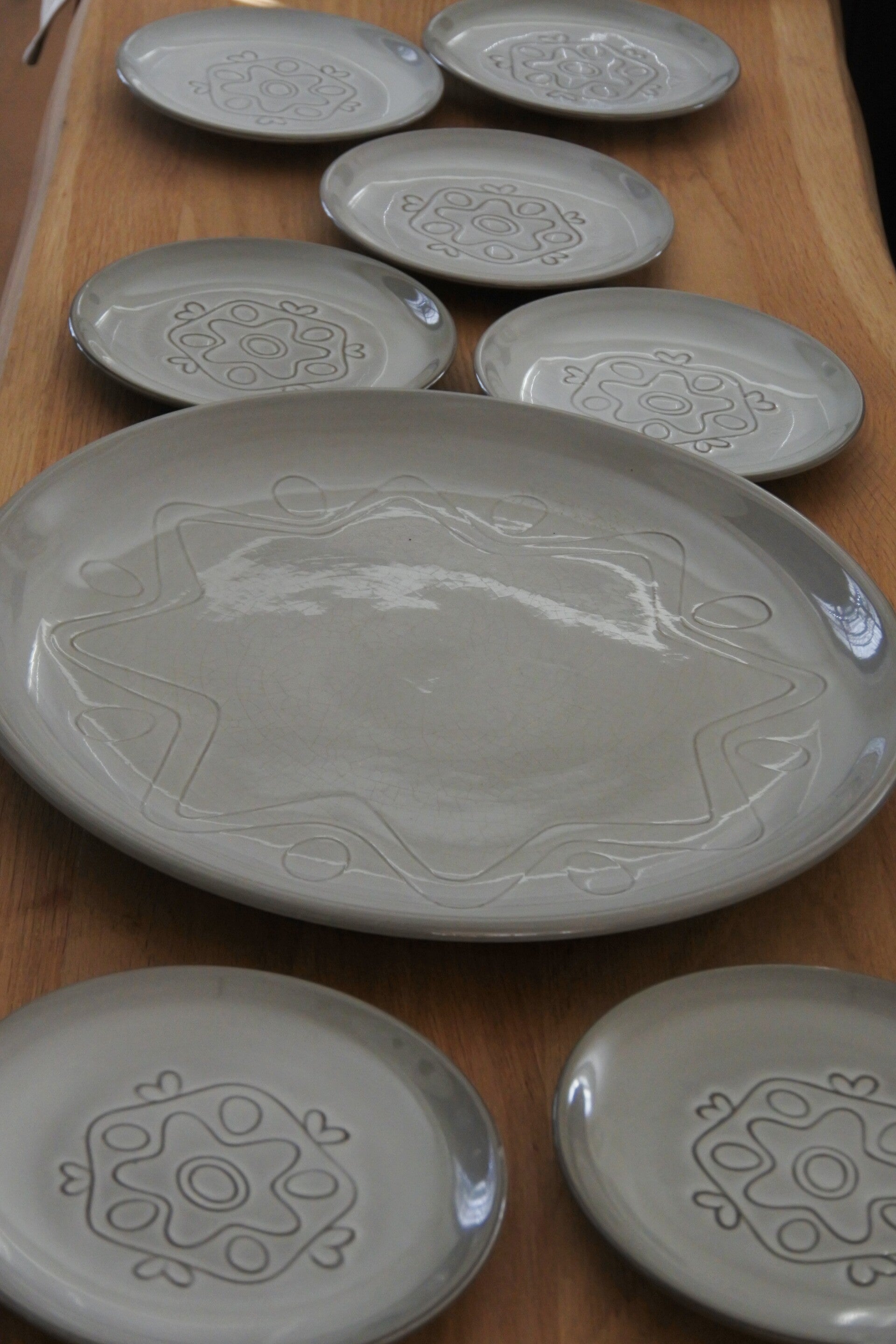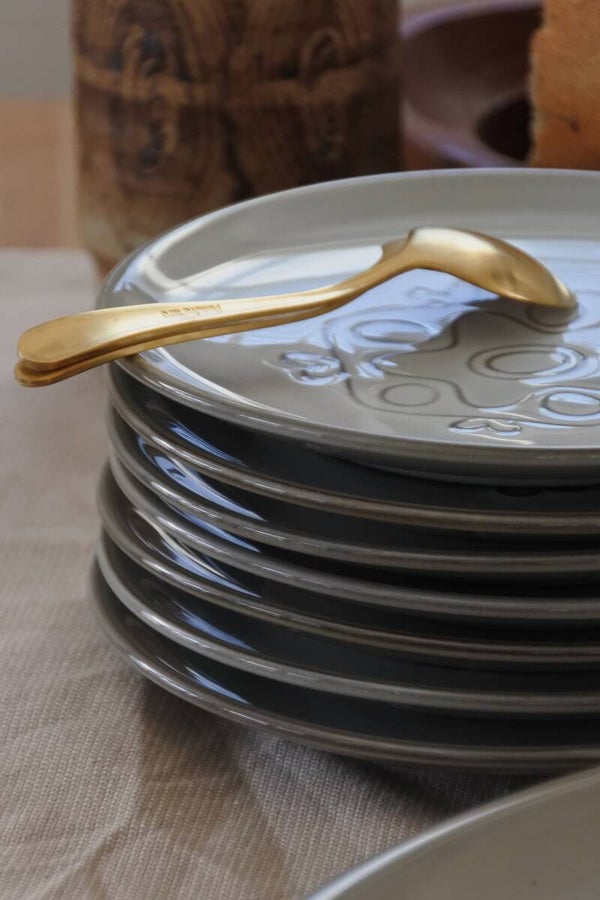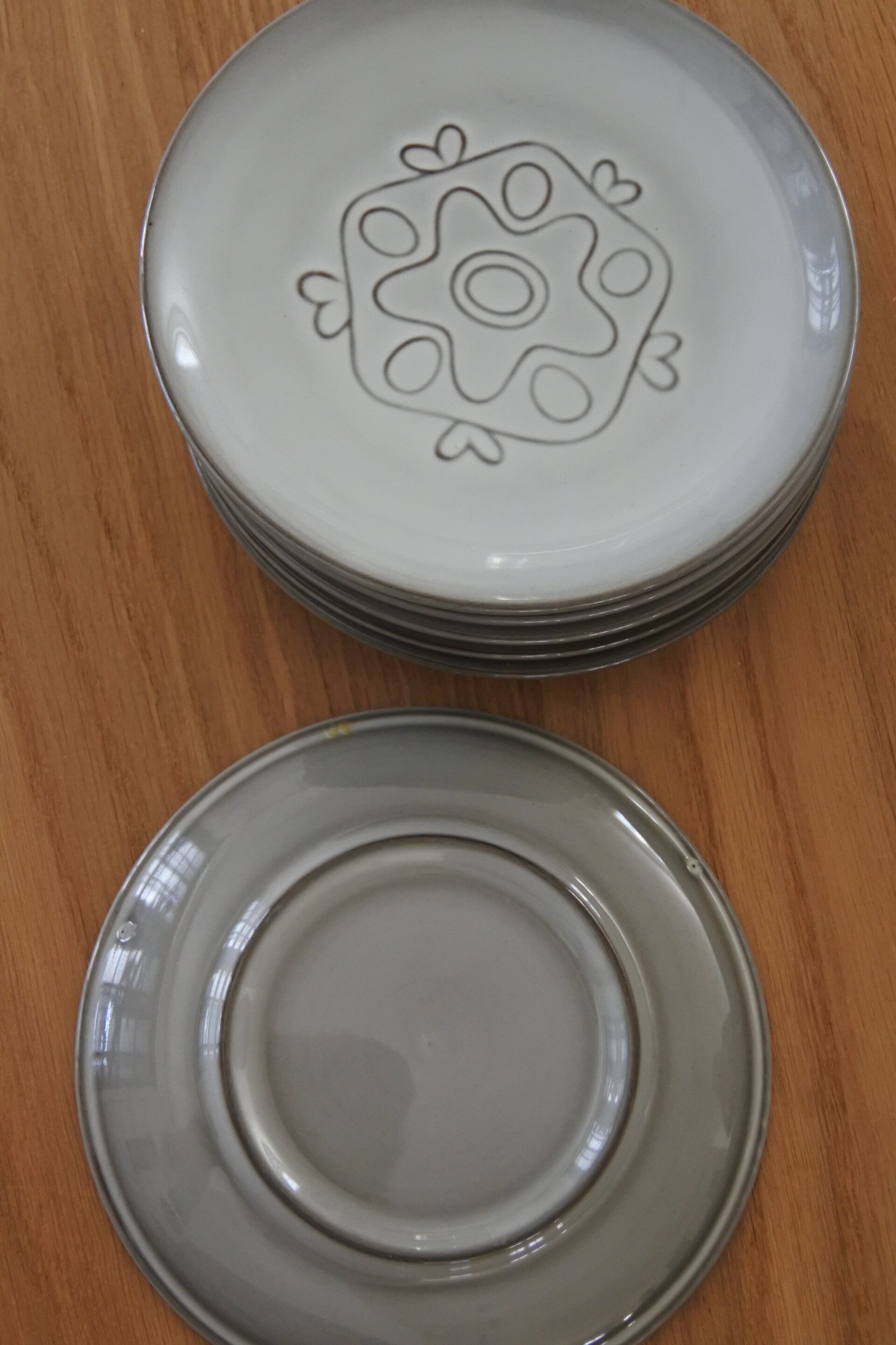 Vintage gebakstel met reliëf patroon in zacht grijs-taupe kleur. Ontworpen door Wim de Vries in de jaren 50 voor de keramiek fabriek Fris te Edam.