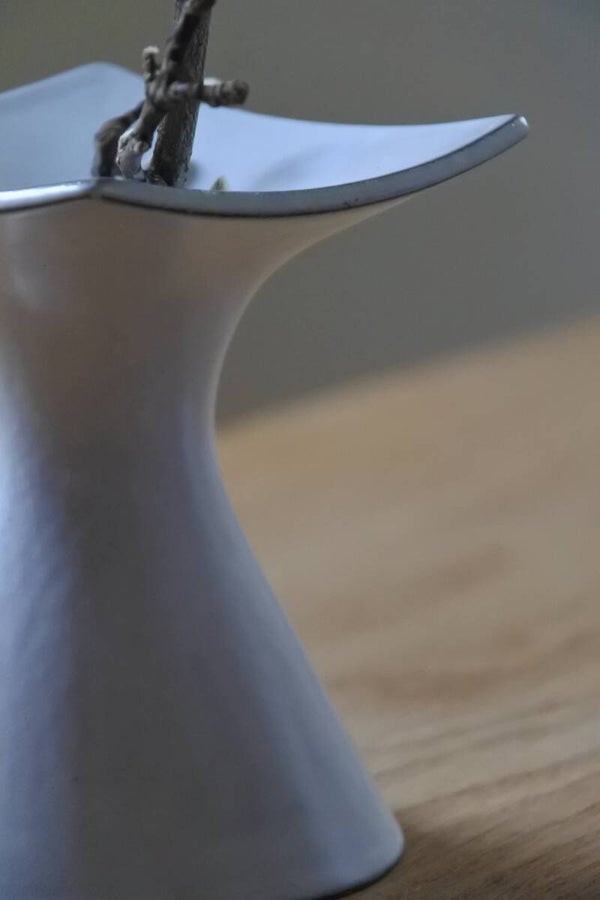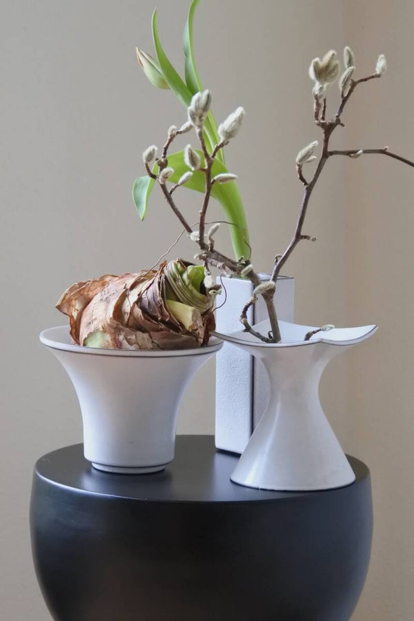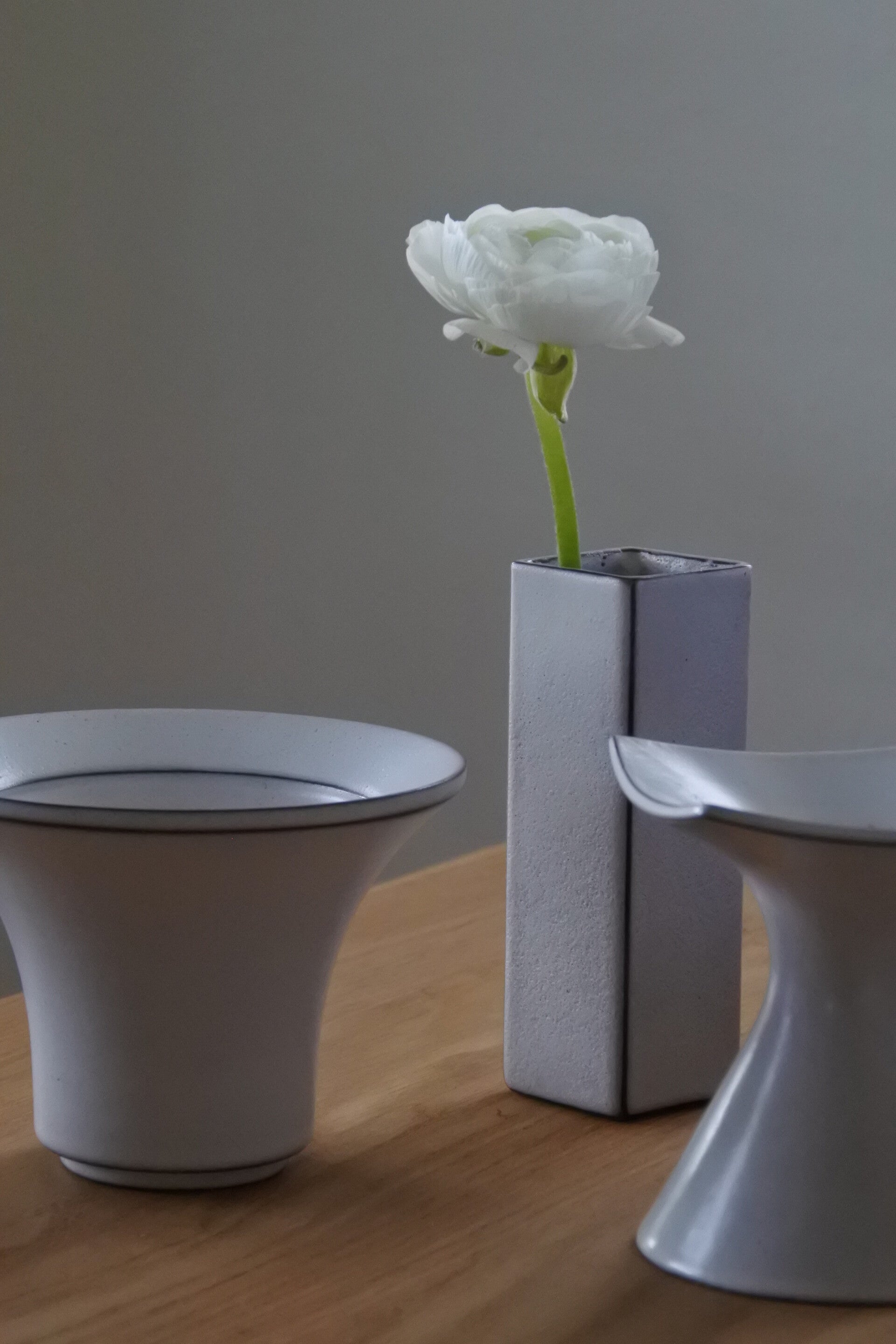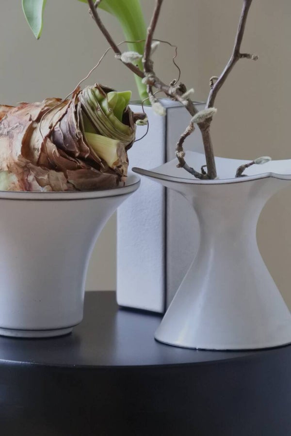 Strak vormgegeven vaasje (welke je ook kunt gebruiken als kandelaar met de juiste kaars) ontworpen door Zweitse Landsheer voor Cor Unum in een zachte creme-witte kleur met espressokleurige details.