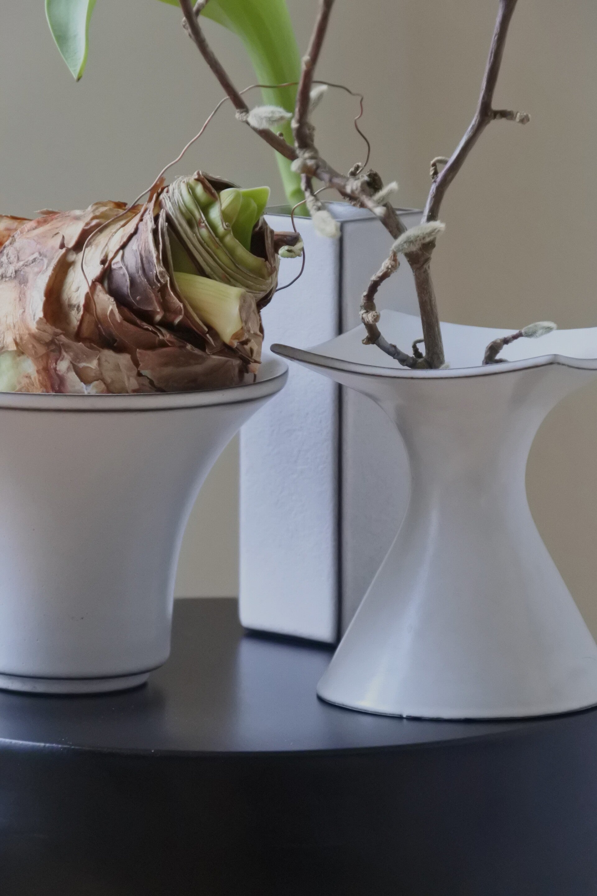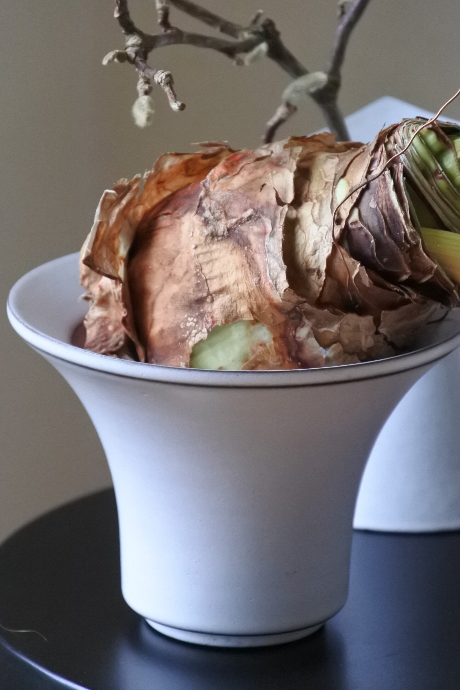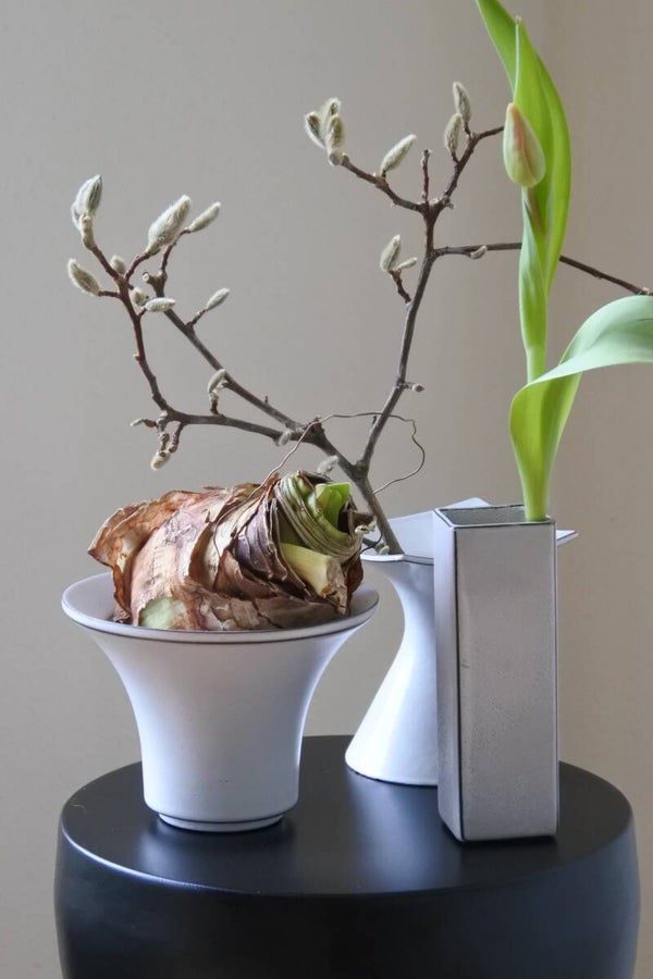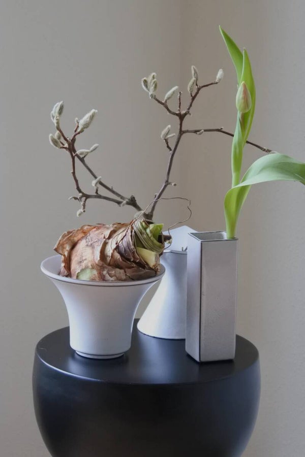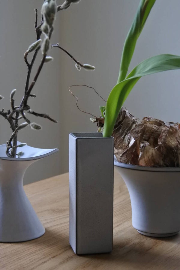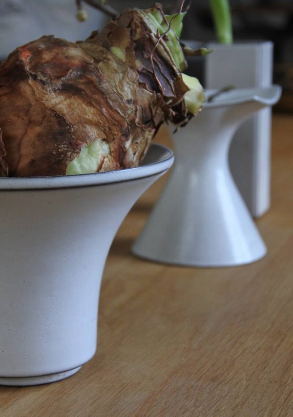 Prachtig bloempotje-vaasje in de stijl van hollandse design meester Cor Unum in een mooie zachte creme-witte kleur met espressokleurige details.