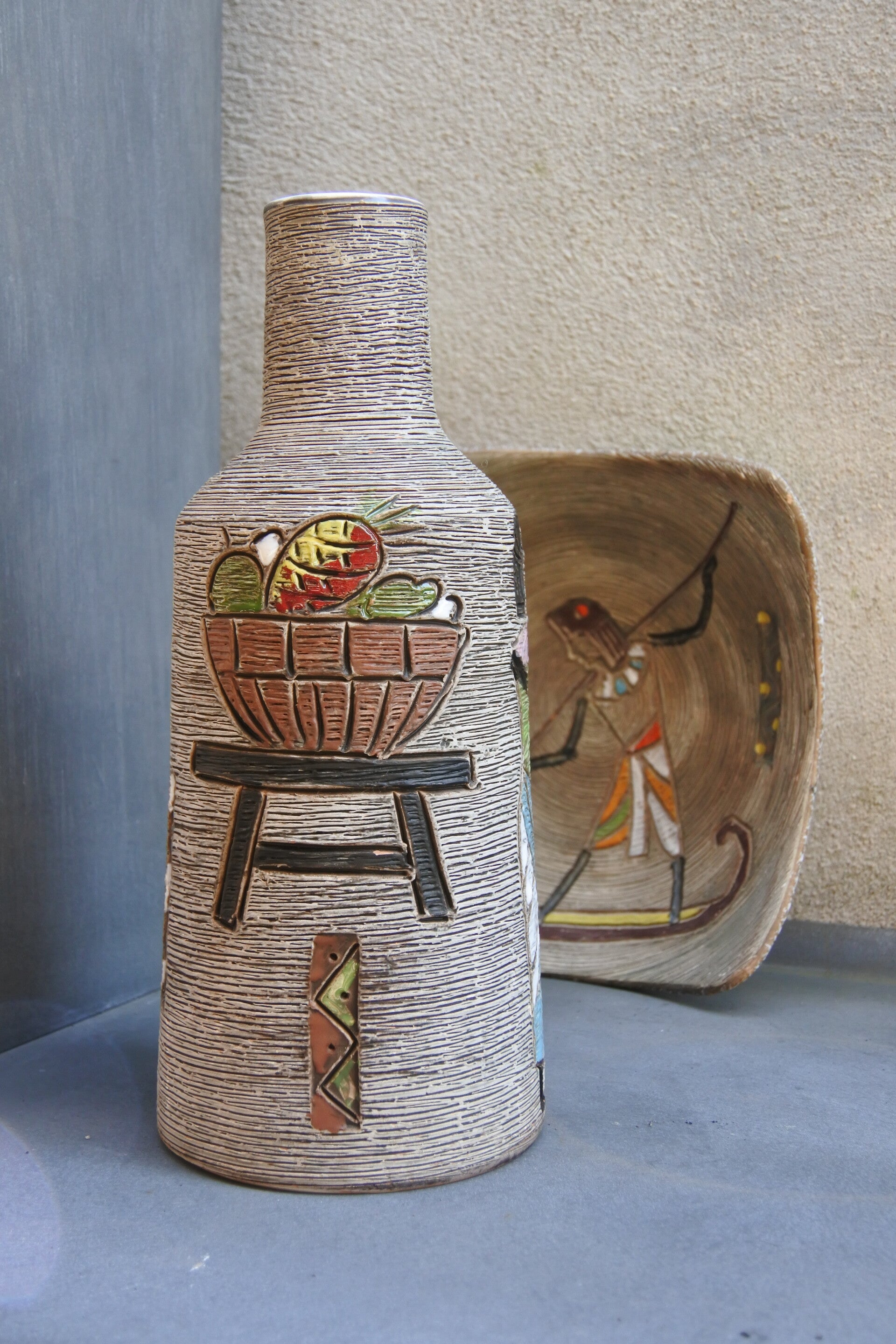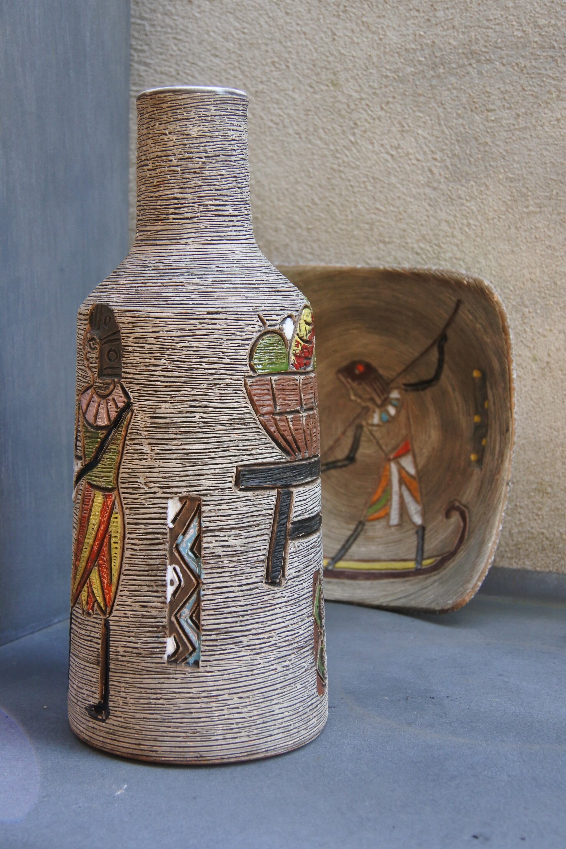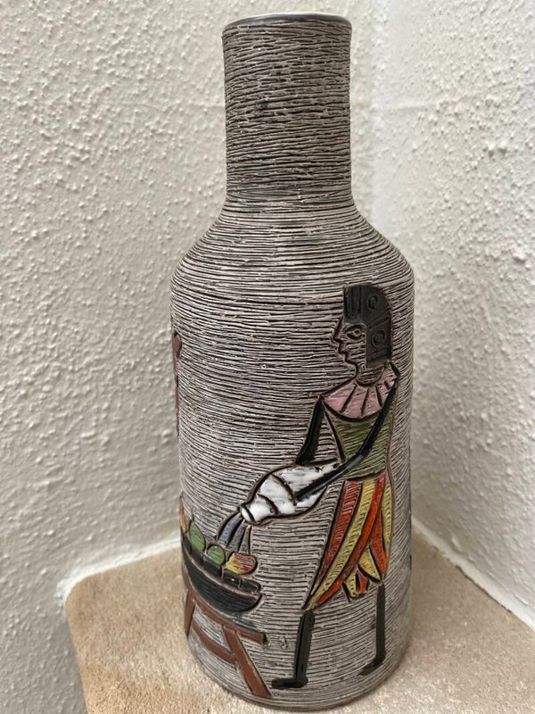 Deze zeldzame vintage Fratelli Fanciullacci jaren 60 vaas heeft een kunstig sgraffito decor met egyptisch thema rondom. Met een Frattelli haal je een echt pareltje met hoog collectors item gehalte voor je (Italiaanse) keramiek verzameling in huis!