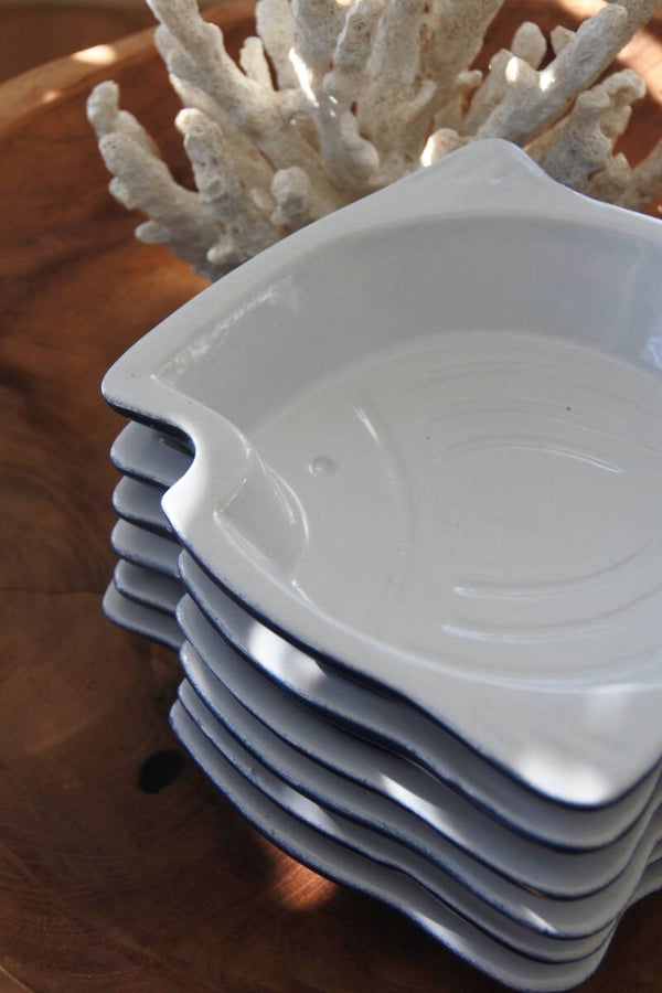Deze super leuke bordjes van blauw keramiek met een fris witte binnenzijde hebben wij meegenomen uit Vive La France om jouw nederlandse vis gerechtje tot een succes te maken! Ze hebben de vorm van een vis zoals je wel ziet ;) en zijn perfect voor het serveren .. iets met vis? lekker hoor!