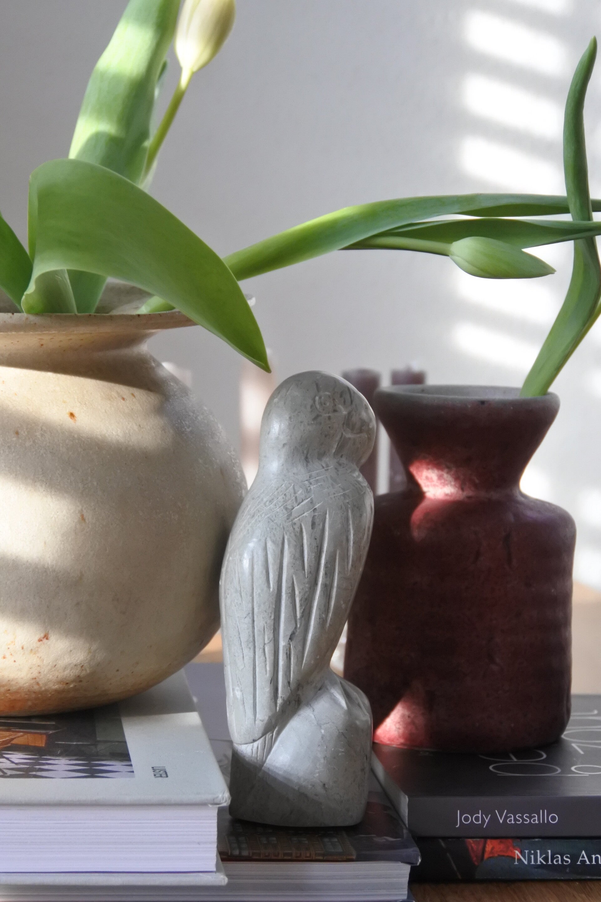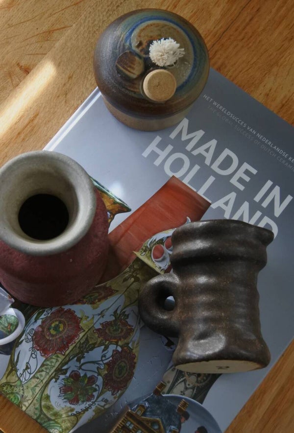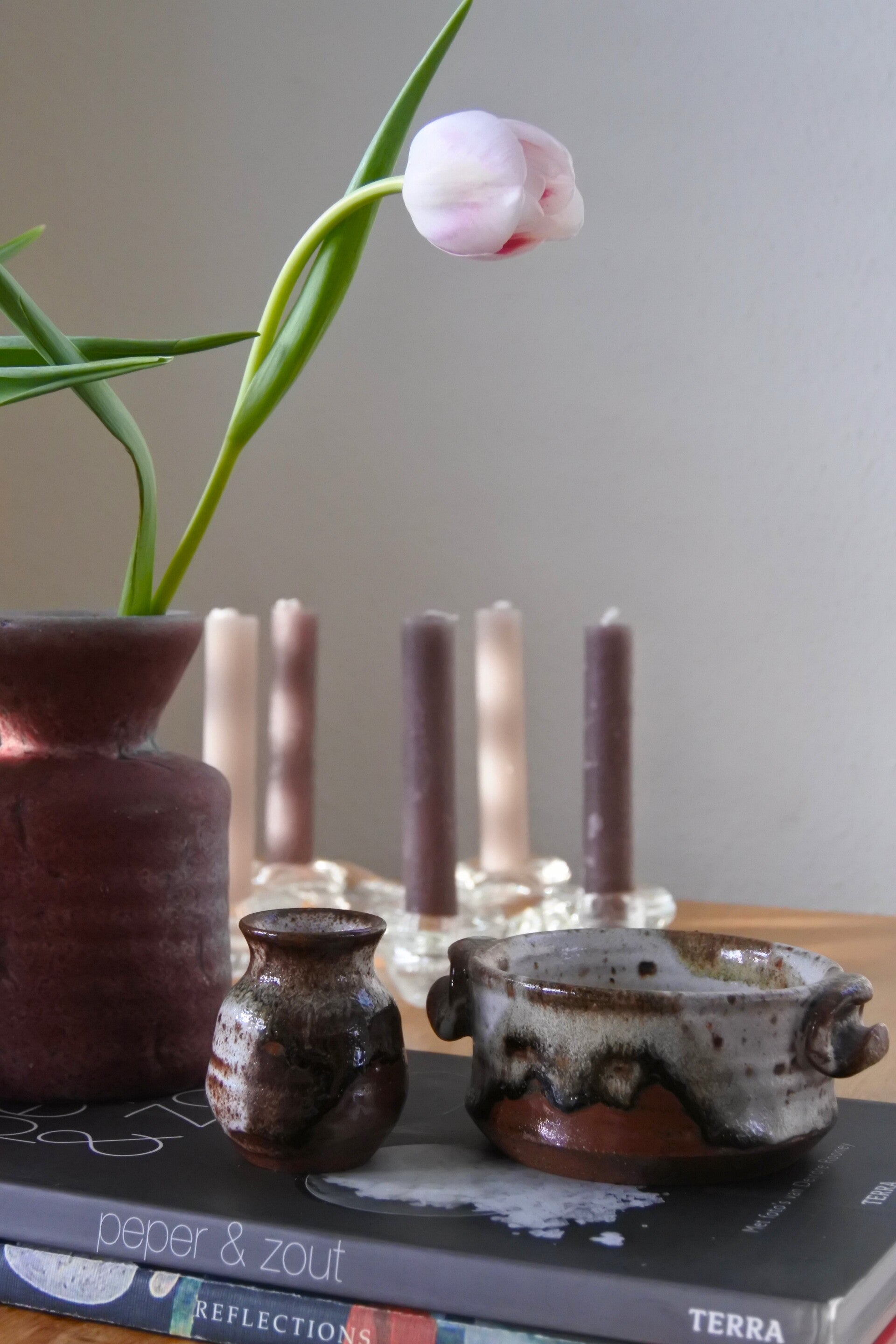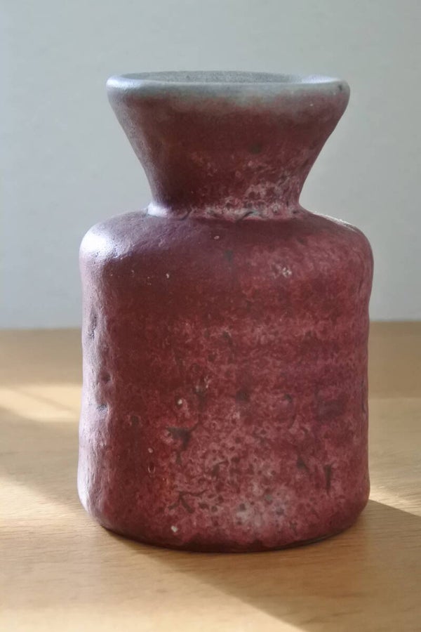 Prachtig vintage steengoed vaasje van rood gestookt glazuur van Mobach Utrecht. Het vaasje draagt aan de onderzijde de stempel van Mobach.