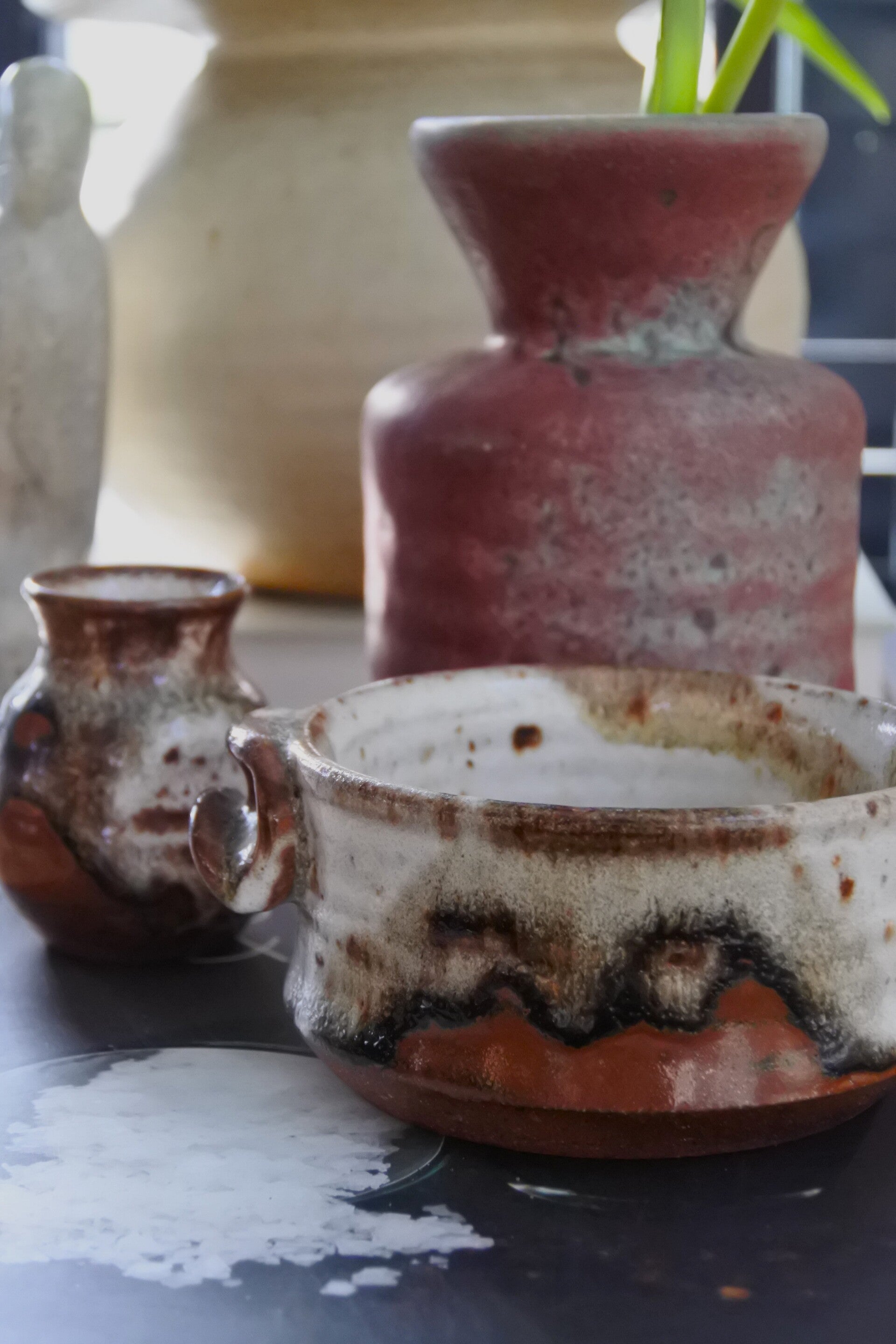 Hele mooie en zeldzame vintage collectors item set ontworpen door Jim & Henny Waldorff in de jaren 70. De stukken uit deze serie hebben een prachtig glazuur in natuurlijke kleuren. De set bestaat uit een schaaltje en een houder voor prikkertjes - of vaasje voor een bloemetje.