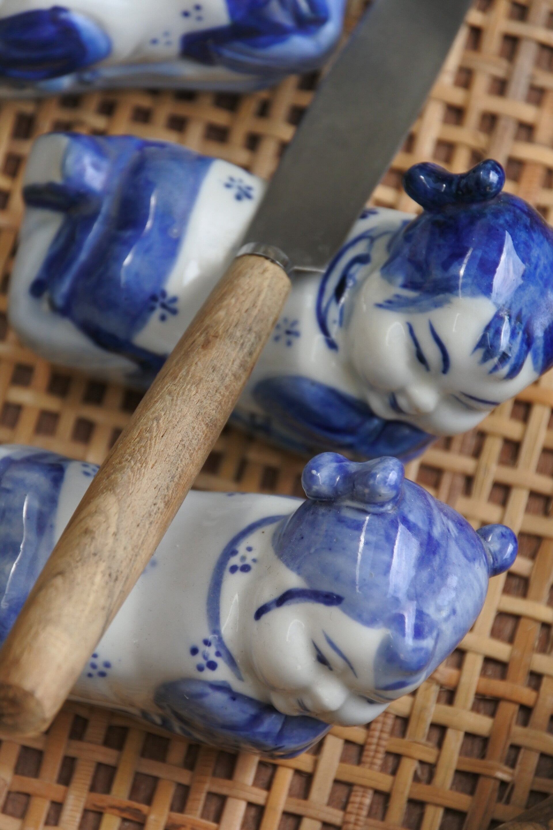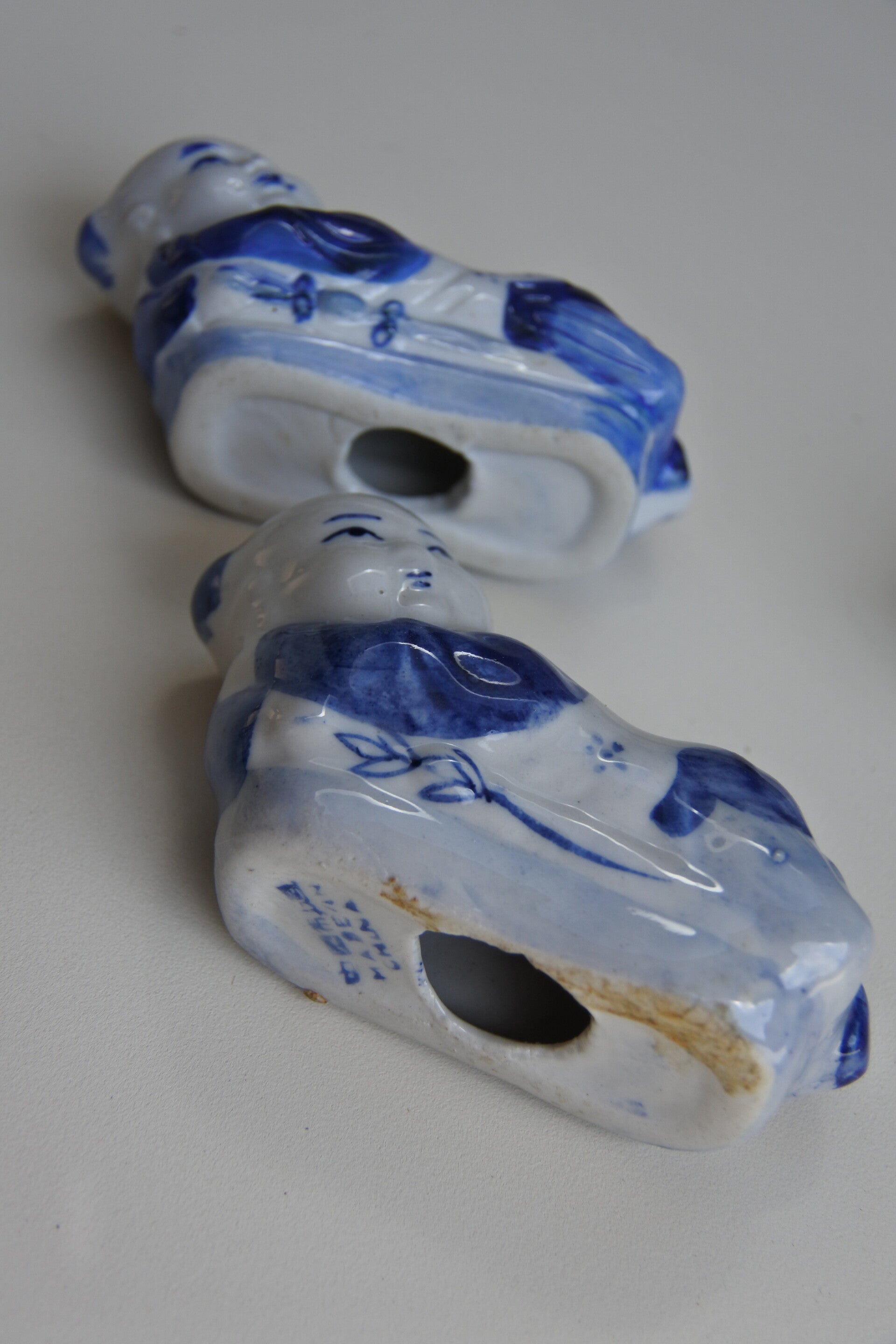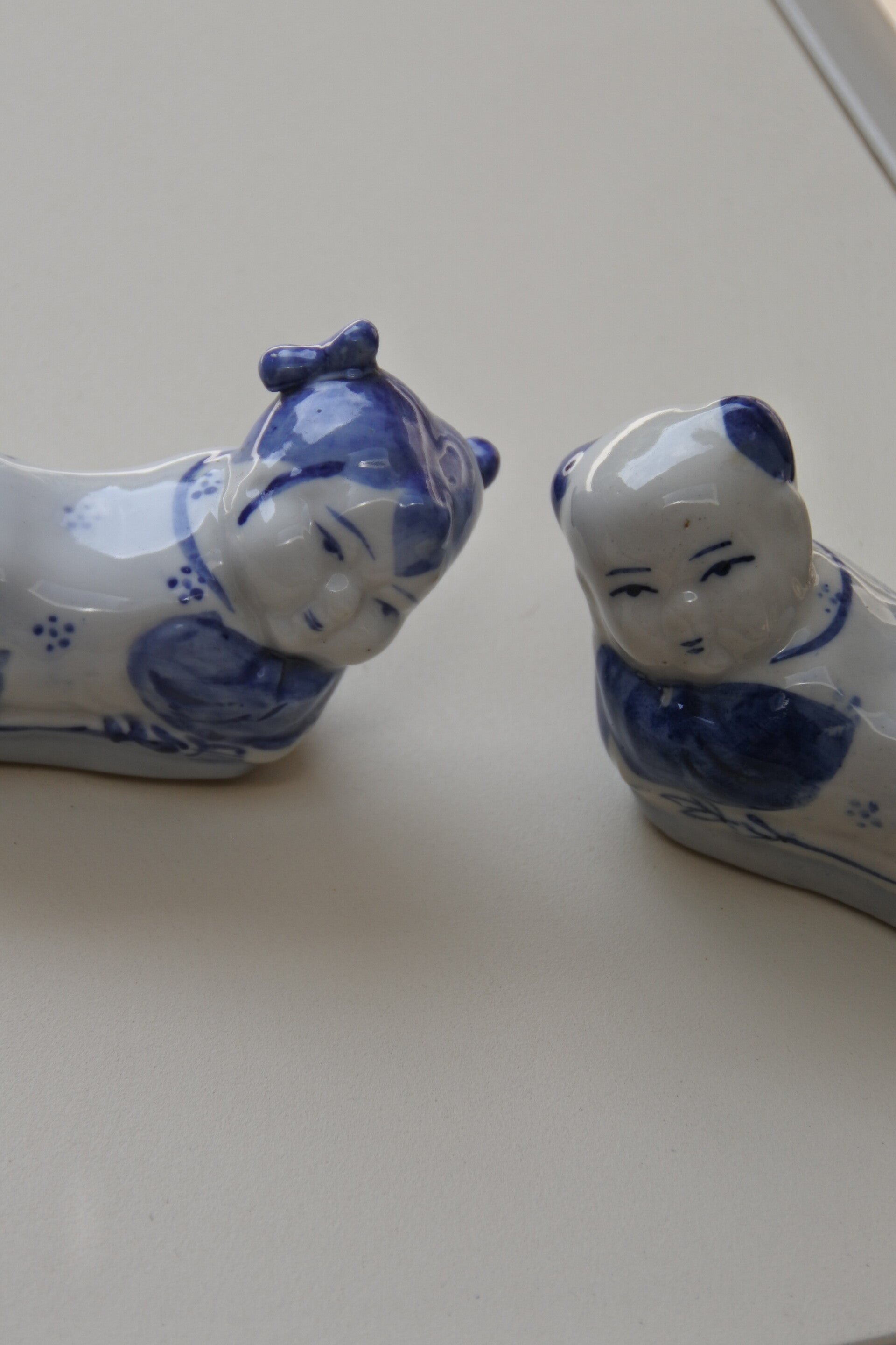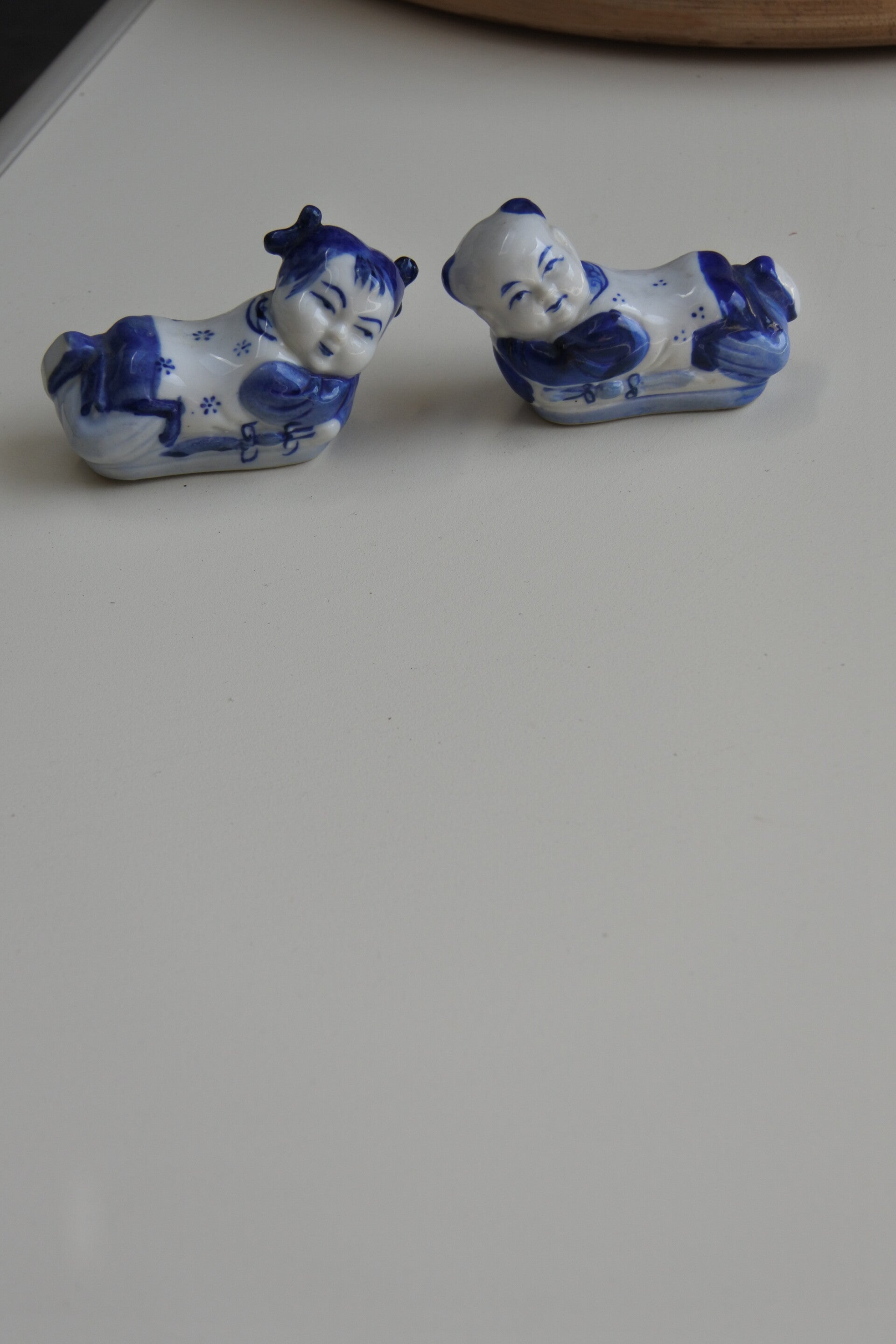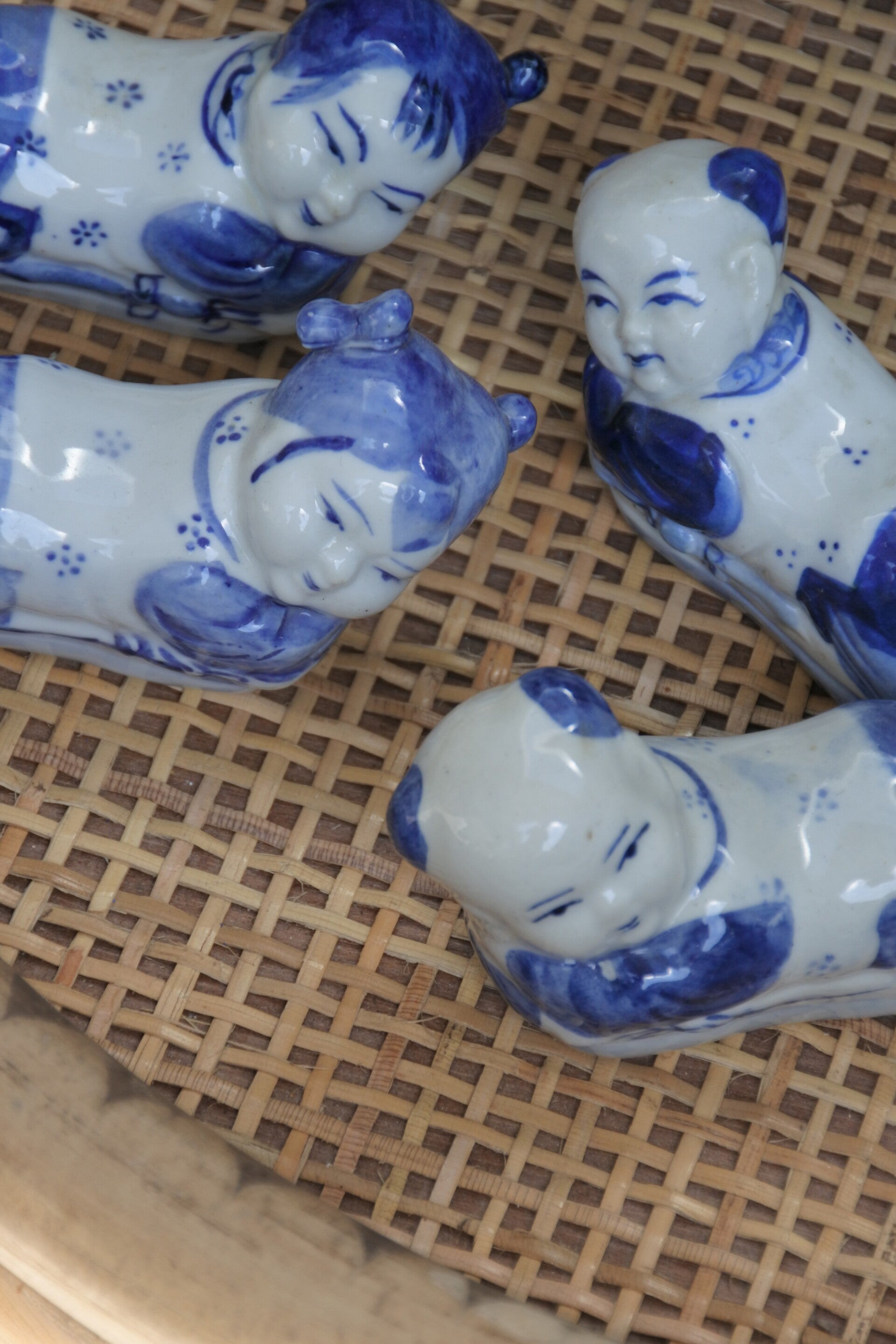 Vintage hand beschilderde Chinese eetstokjeshouders set van porselein in de vorm van een liggend kindje. De prijs is voor de set van 4 stuks dus bel snel je vrienden op en sushi bestellen maar!