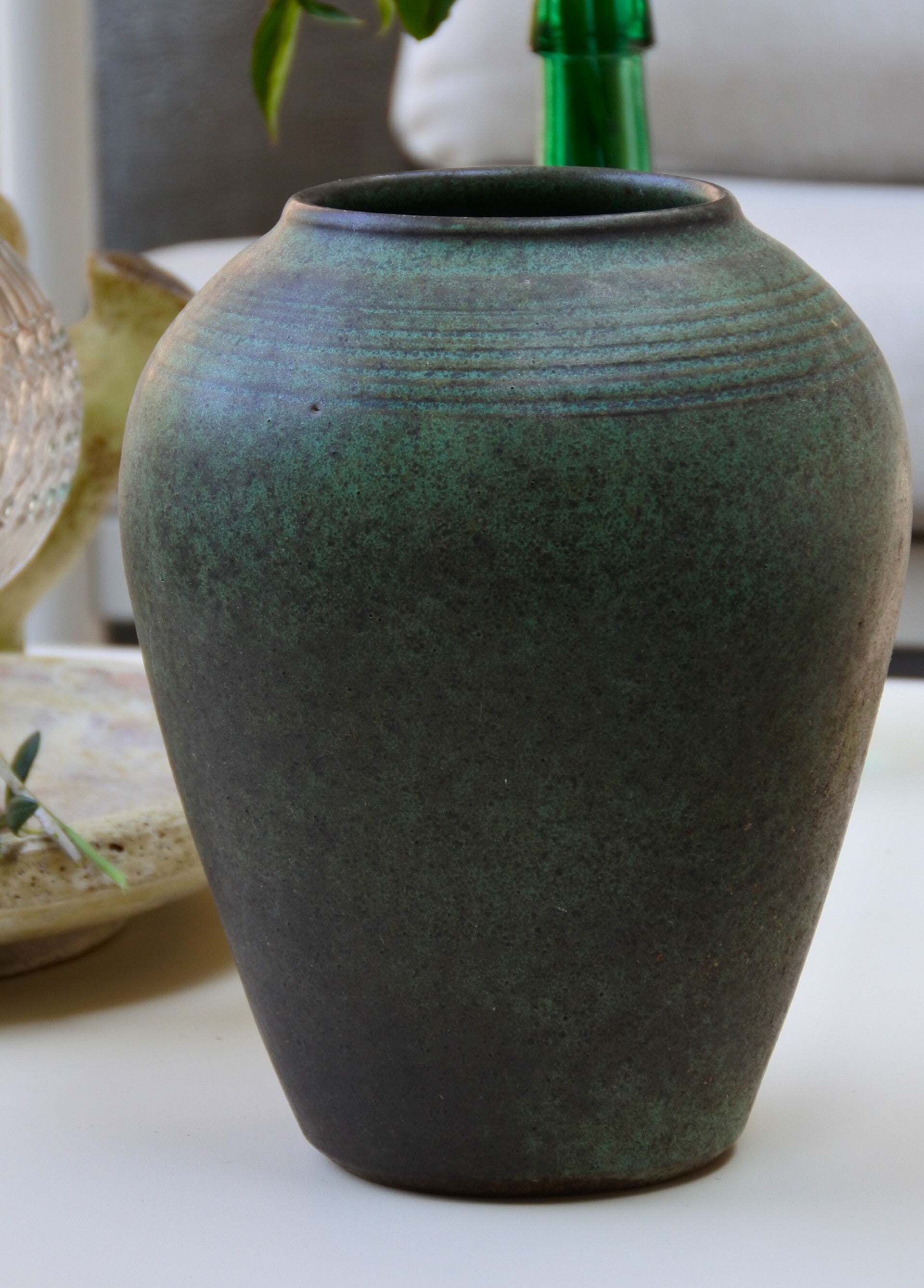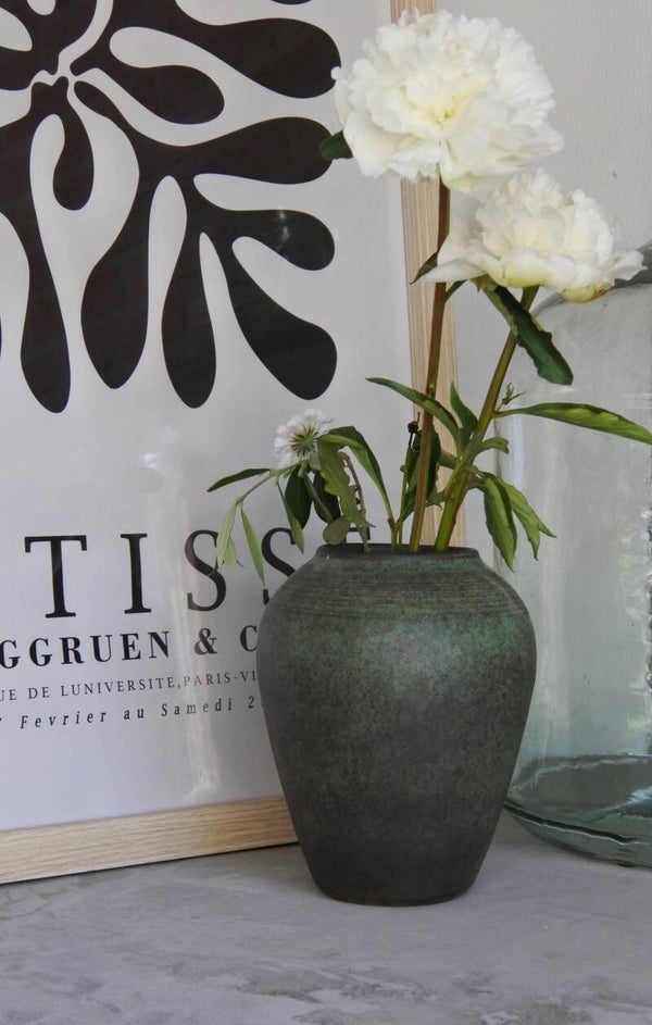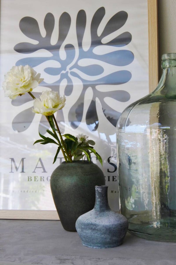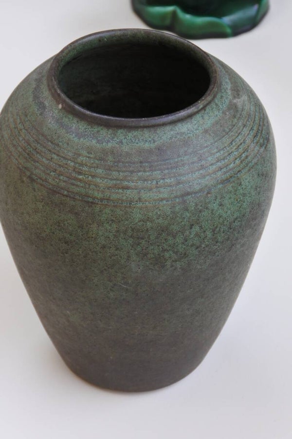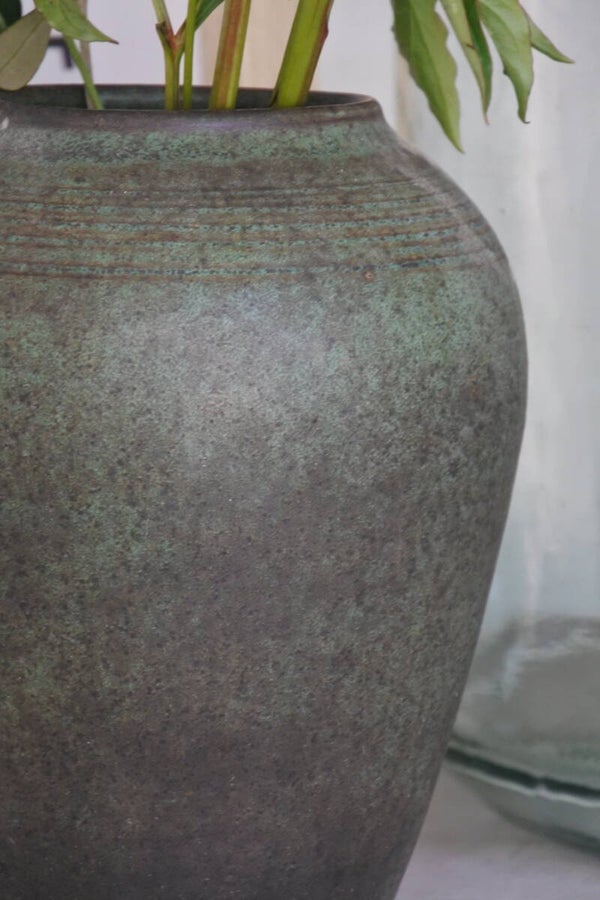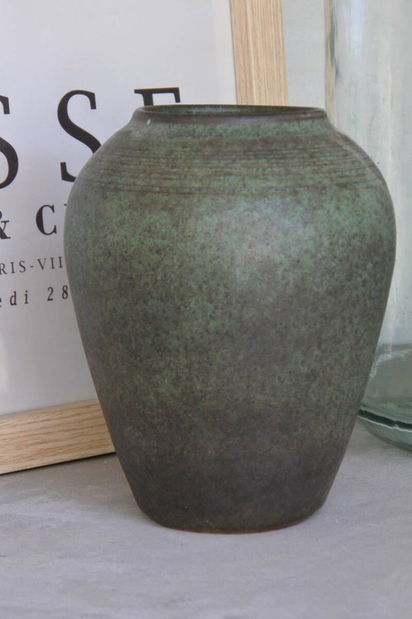 Deze hele maar dan ook echt hele mooie vintage vaas komt vermoedelijk uit de jaren 50. Tenminste.. dat vermoeden we he! want misschien is het zelfs al wel een antieke vaas gezien de techniek en het feit dat dit een zware jongen is. De vaas is gemaakt in de tijdloos mooie kleur smaragd groen met een vleugje grijs en cognac. Wat deze vaas extra bijzonder maakt is dat de groene kleur zich aanpast aan het licht als ware waardoor deze vaas telkens een andere tint groen lijkt aan te nemen.