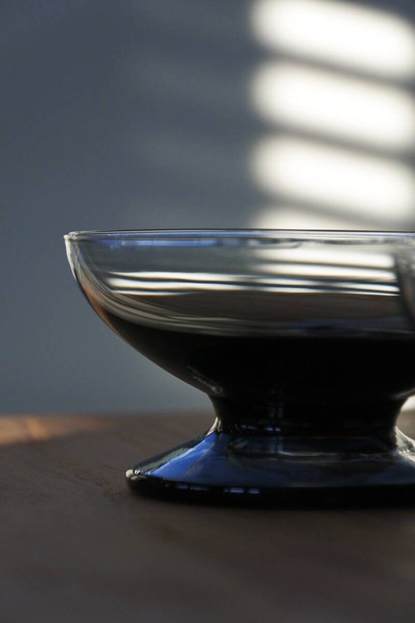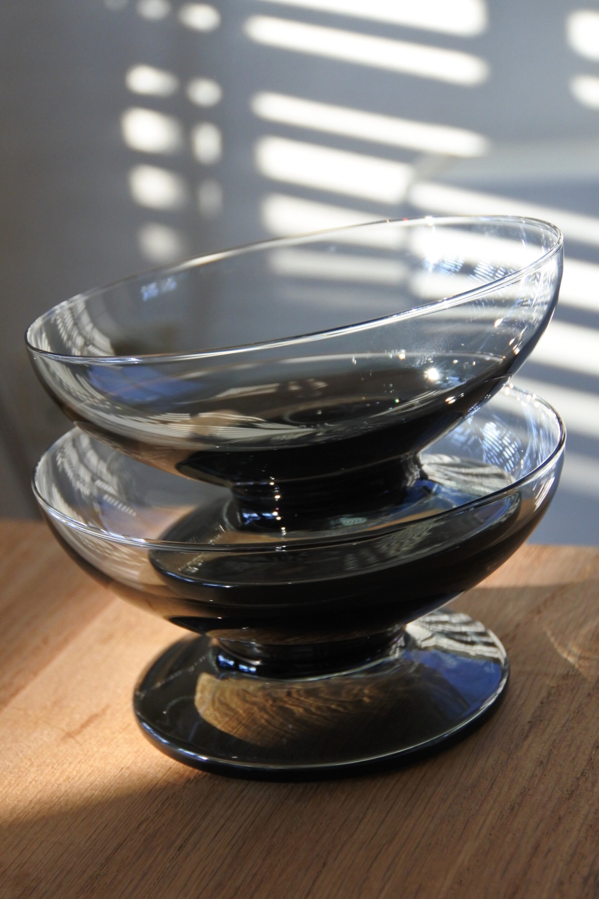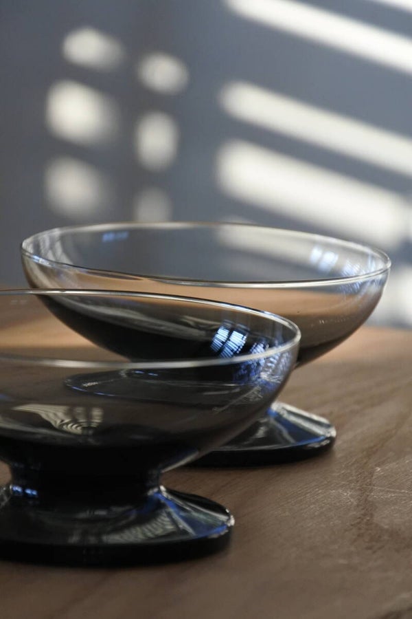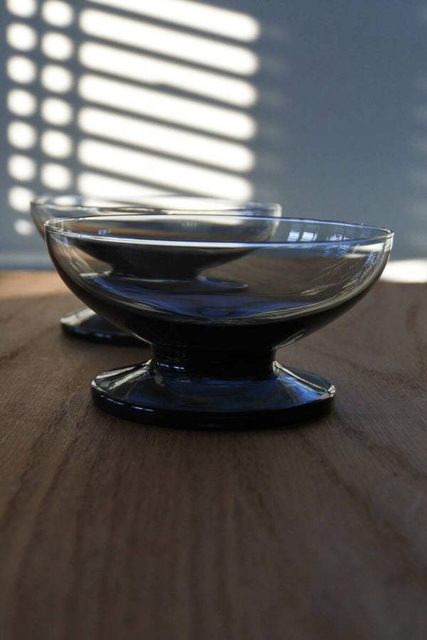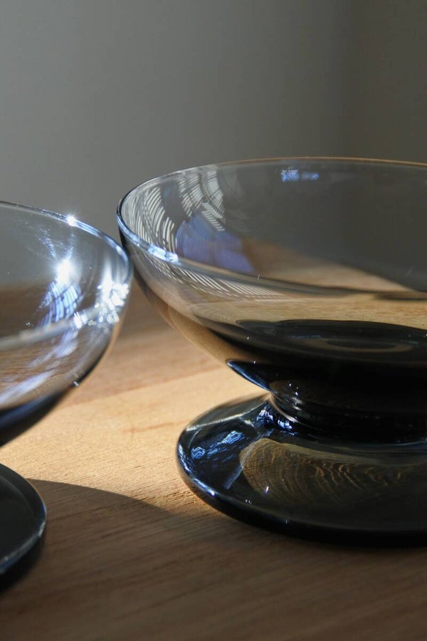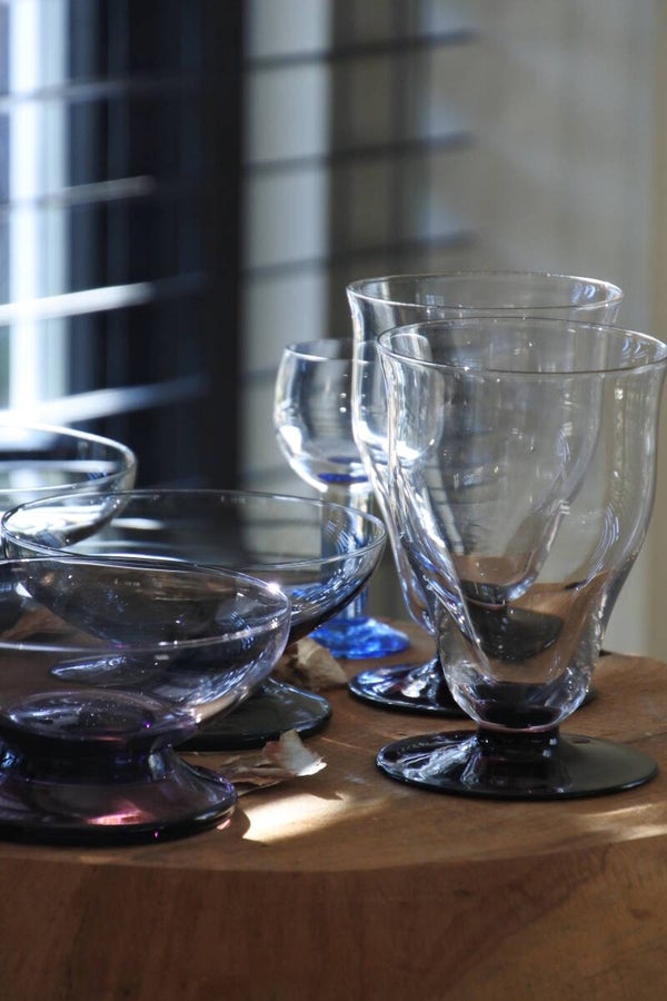 Set van 12 carnaval coupeglazen van Kristalunie Maastricht. De foto laat een set van 7 glazen zien, maar de set bestaat uit 3 blauwe, 3 cognac kleurige, 2 smoke, 2 lichtgroene en 2 donkergroene glazen. De coupes hebben een klein formaat omdat ze oorspronkelijk zijn ontworpen voor punch of bowl, maar ze zijn nu heel leuk te gebruiken als kleine tapas-, amuse- of dessertglazen.