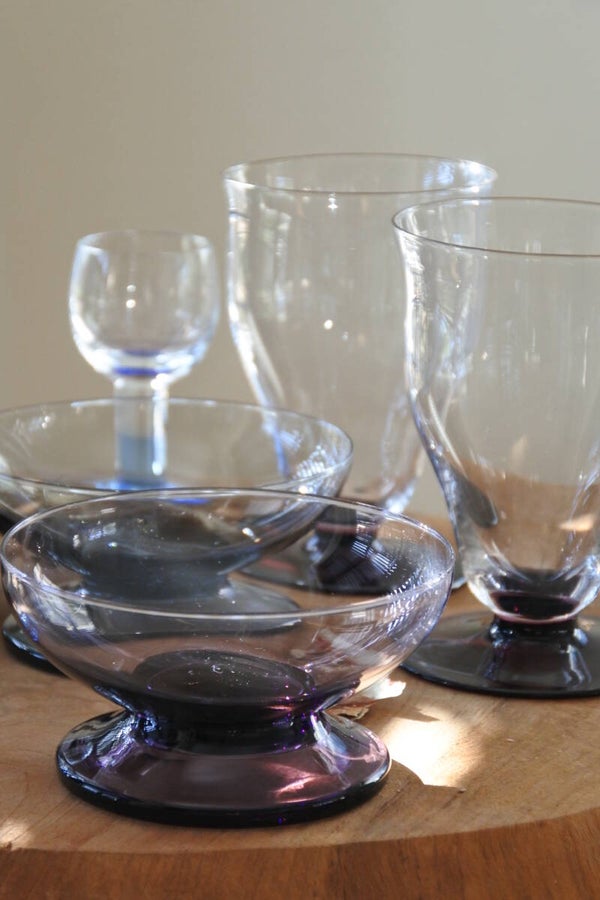 Prachtige en zeldzame antieke set art deco glaasjes ontworpen door Max Verboeket voor de KristalUnie Maastricht coups in paars glas.