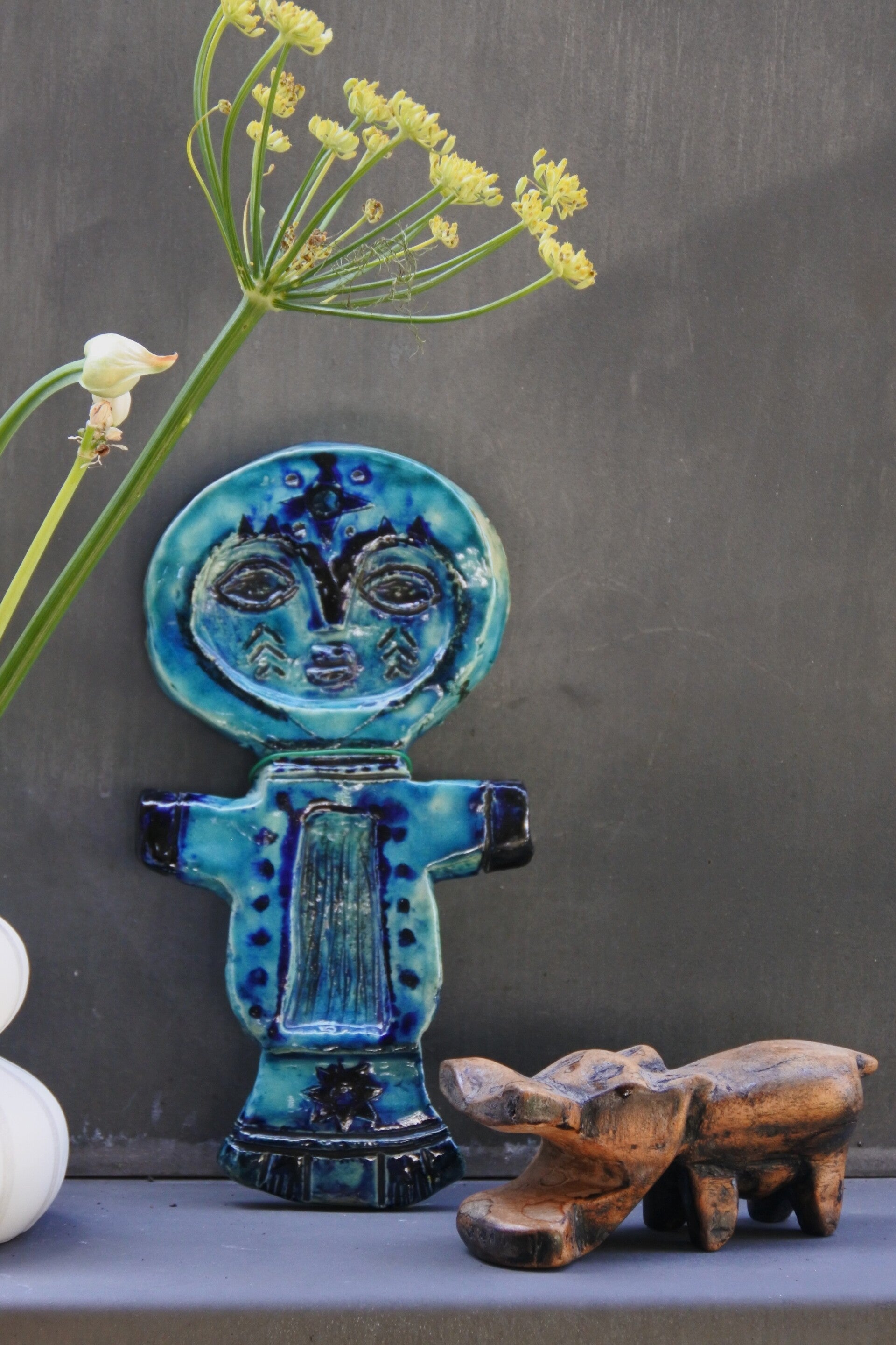 We liepen op een markt en schrokken ons rot. Een Bitossi! tot we dichterbij kwamen natuurlijk want helaas was het niet zo'n geluksdag. De stijl van dit handgebakken wandplaatje heeft echter wel die kenmerkende bitossi (blauwe) kleur en het speelse design wat zo ontzettend geliefd is. Conclusie; hij was toch echt te leuk om te laten liggen.