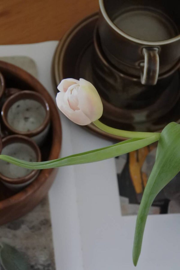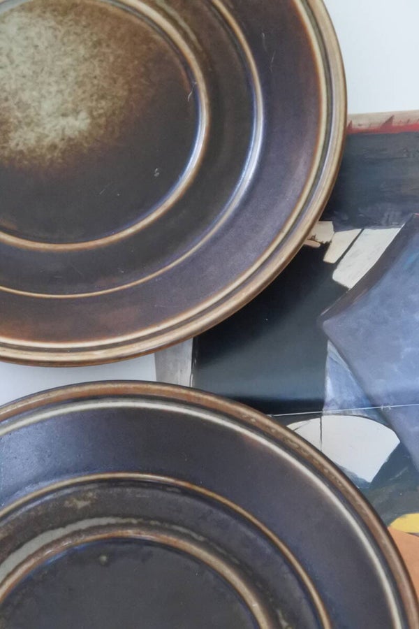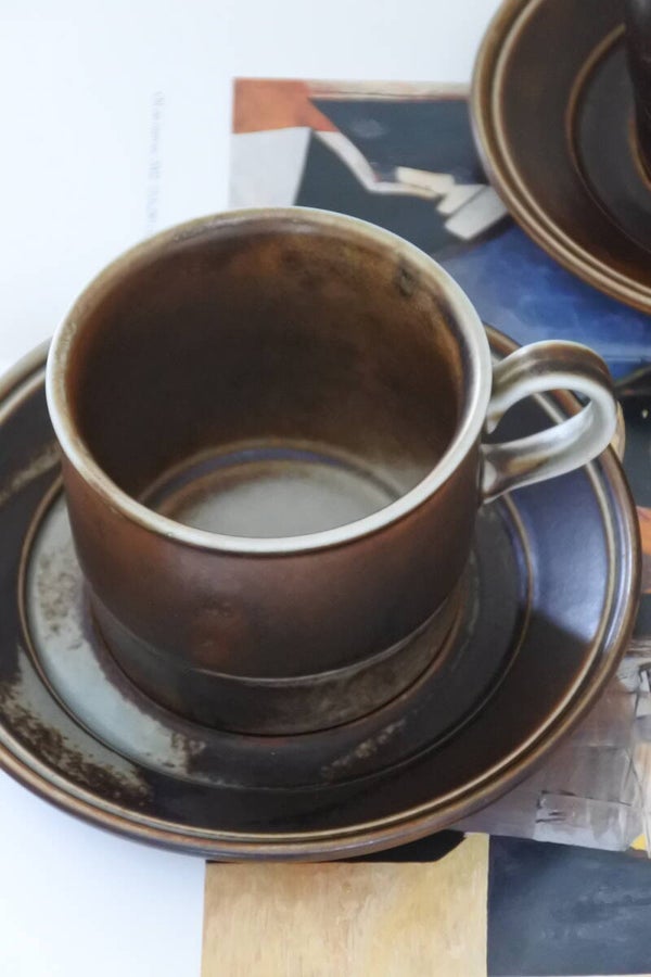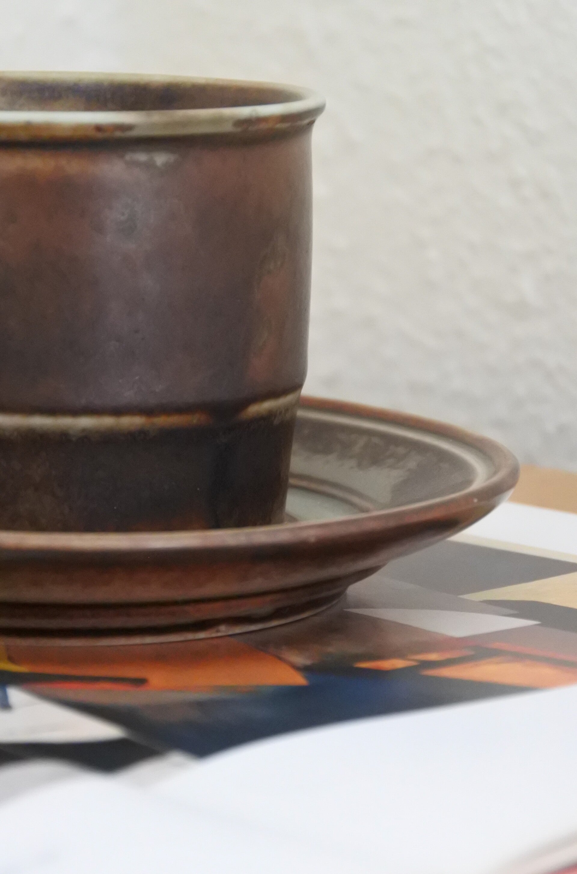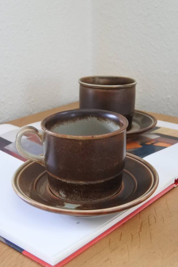 Deze vintage steengoed koppen met schotel in aardetinten is ontworpen door Eystein Sandnes voor Porsgrund Noorwegen, de Lava-serie.