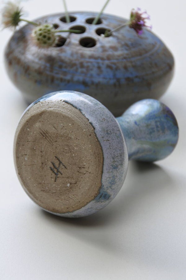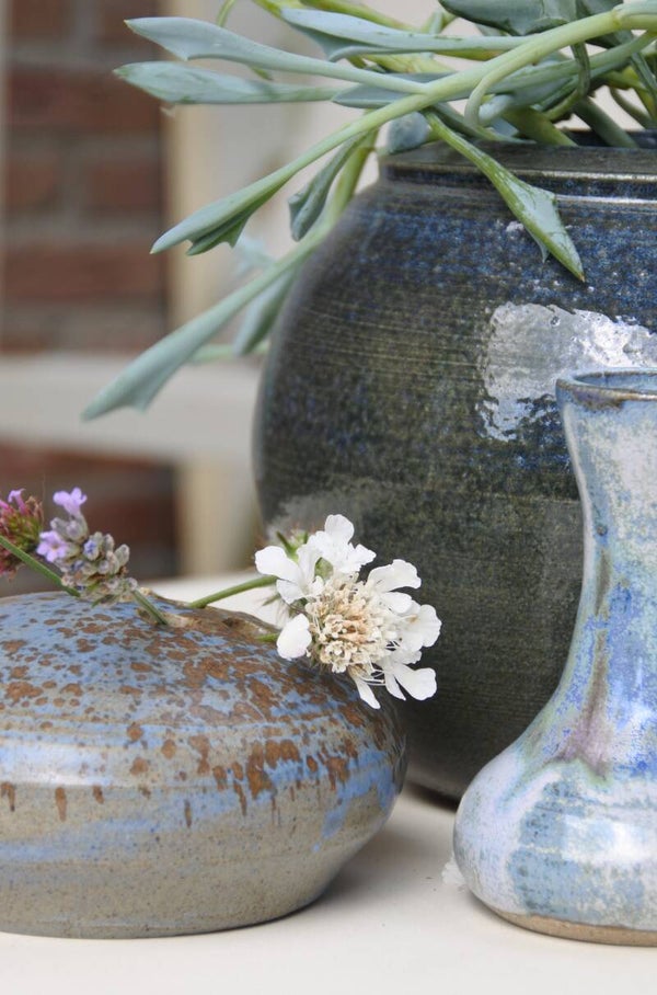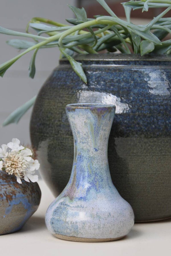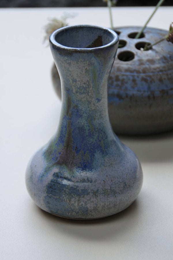 Mooie vintage pottenbakkers vaasje met smal halsje in lichtblauw met prachtig kleurverloop in groen en grijs rondom. Het vaasje is aan de onderzijde gesigneerd maar de maker hebben we nog niet kunnen achterhalen helaas.