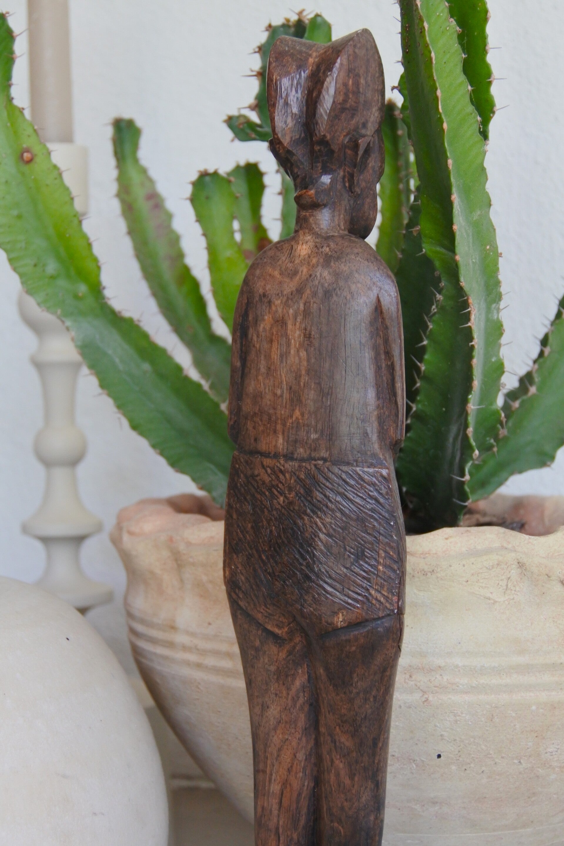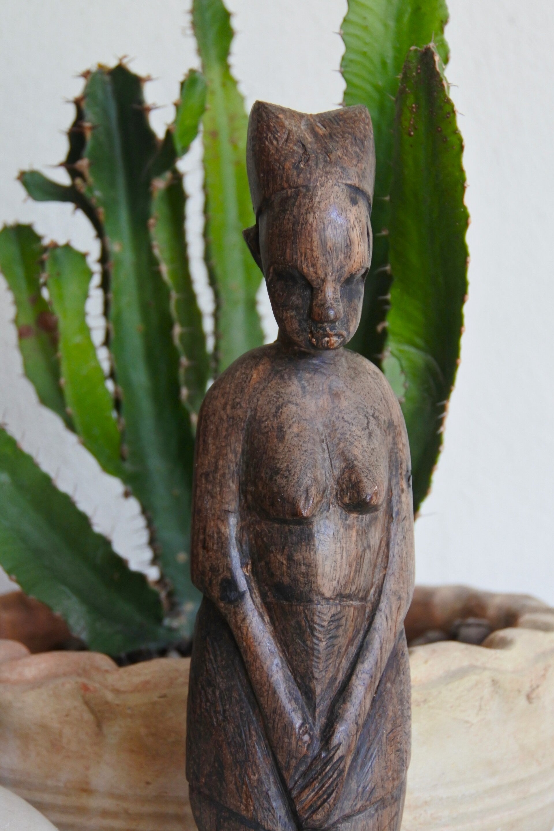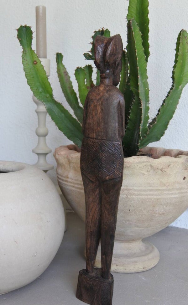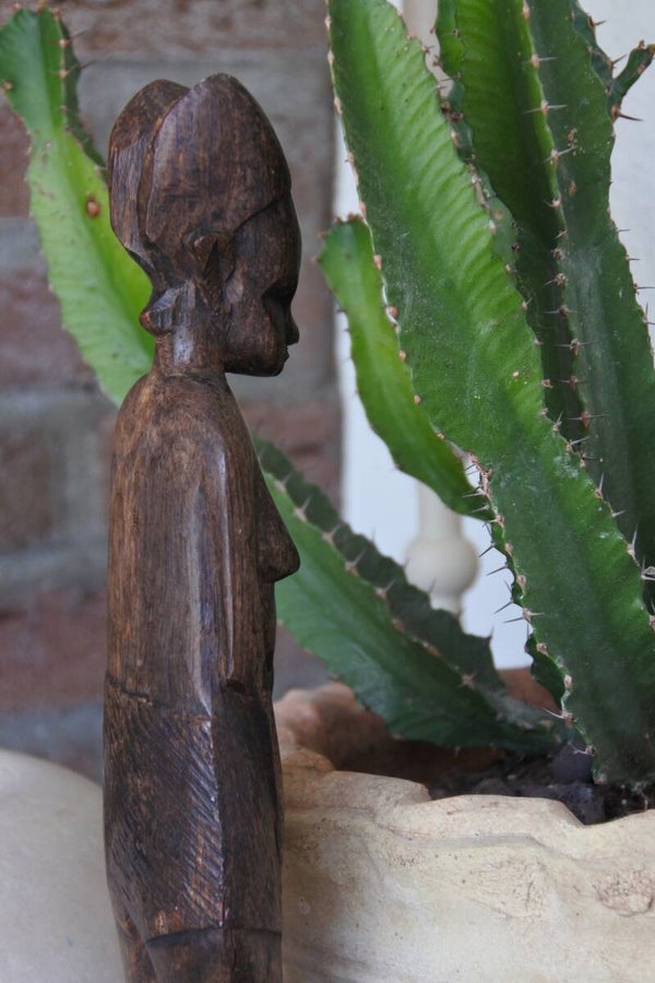 Dit mooie beeldje is prachtig handgesneden uit 1 stuk en beeld een prachtige sierlijke afrikaanse dame uit met aan de achterzijde.. een ontzettend plat kuntske. Oftewel billen. Kijk, dat in combinatie met haar iets knorrige blik vonden wij persoonlijk ontzettend leuk, iets met herkenning gokken we. Dit beeldje heeft zoveel mooie en fijne details, daar raak je nooit op uitgekeken!