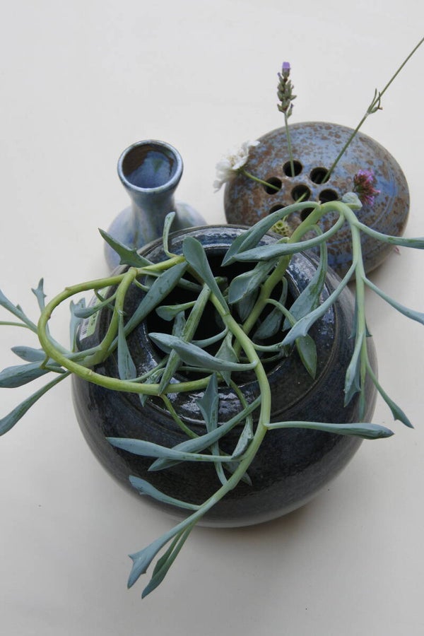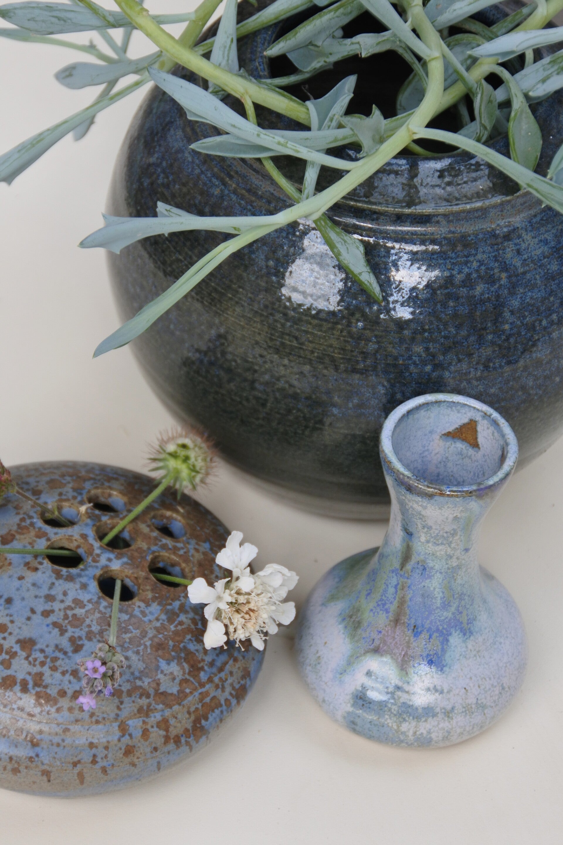 Vintage pottenbakkers bloempotje van blauw en groen steengoed
