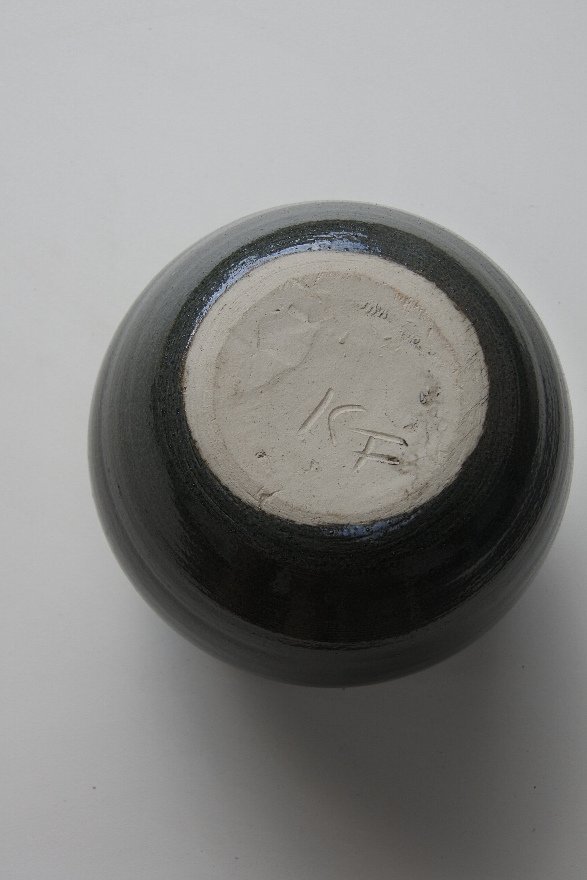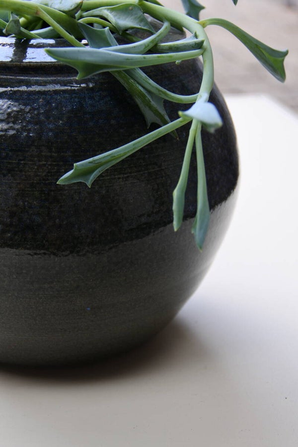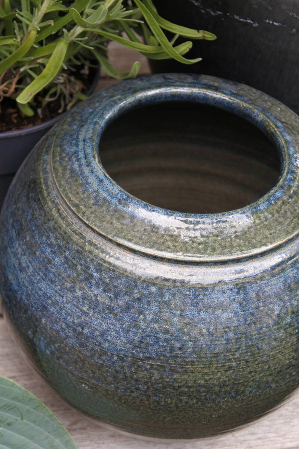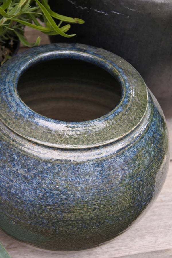 Stoere en robuuste vintage aardewerk pottenbakkers bloempot met blauw glazuur en signering aan onderzijde.