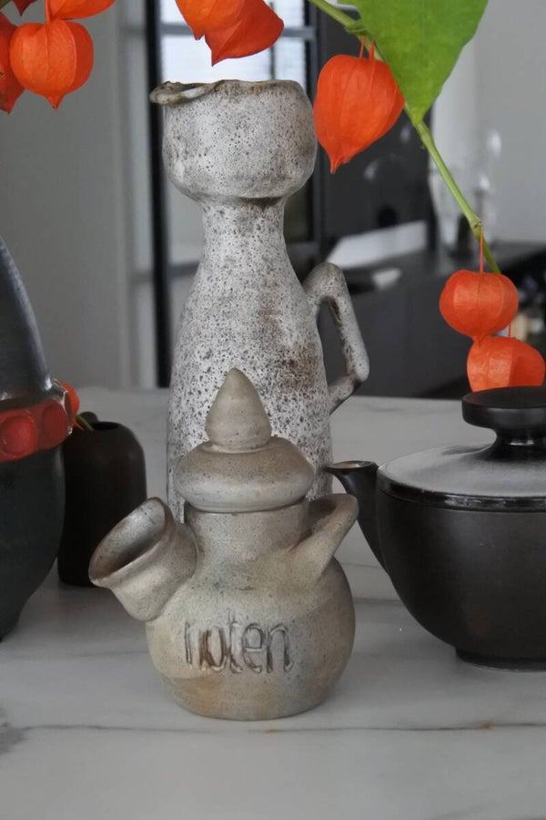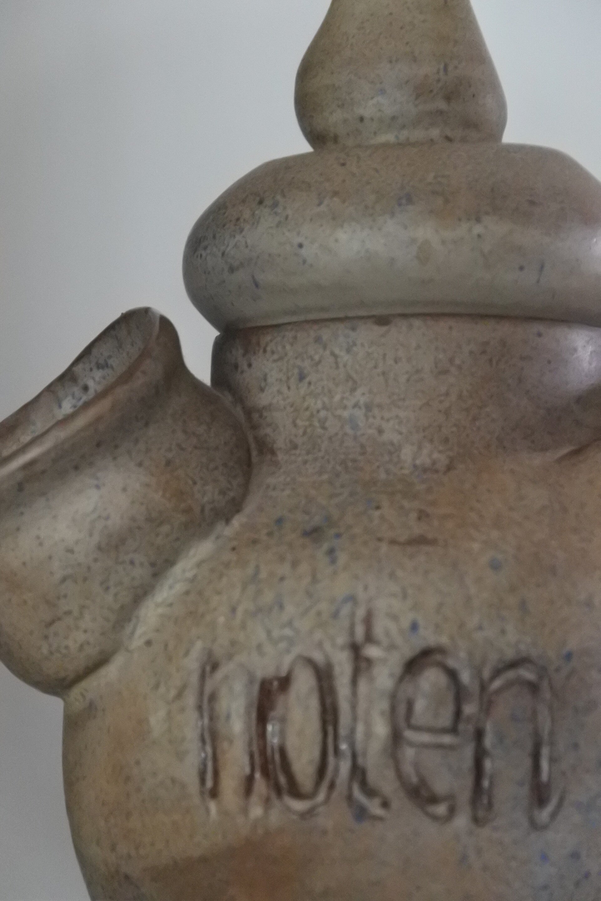 Vintage lichtbruin/beige schenkkan van steen met opschrift noten.