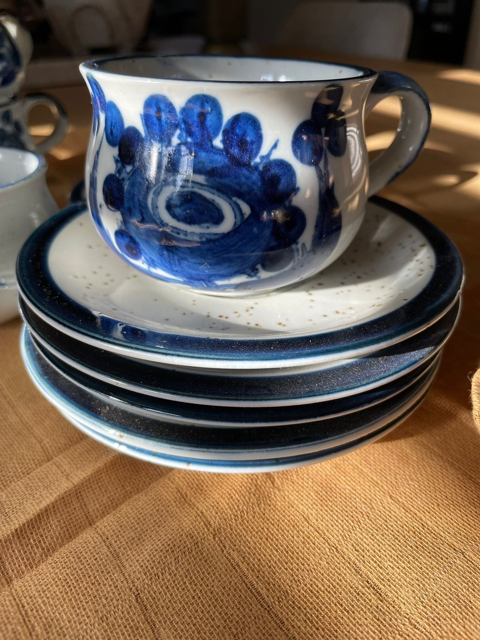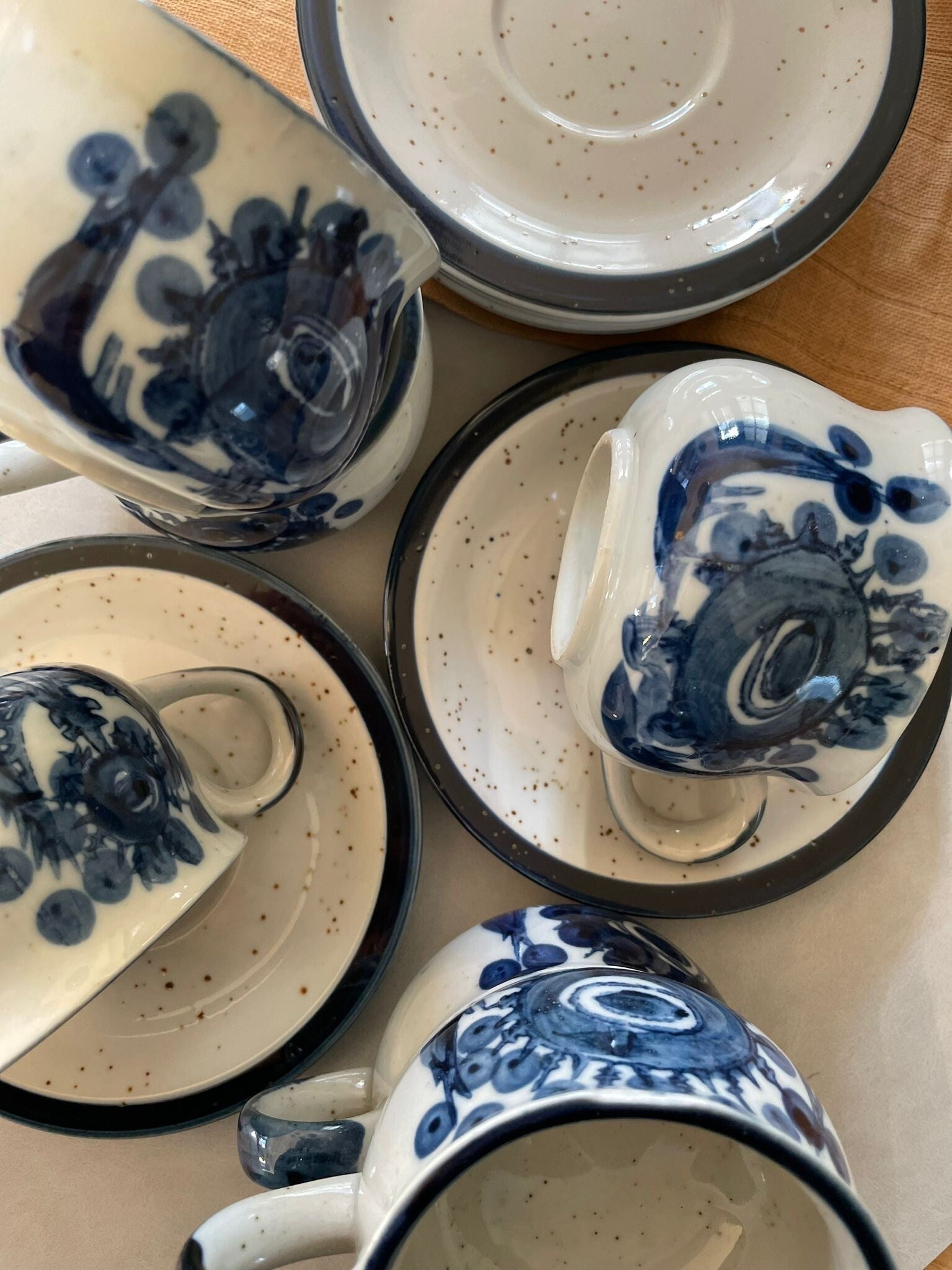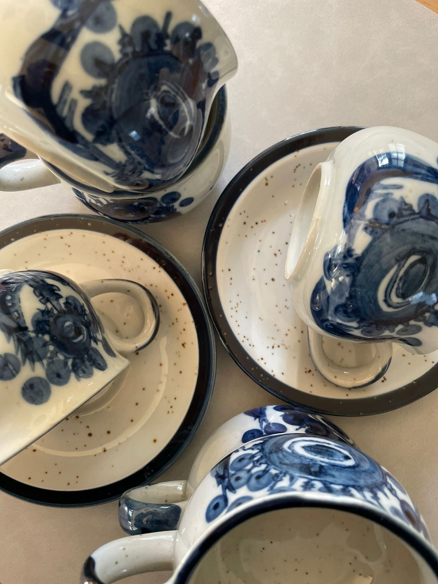 Over dit design valt een hoop te zeggen! Zo zijn er veel Japanse serviesgoed stukken gemaakt met dit patroon. Dan zijn er nog de Nova Blue Steinzeug Oostenrijk stukken. En dan (saving the best for last natuurlijk) het serviesgoed gemaakt door Arabia Finland voor Domus. Deze mooie 6-Delige set kop en schotels hebben als ondergrond een zachtgrijs gekleurd glazuur en een decor in donkerblauw.
