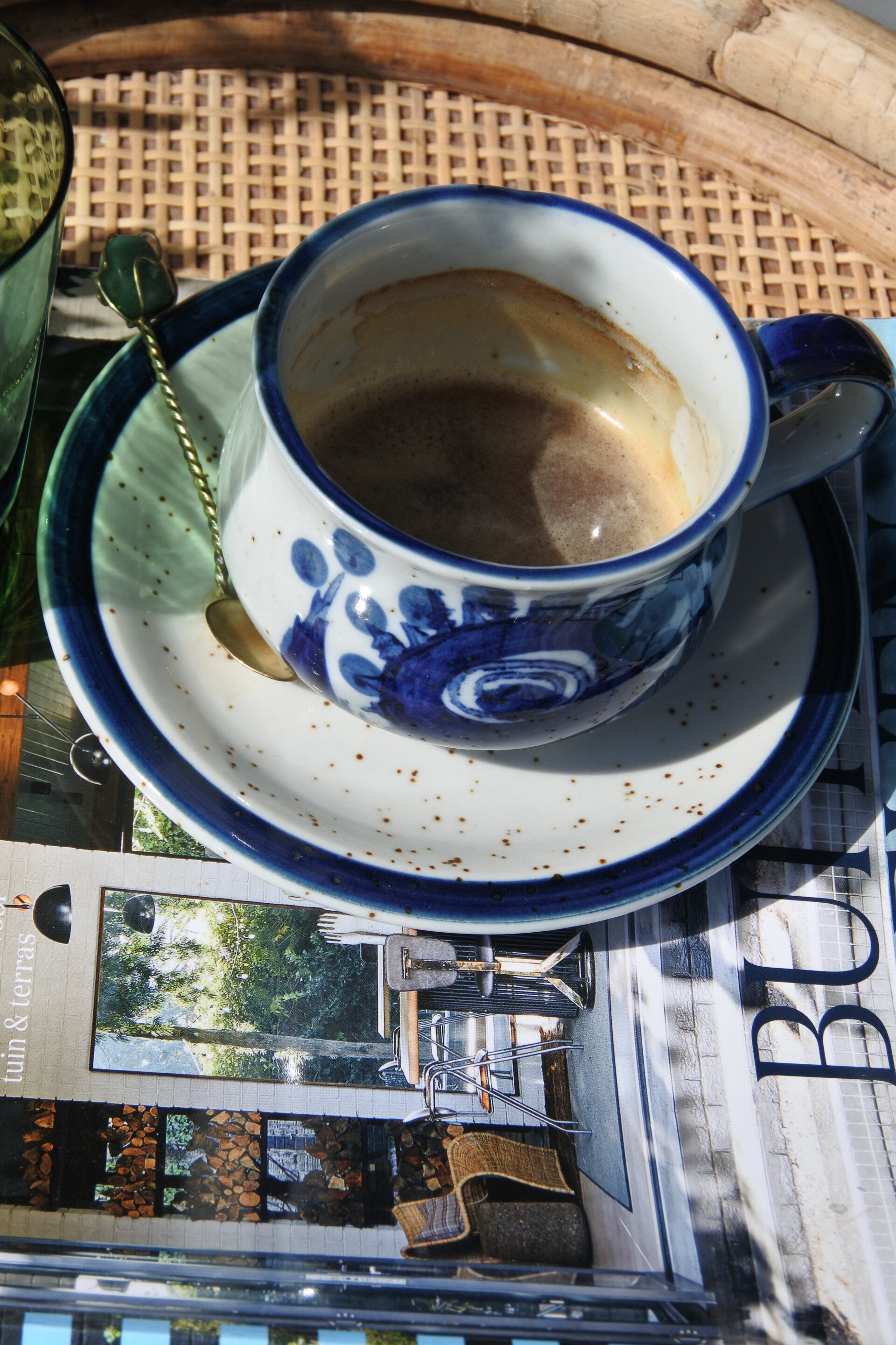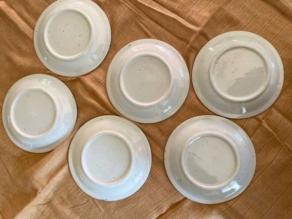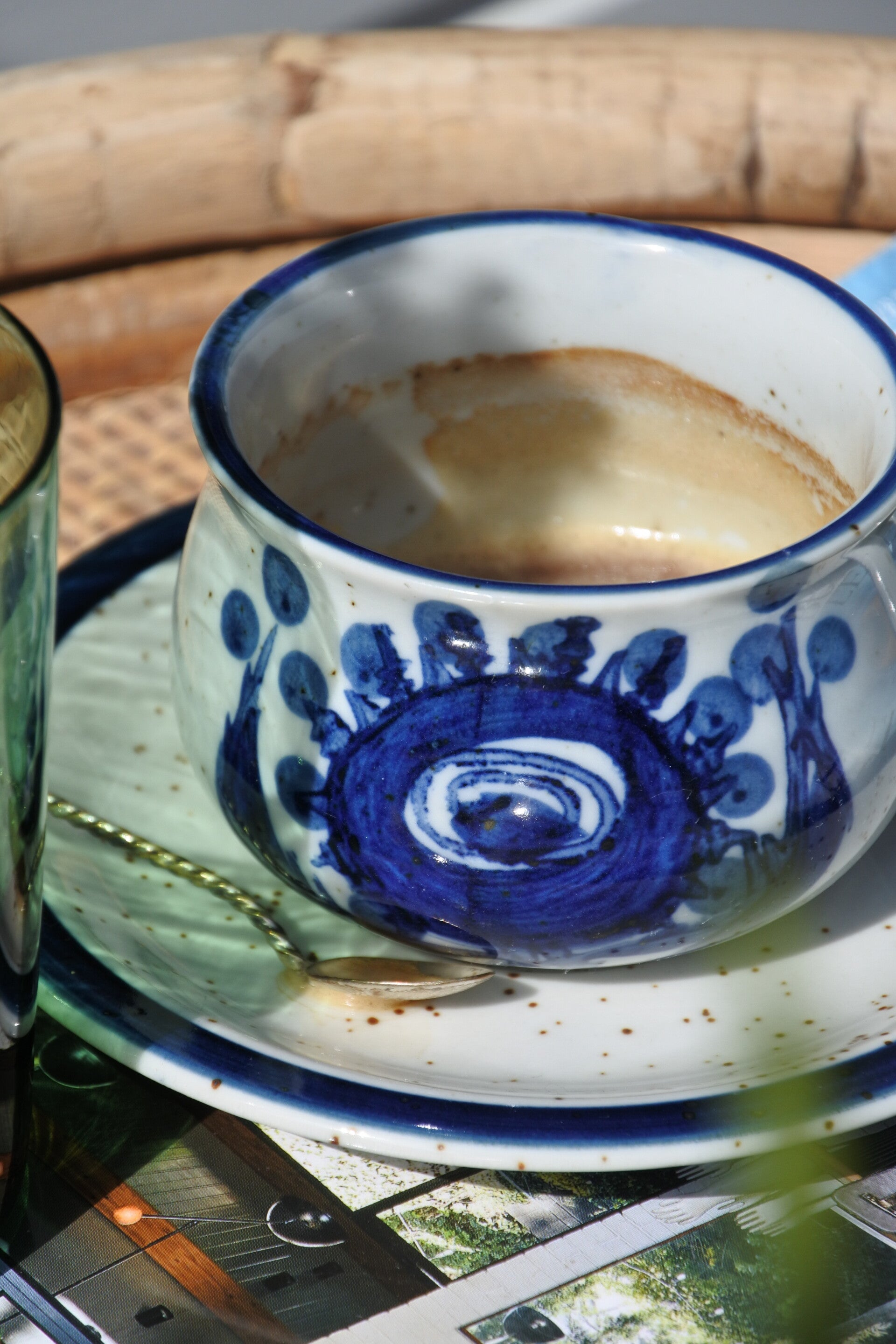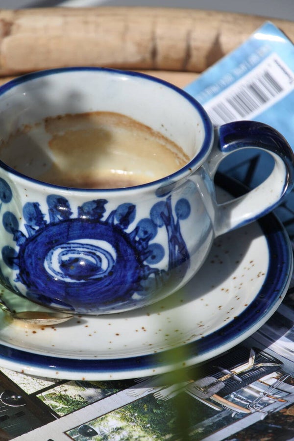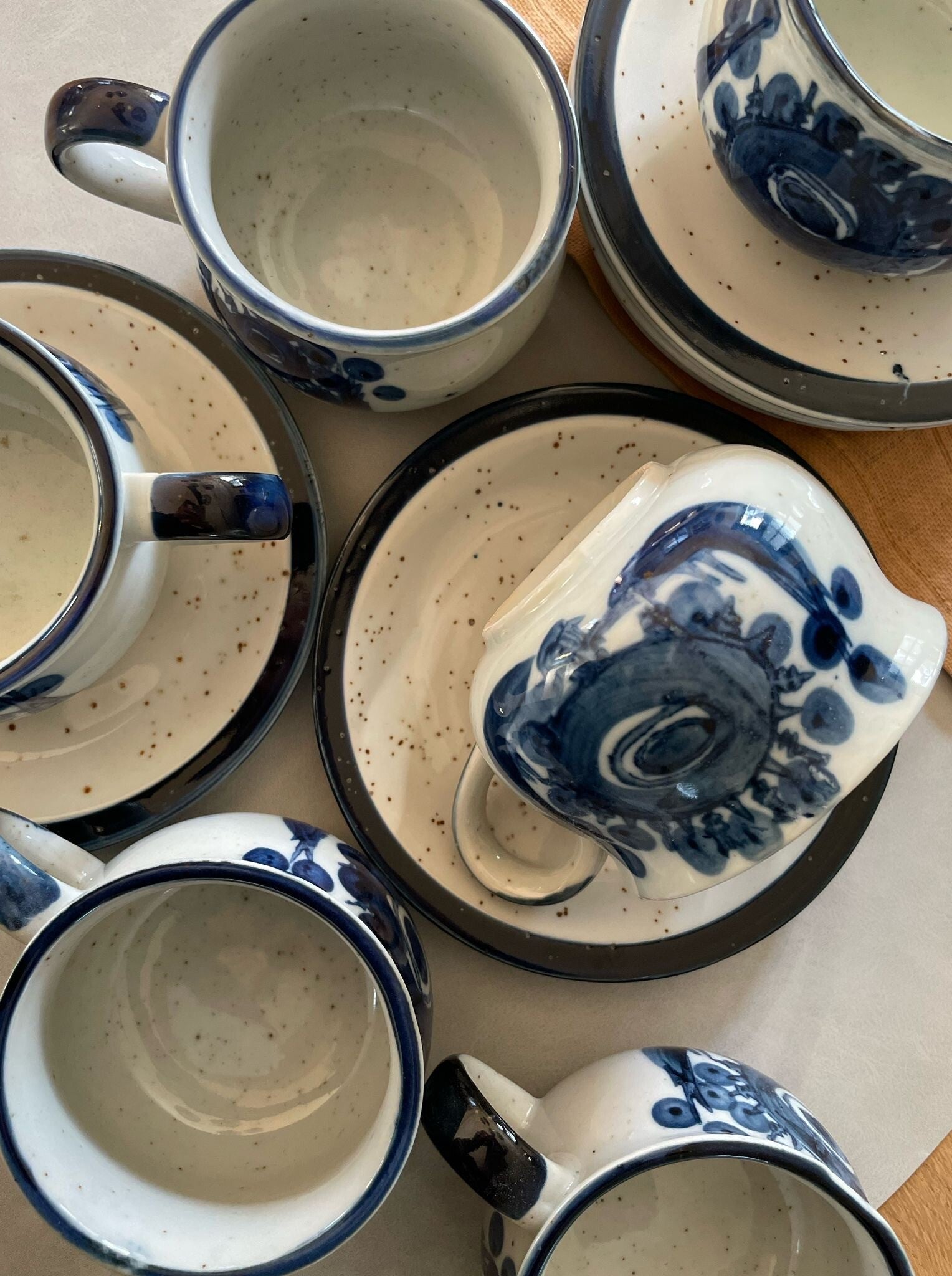 Over dit design valt een hoop te zeggen! Zo zijn er veel Japanse serviesgoed stukken gemaakt met dit patroon. Dan zijn er nog de Nova Blue Steinzeug Oostenrijk stukken. En dan (saving the best for last natuurlijk) het serviesgoed gemaakt door Arabia Finland voor Domus. Deze mooie 6-Delige set kop en schotels hebben als ondergrond een zachtgrijs gekleurd glazuur en een decor in donkerblauw.