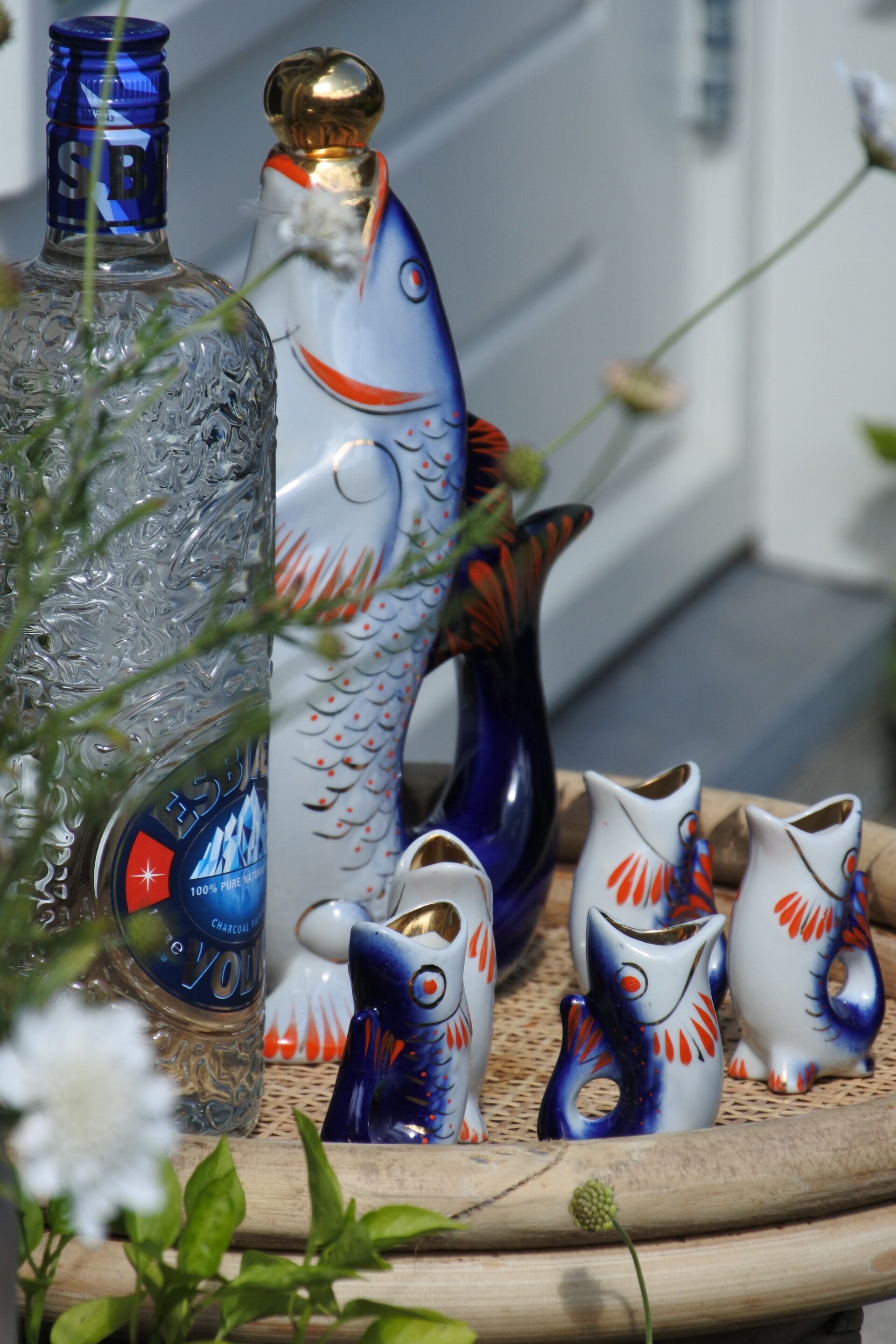 De set bestaat uit een wit-blauwe schenk karaf en 5 kleine wit blauwe bekertjes. In de Sovjet tijden was dit een zeer geliefd verjaardagscadeau, omdat deze set toonde dat er van rijkdom sprake was in de Sovjet familie.