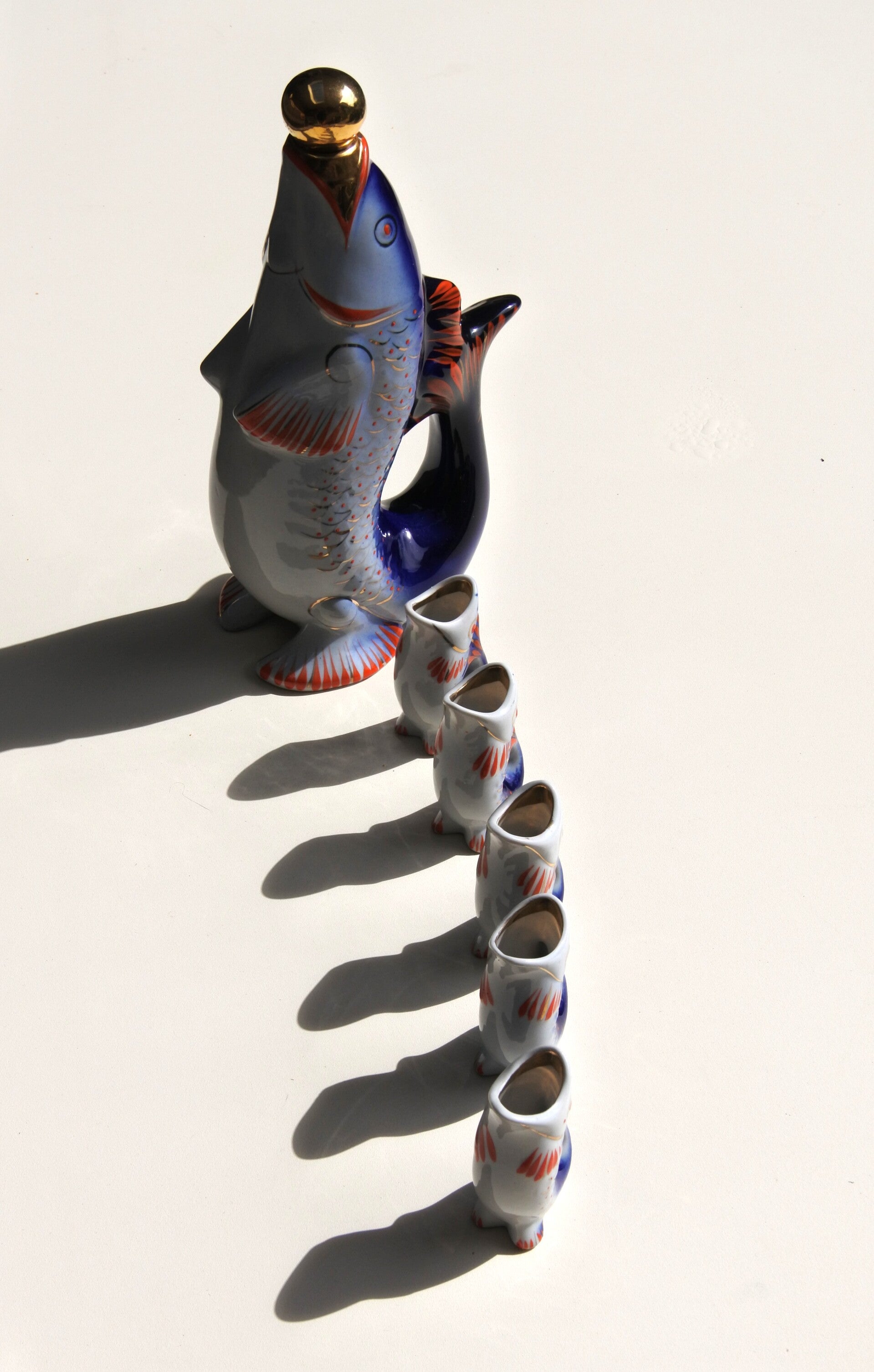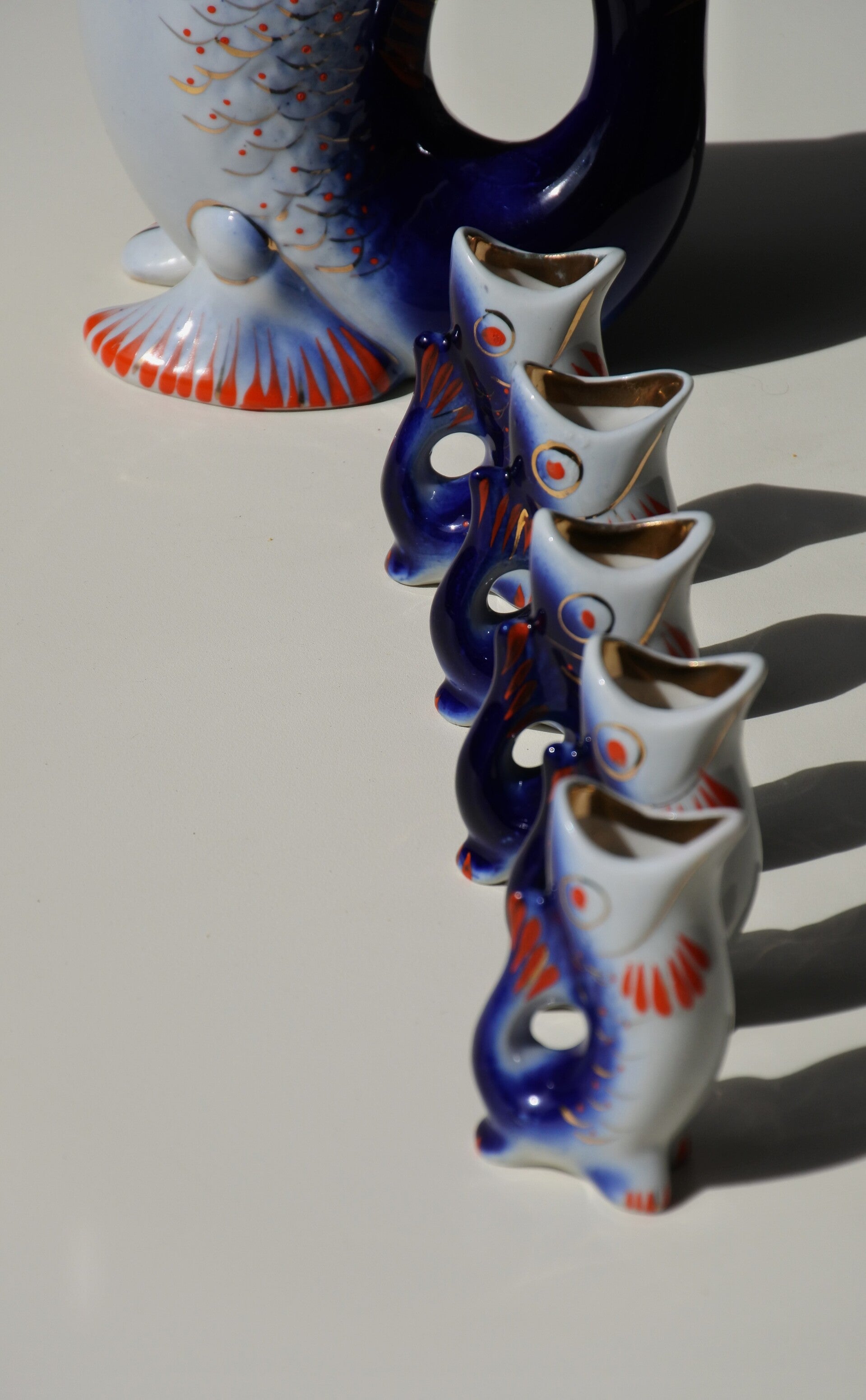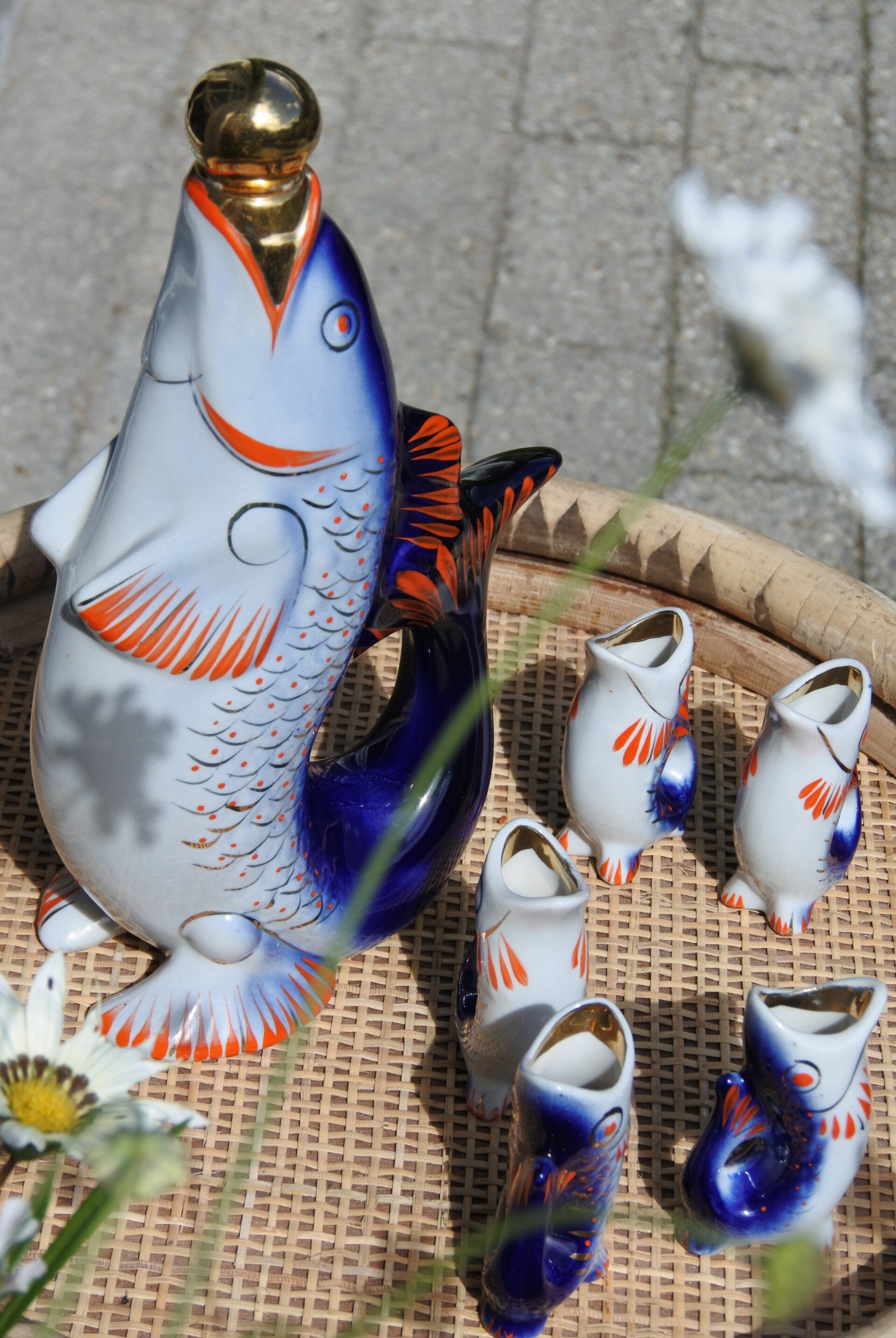 Deze vintage handgemaakte keramische set vervaardigd in de Sovjet Unie (nu Oekraïne) komt uit de jaren 70/80 en is perfect voor het serveren van een shotje op je (poker)avond, feestavond of puur als decoratief stuk want het zijn toch net kleine kunstwerkjes?