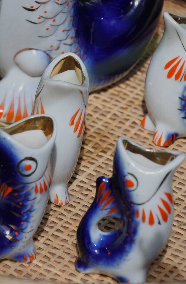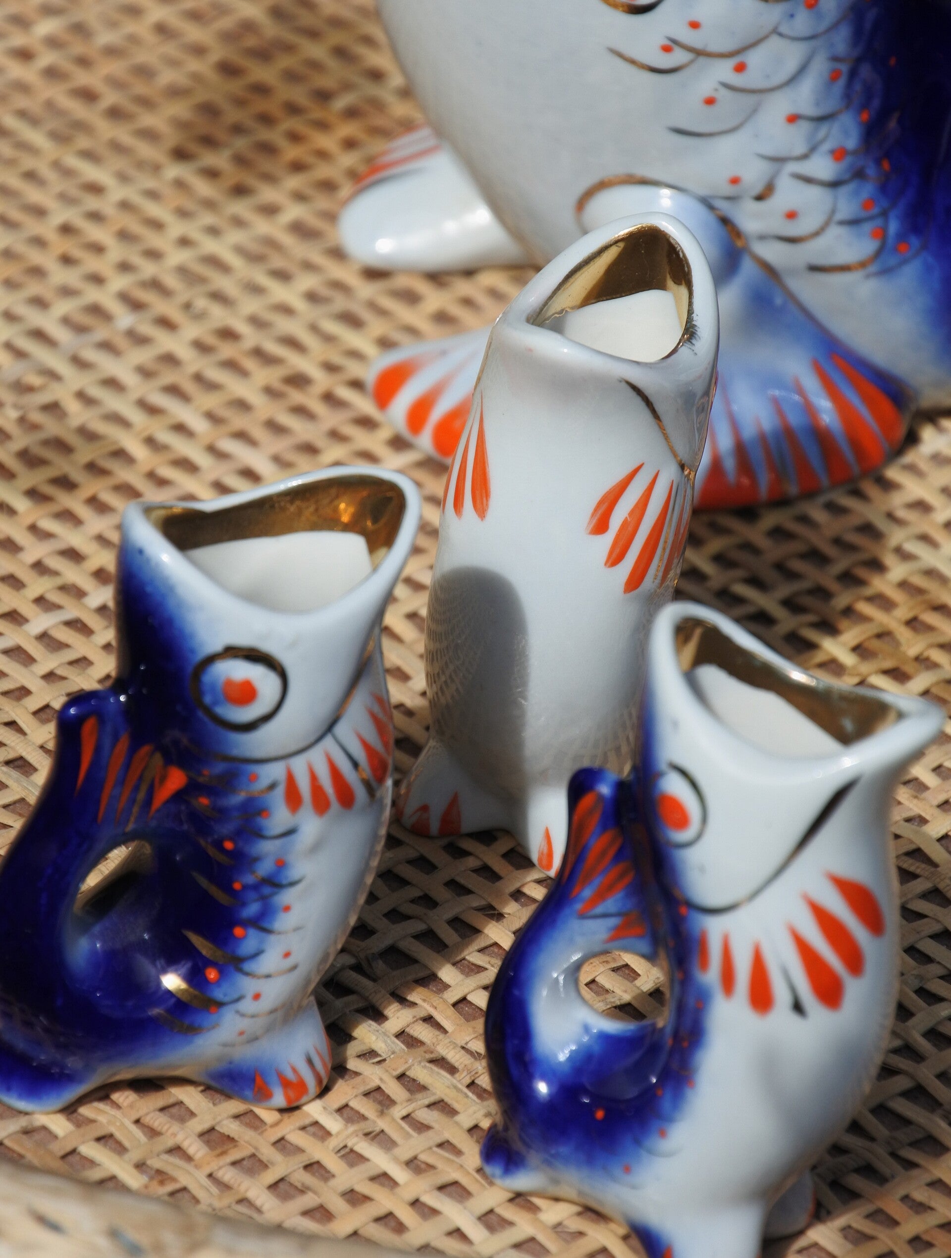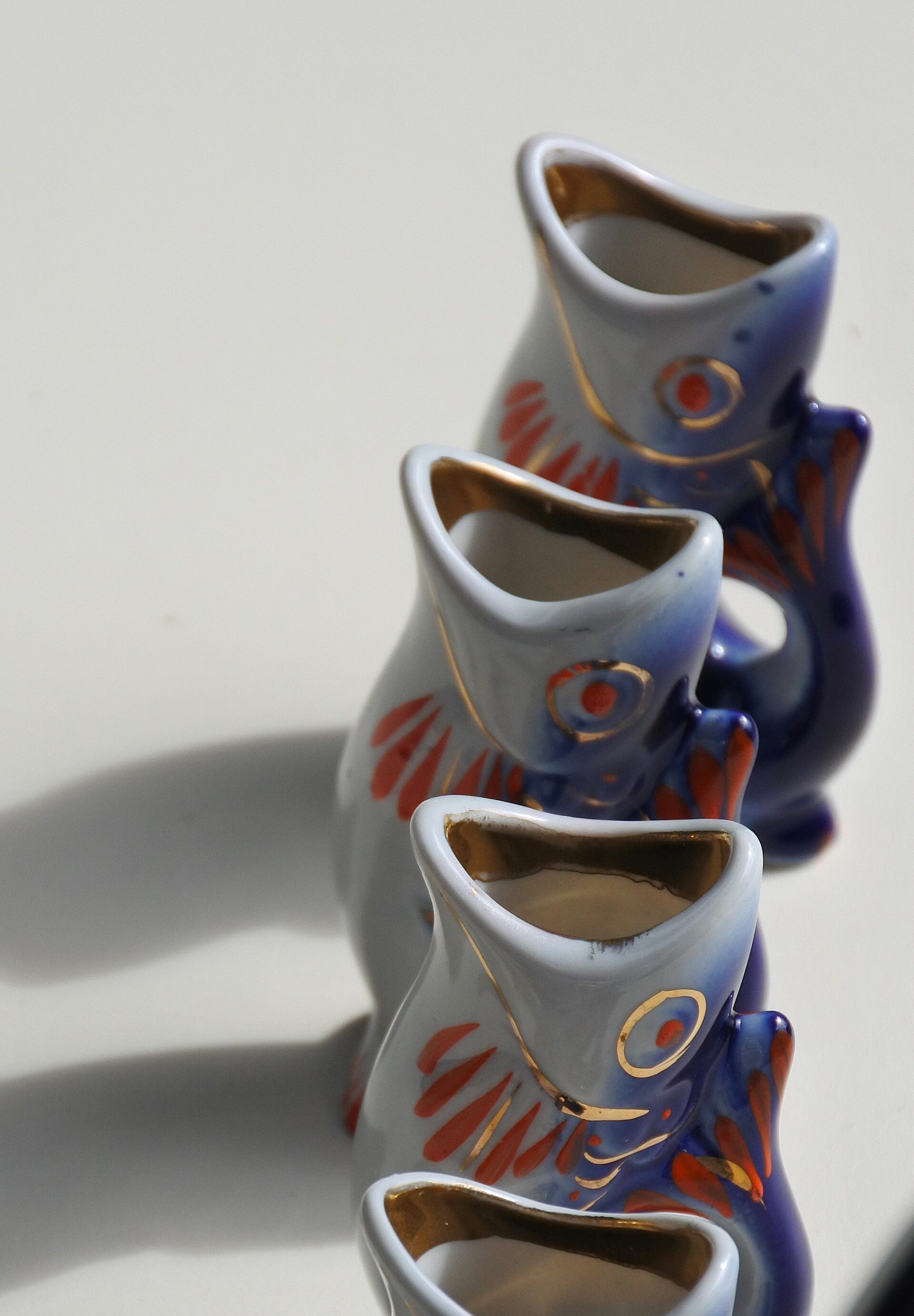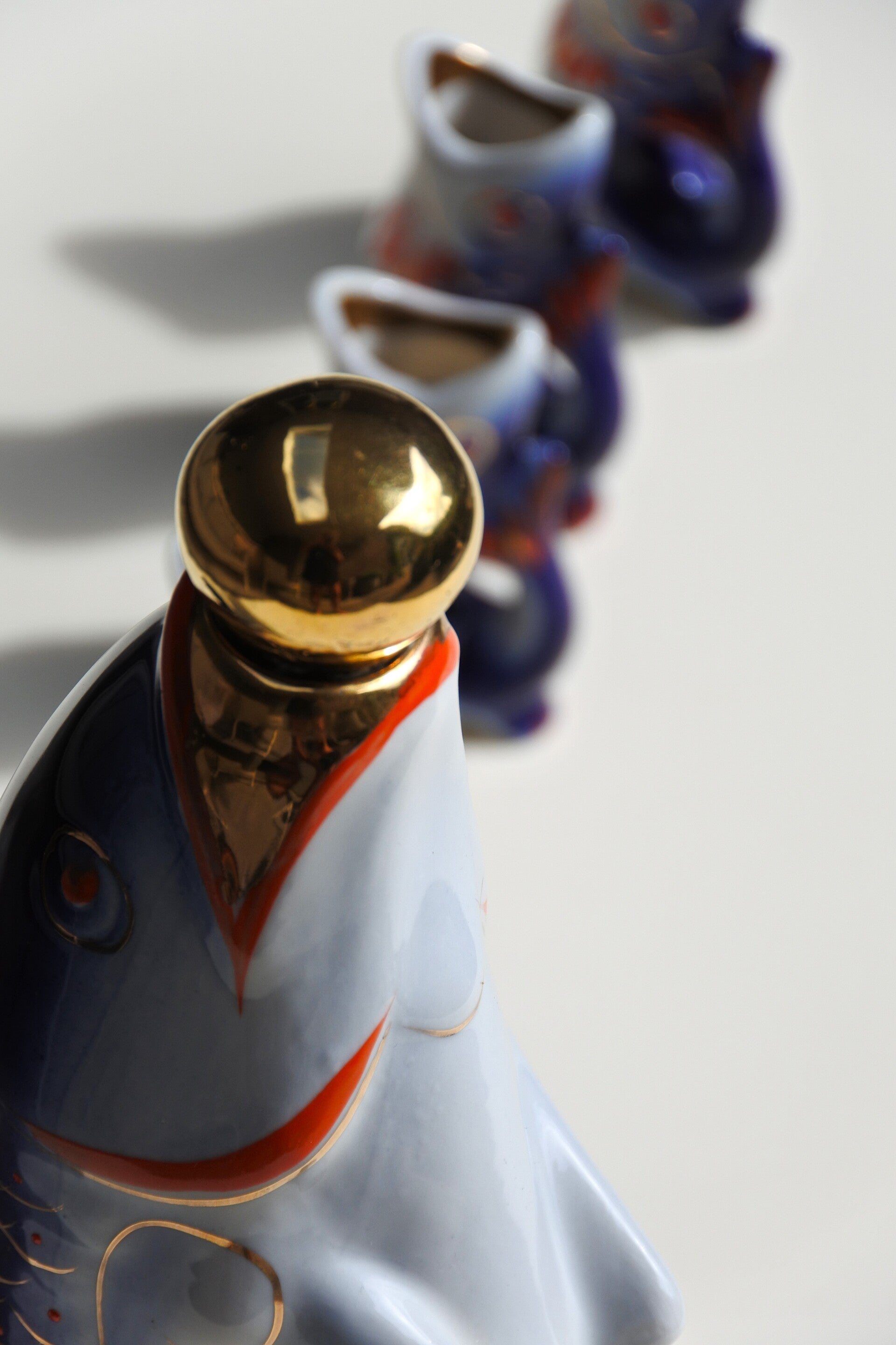 Deze vintage handgemaakte keramische set vervaardigd in de Sovjet Unie (nu Oekraïne) komt uit de jaren 70/80 en is perfect voor het serveren van een shotje op je (poker)avond, feestavond of puur als decoratief stuk want het zijn toch net kleine kunstwerkjes?