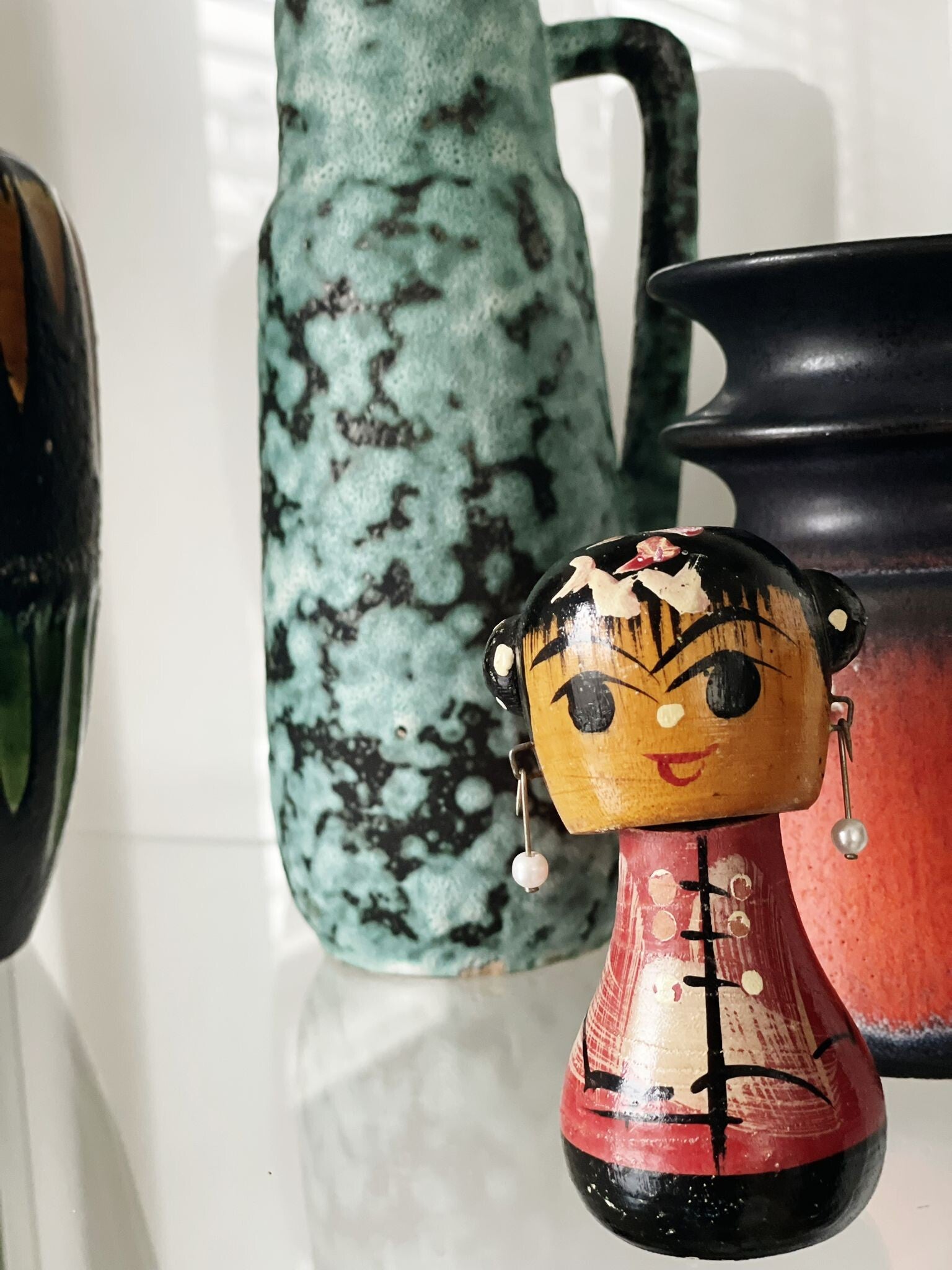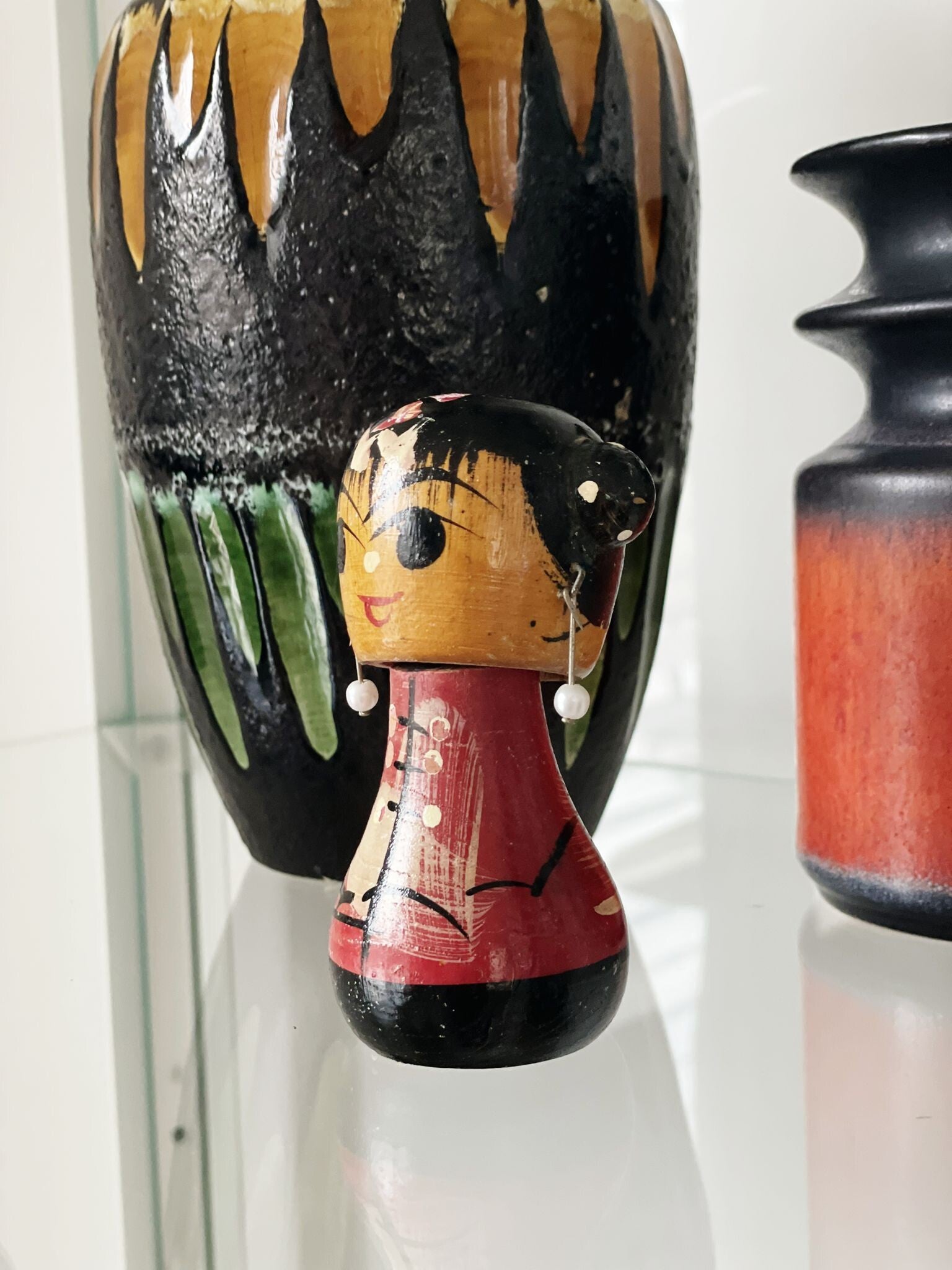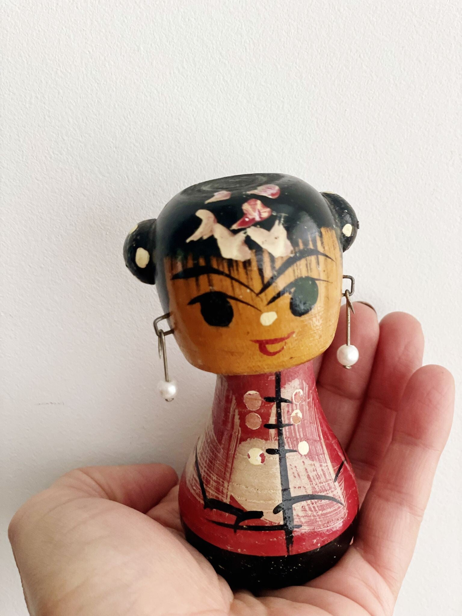 Vintage handbeschilderde traditionele houten Japanse Kokeshi bobbelhoofd -beeldje.