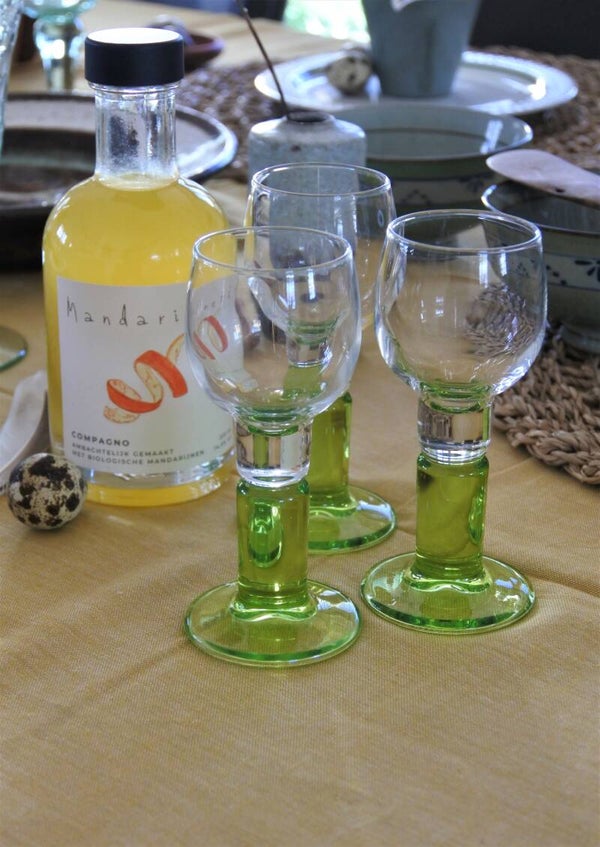 Set van 2 prachtige vintage Italiaanse likeur -shot glaasjes uit de jaren '90. De glazen hebben een kelk van doorzichtig glas en een zowel helder als groen glazen steel. Gemaakt door Bormioli Rocco Italy. Perfect voor een klein kittig likeurtje zoals bijvoorbeeld een klein limoncello'tje, schnaps of.. een advocaatje! (wordt je oma heel gezellig van)