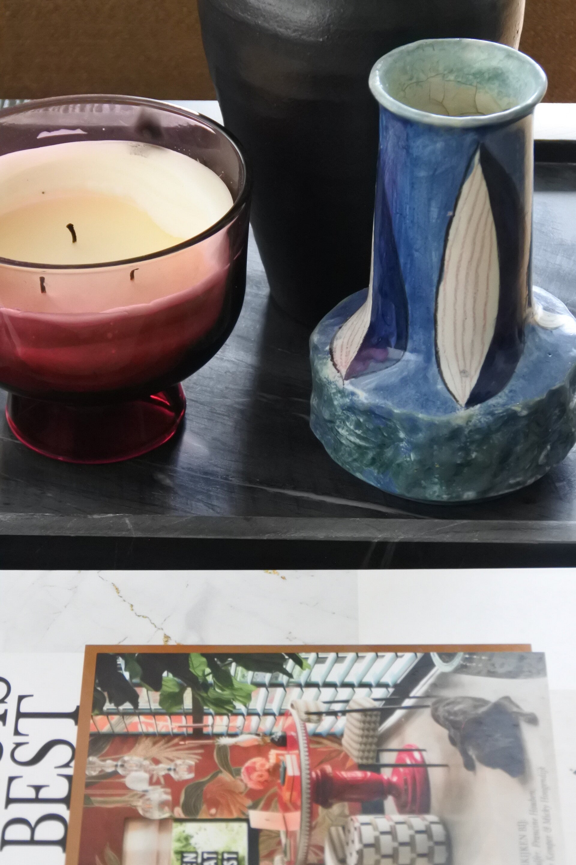 Prachtige vintage handgemaakte keramische vaas met een blauw en wit glazuur. Het ontwerp heeft een artistieke uitstraling met strakke, bladvormige motieven in wit met fijne roze lijnen, afgezet tegen een donkerblauwe achtergrond.