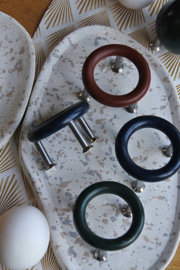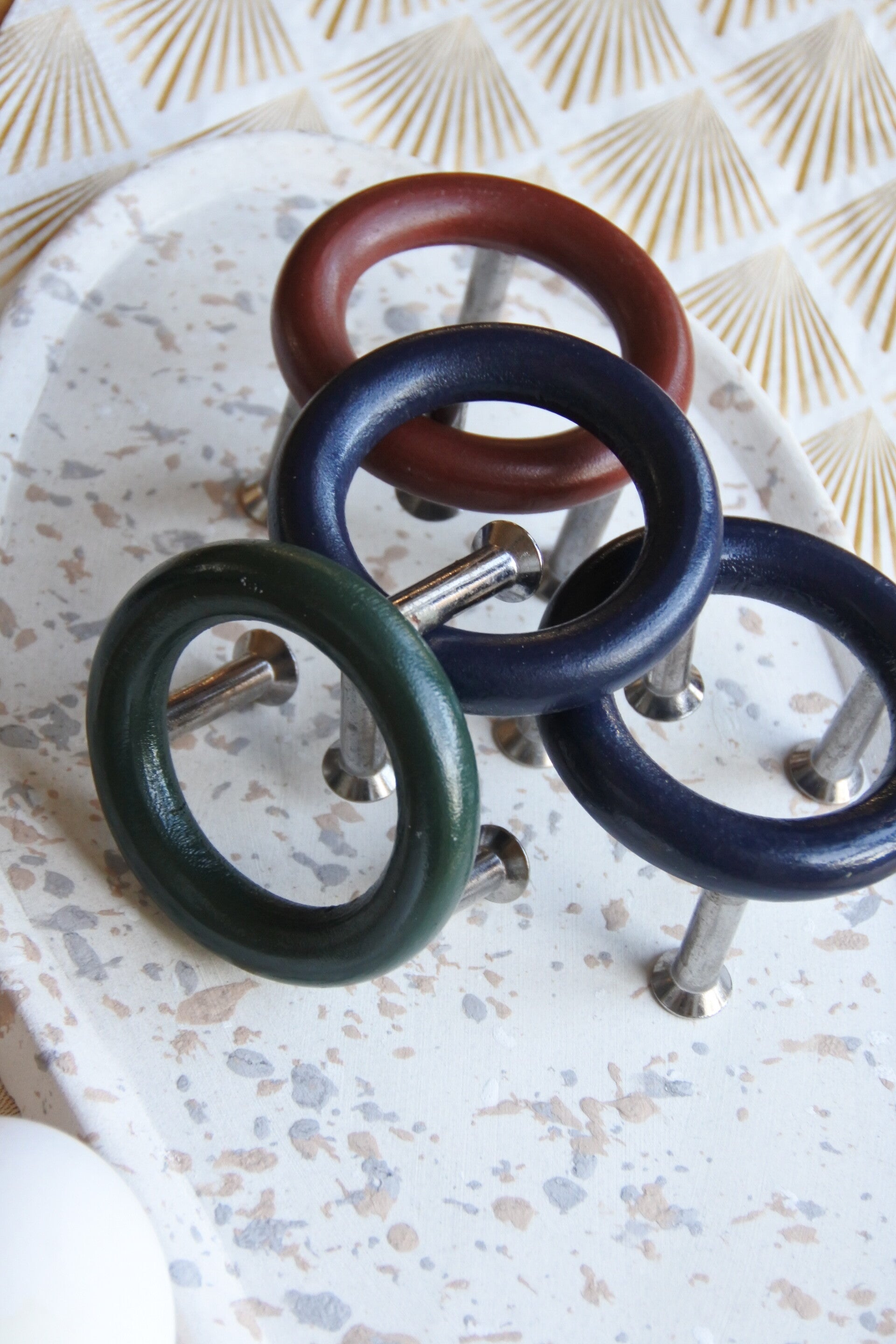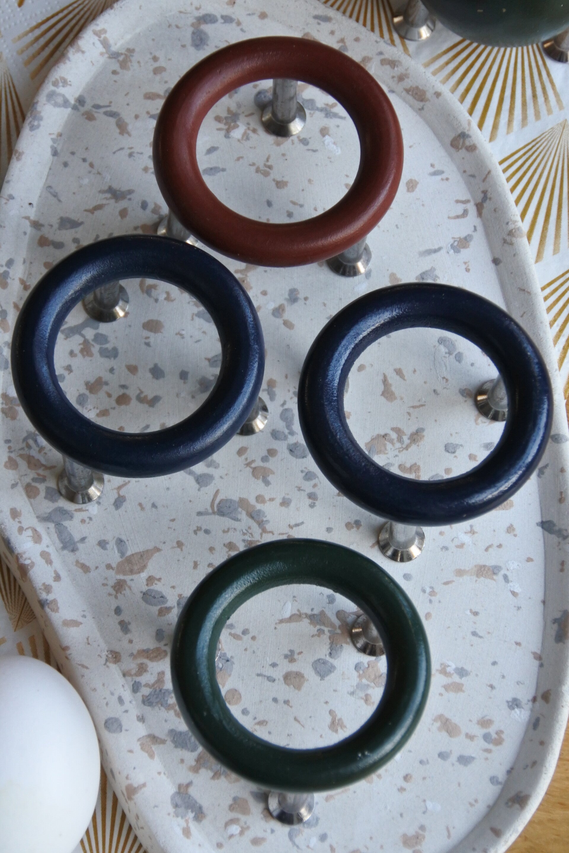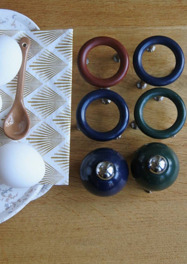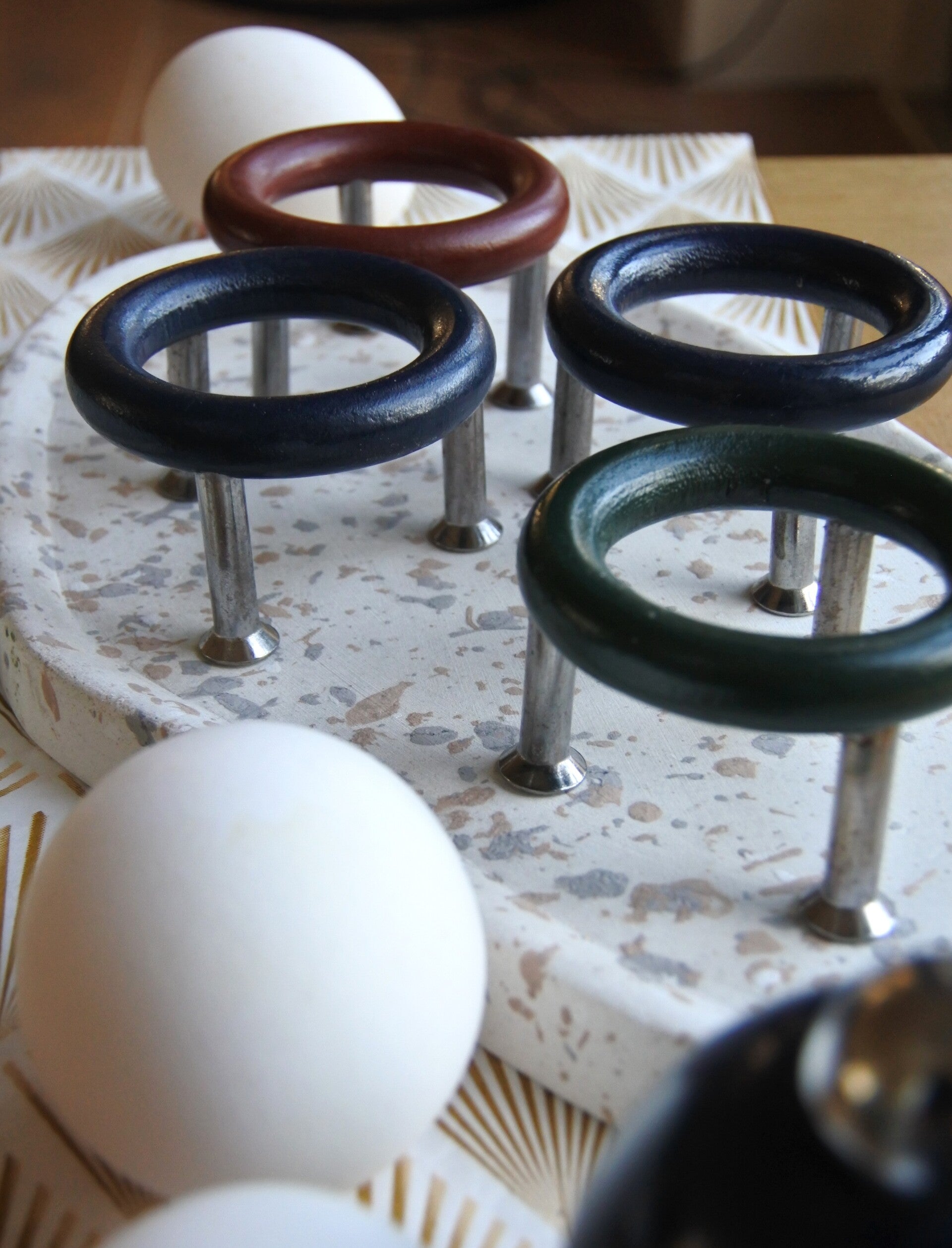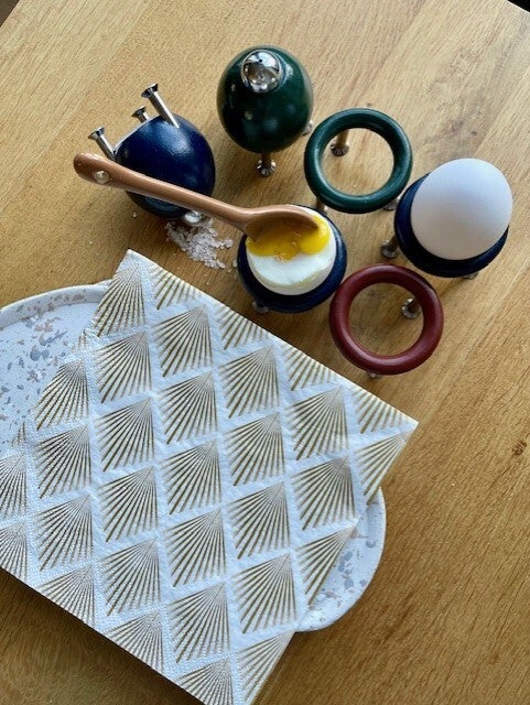 Mooie space age set van 4 eierdoppen van hout op een rvs onderstel. Bij het setje hoort tevens een peper en zoutstelletje (beide met 1 strooigaatje) vervaardigd van hetzelfde materiaal.
