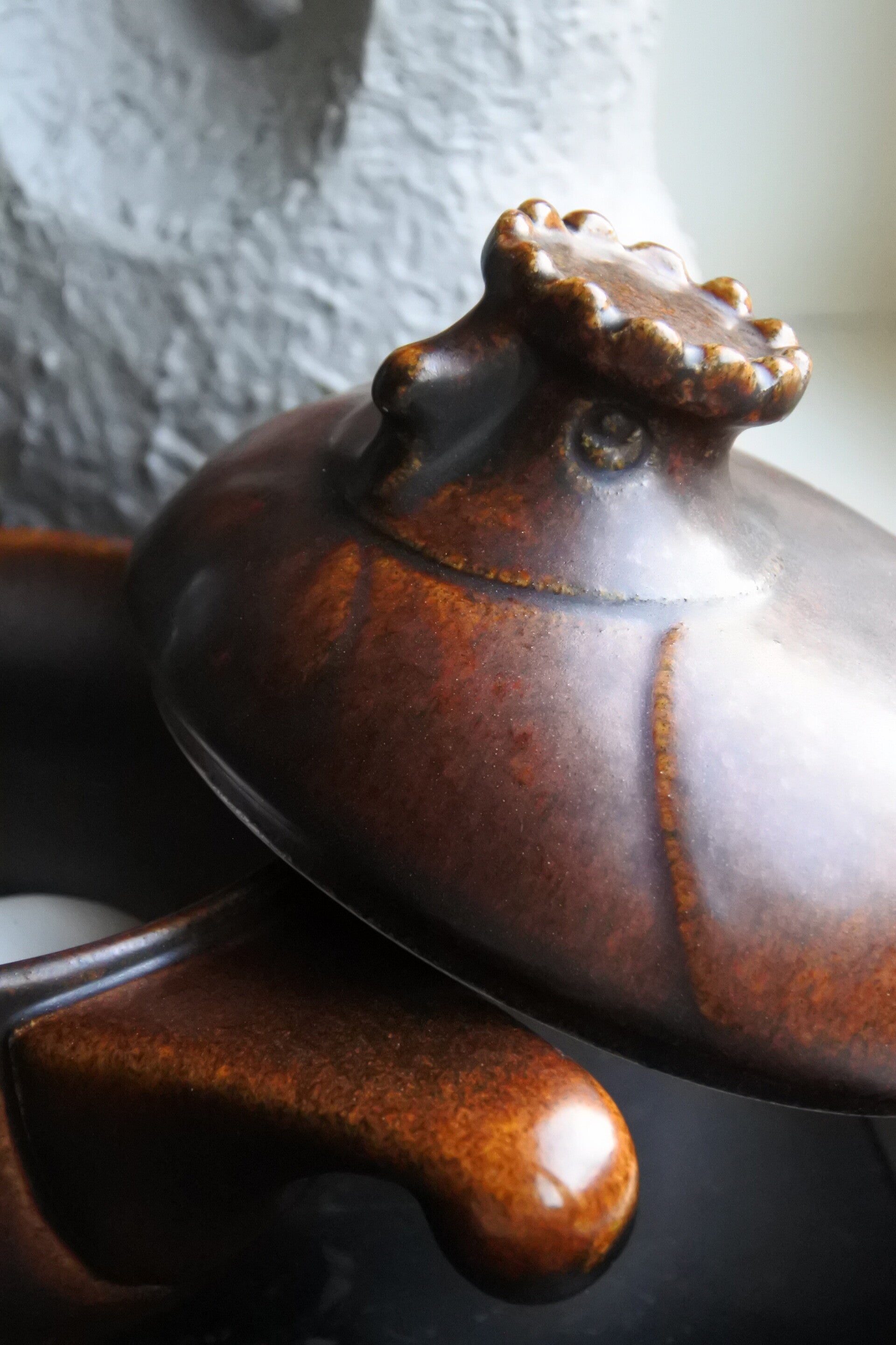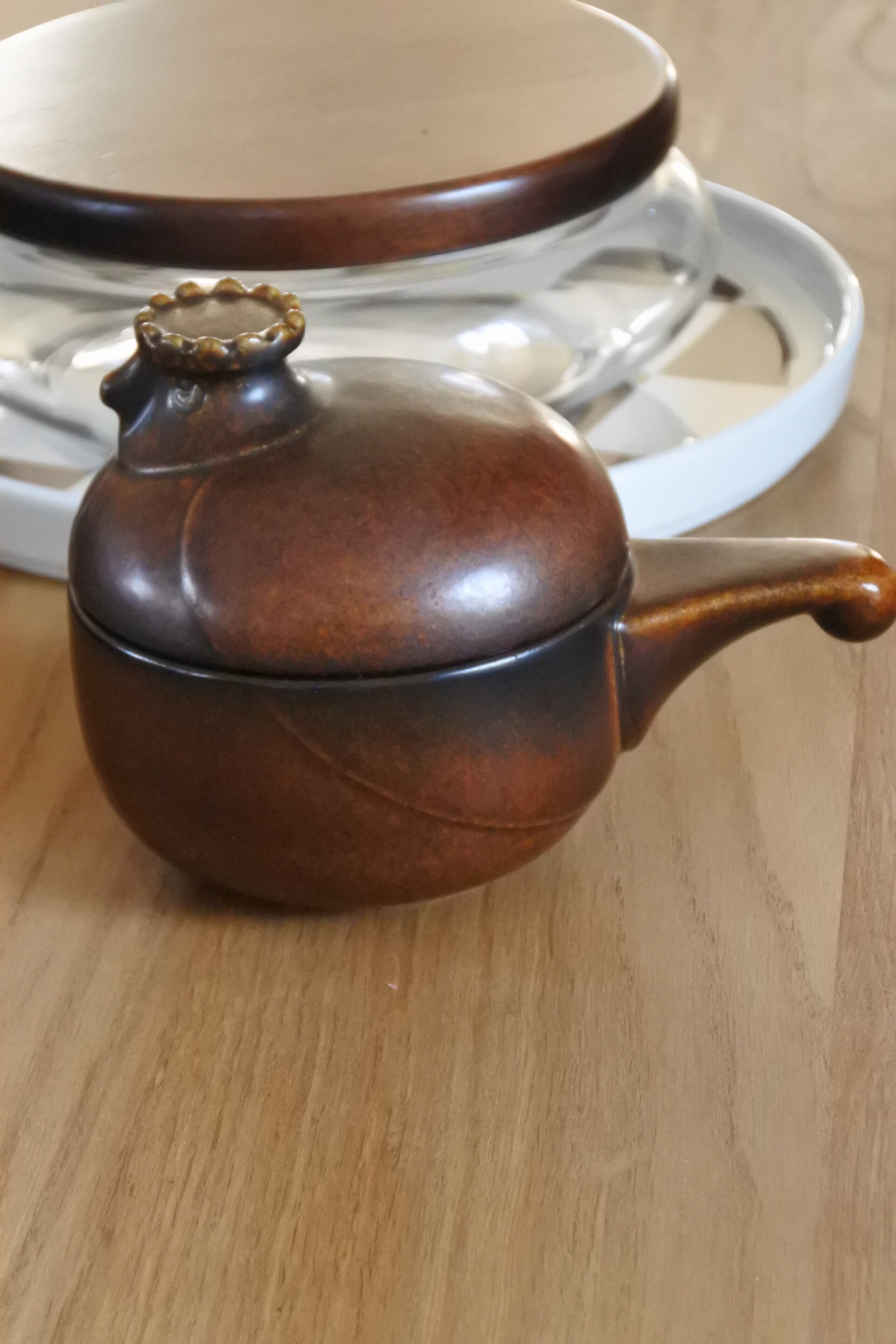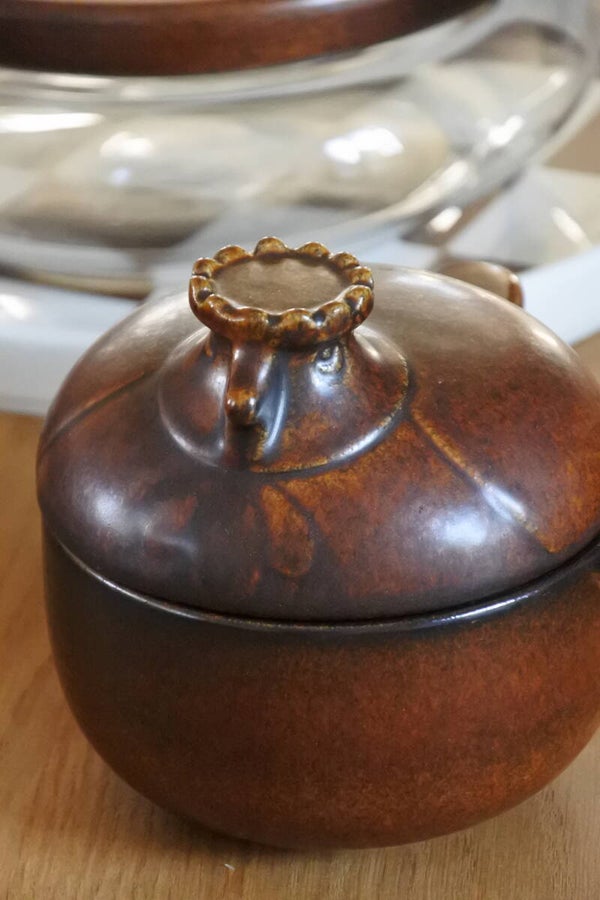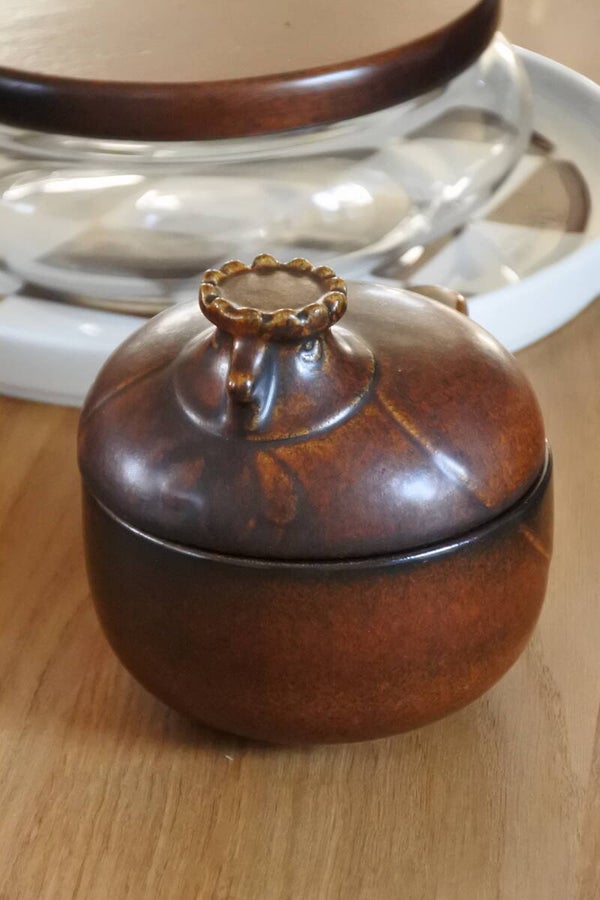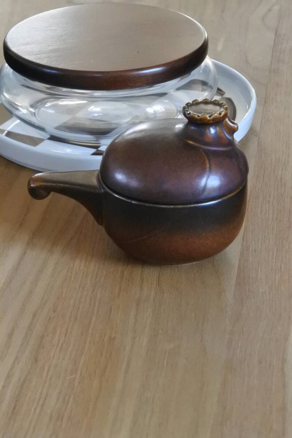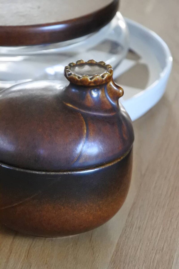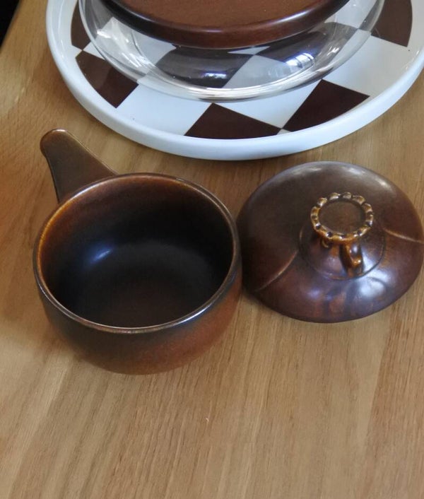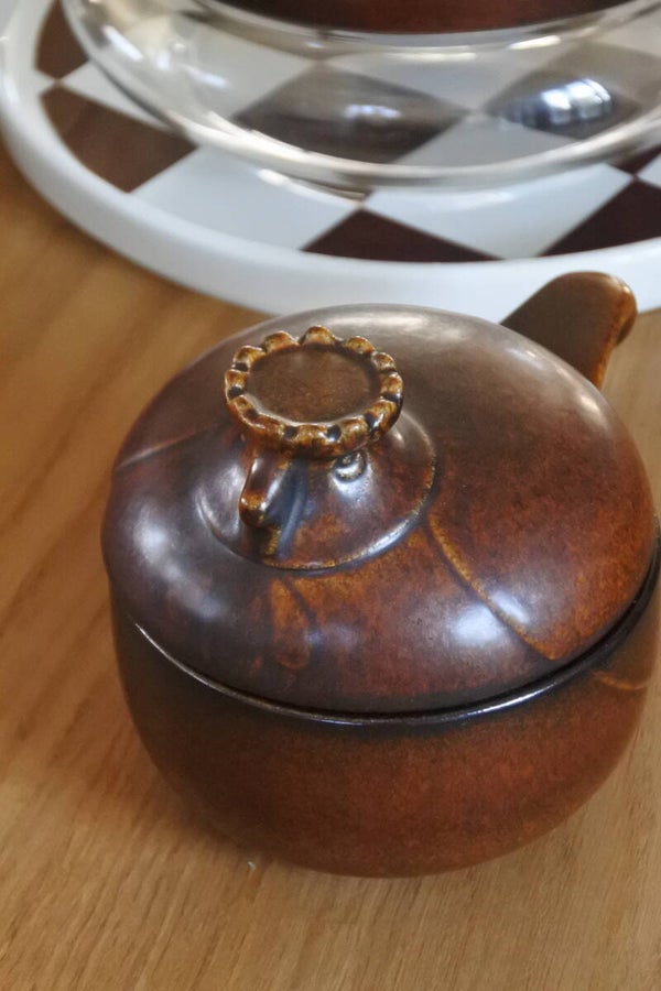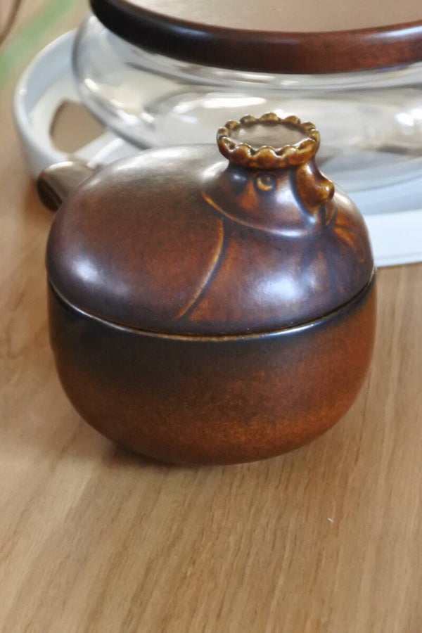 Heel mooi vormgegeven dekselschaal 'Katen' van bruin keramiek met leuk steeltje en! super schattig deksel met broedend kippen kopje van Melitta Friesland uit de jaren 60.