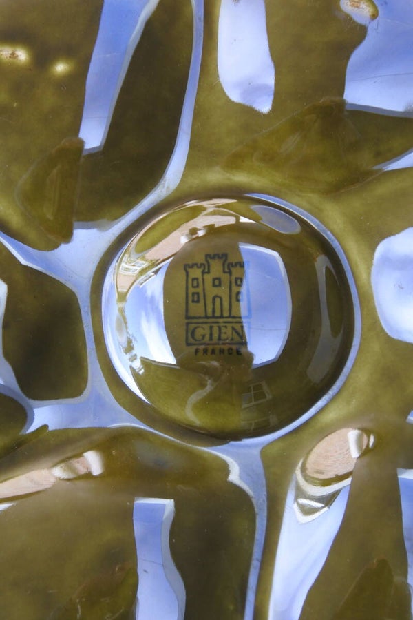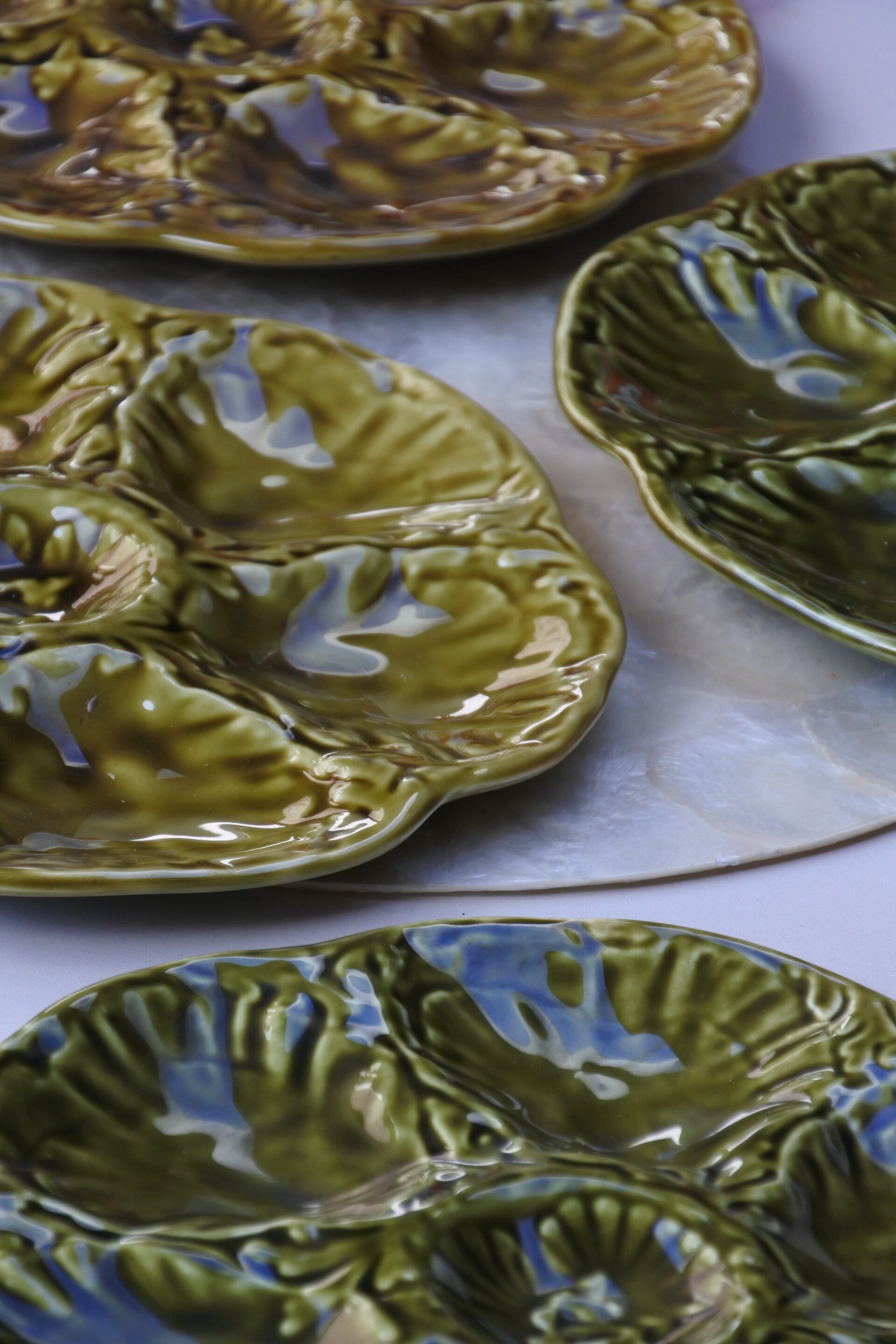 Prachtige groene Gien France barbotine oesterborden uit de jaren 60 met zes vakjes voor oesters en een centraal vakje voor een citroen of vinaigrette. Ze zijn gemaakt van fijn aardewerk (faience) en hebben een geglazuurd oppervlak.