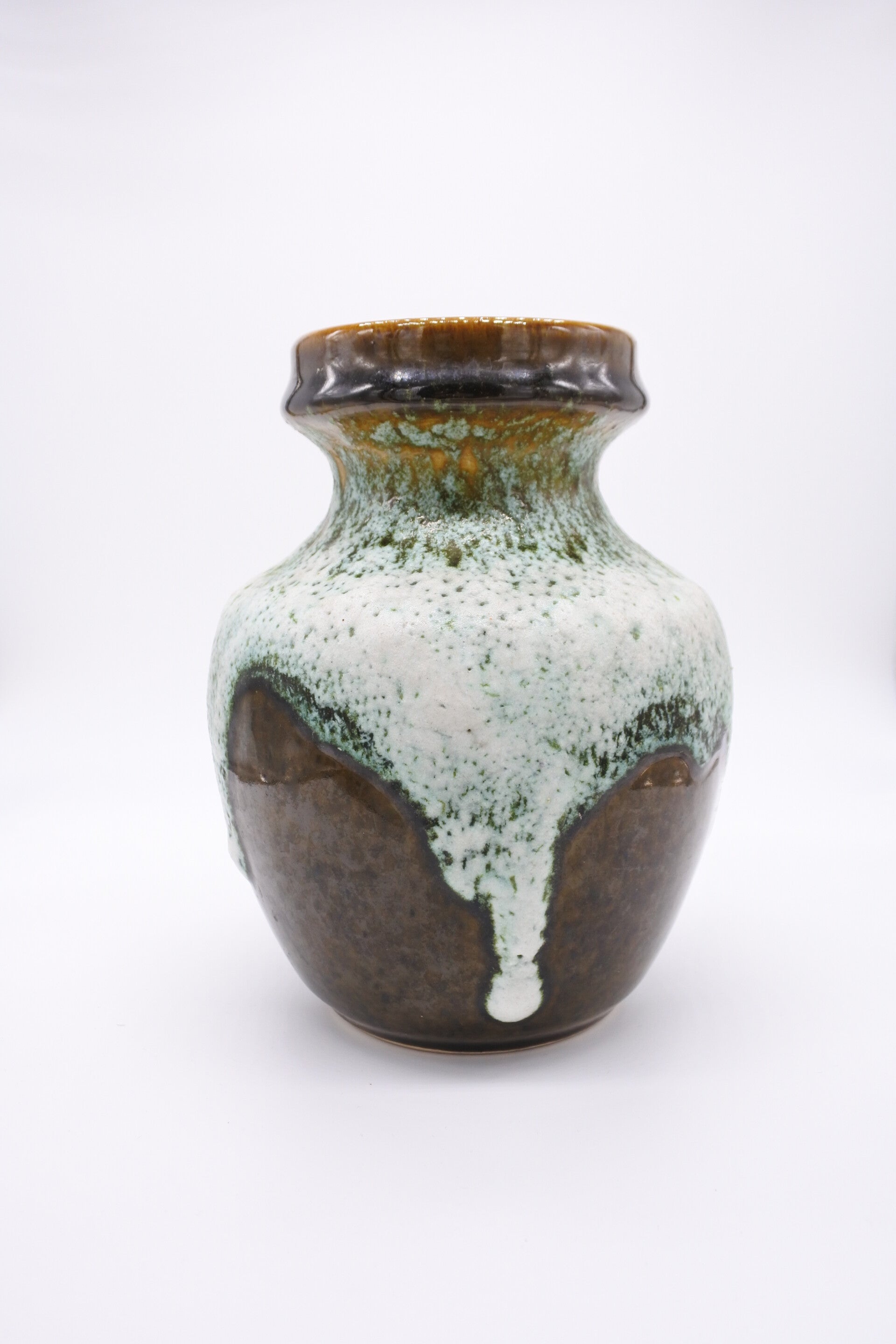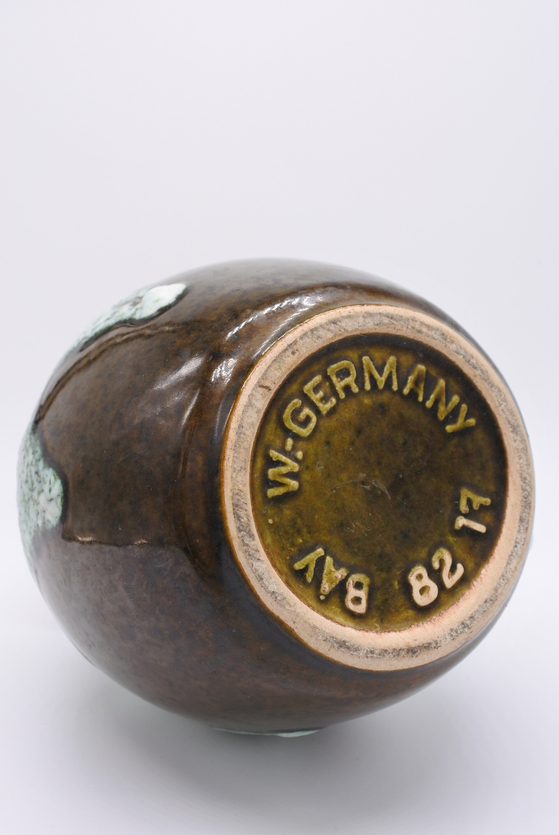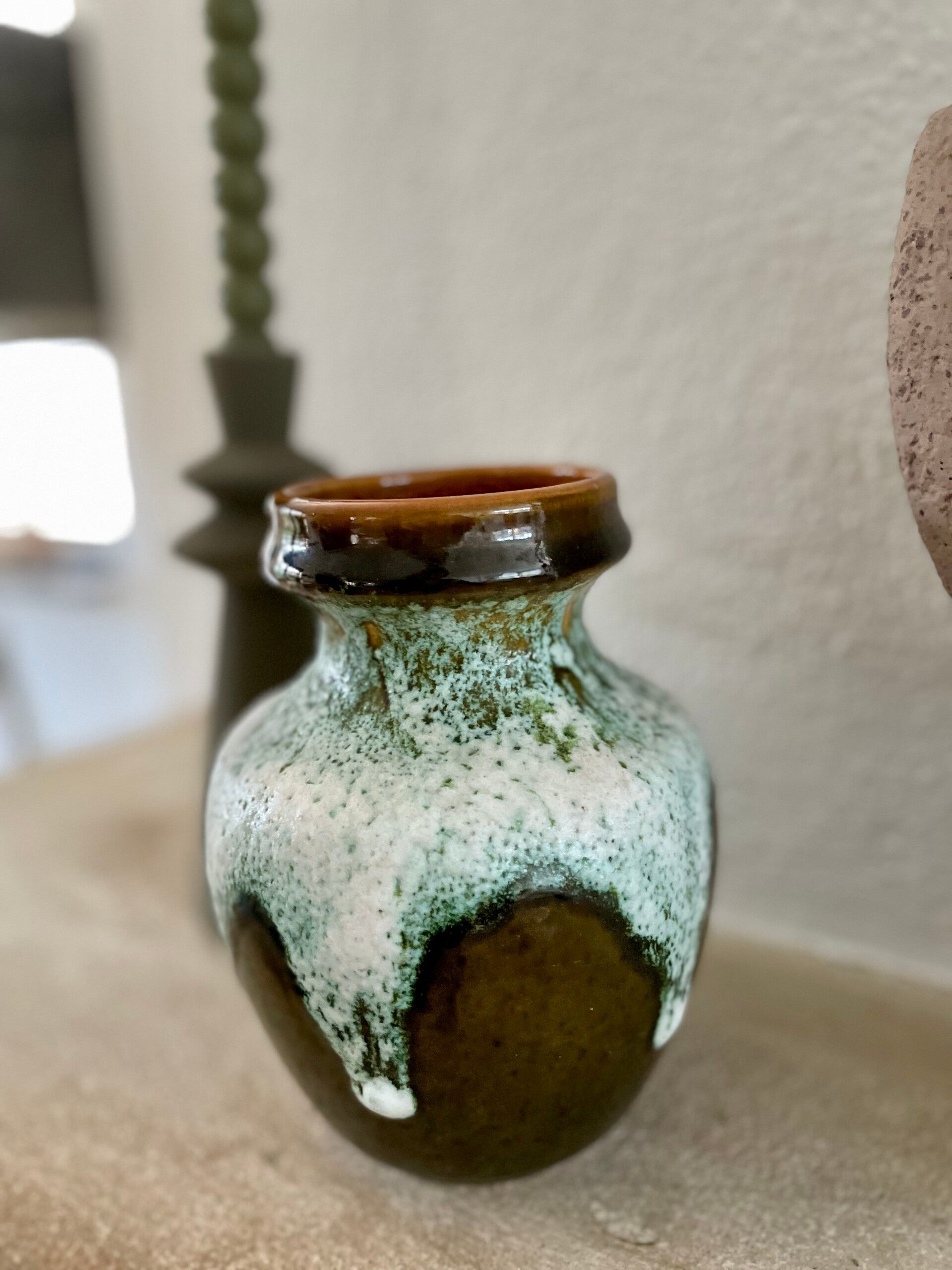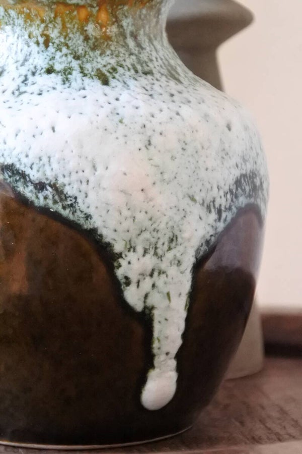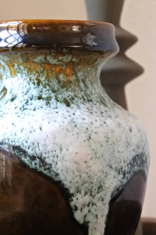 Vaas van West Germany Bay uit de sixties. Deze vaas heeft een speciale groen/bruine kleur met fris wit/groen kleurig fat lava effect.