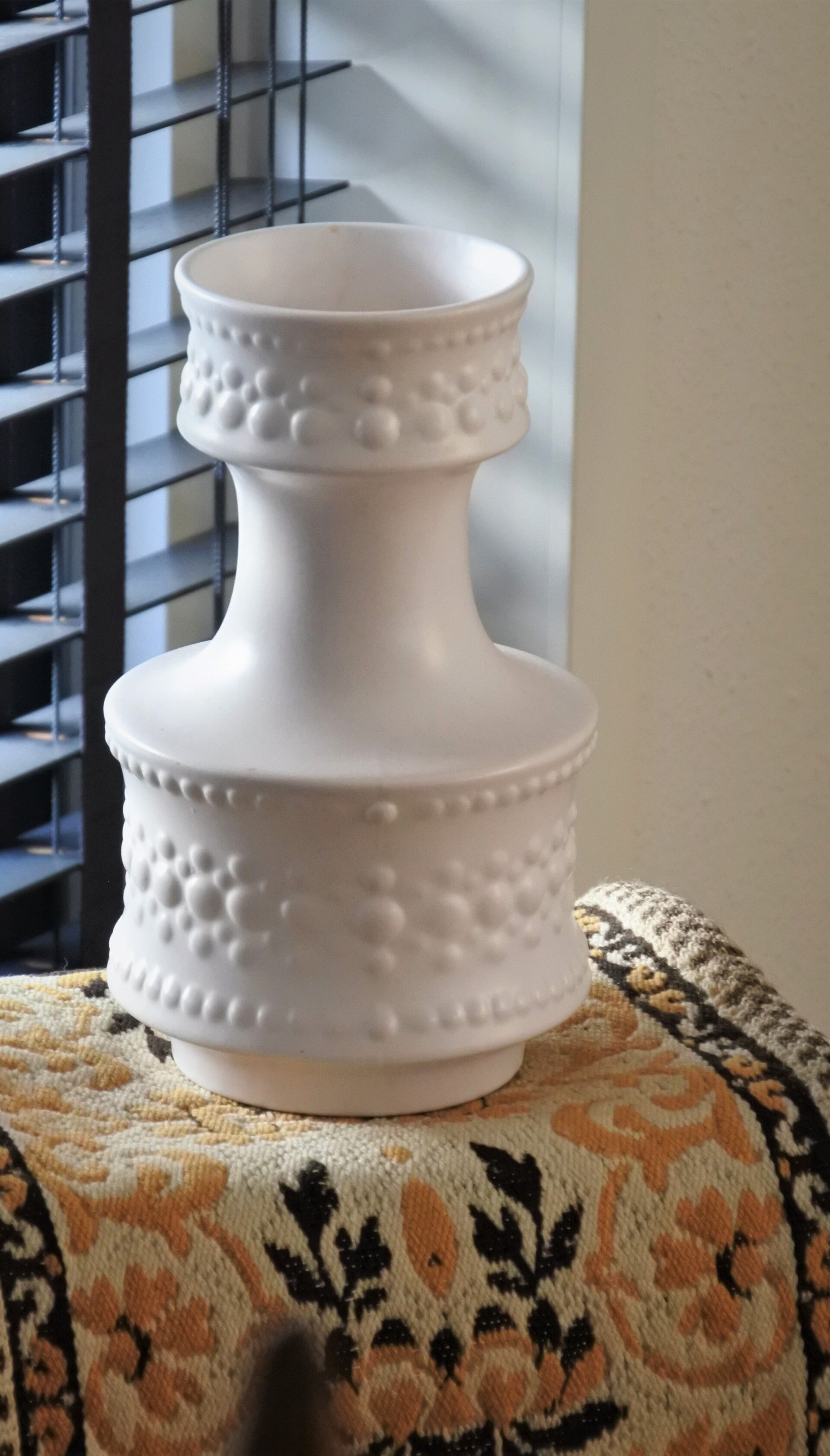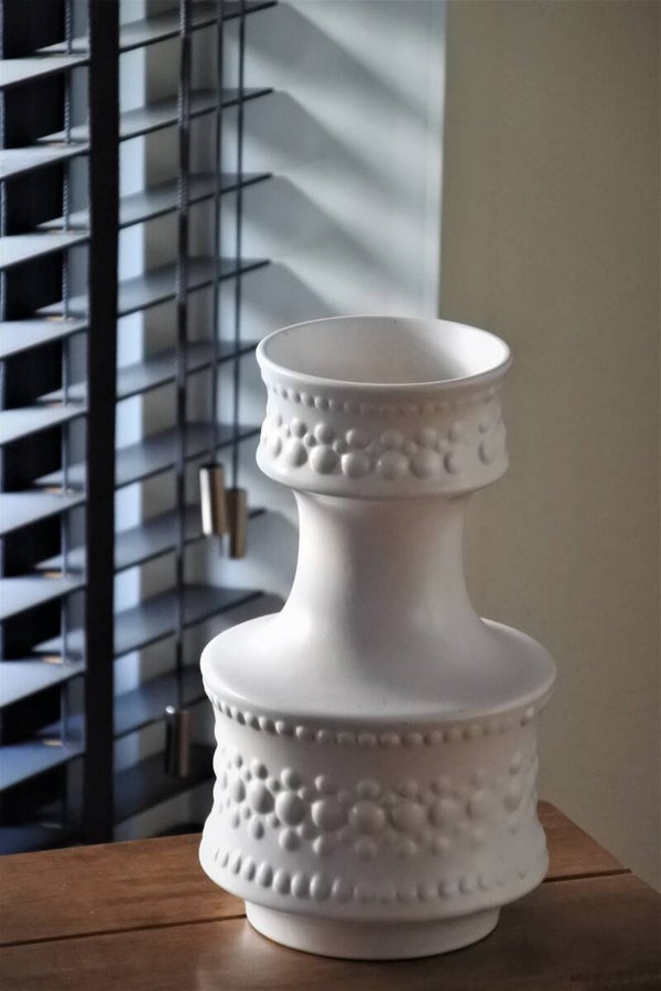 Prachtige roomwitte plateel vaas van Modica Gouda. Door de neutrale kleur, het bijzondere en tijdloze ontwerp is deze vaas zeer geschikt om nog eens 50 jaar te koesteren.