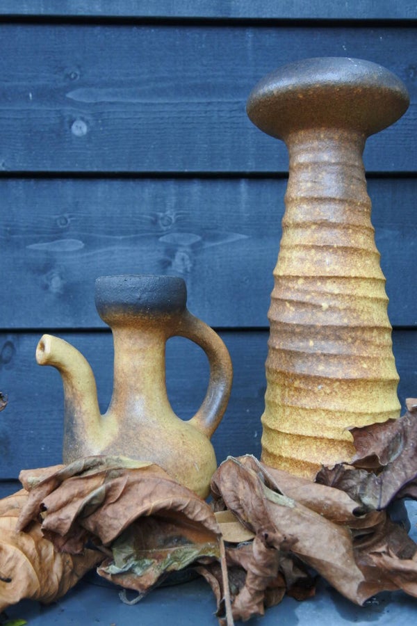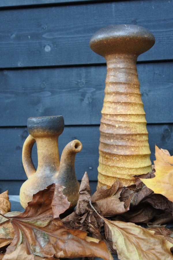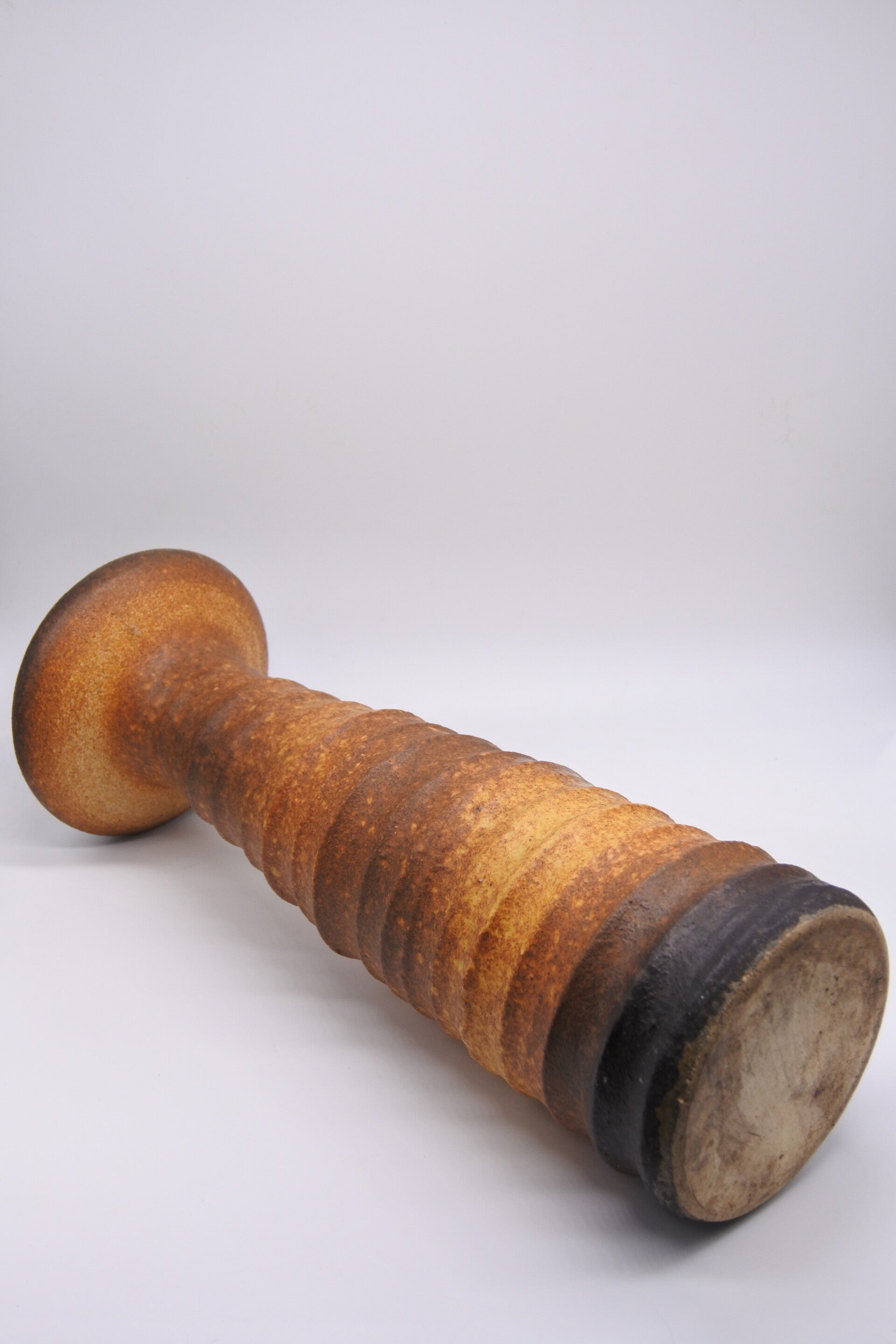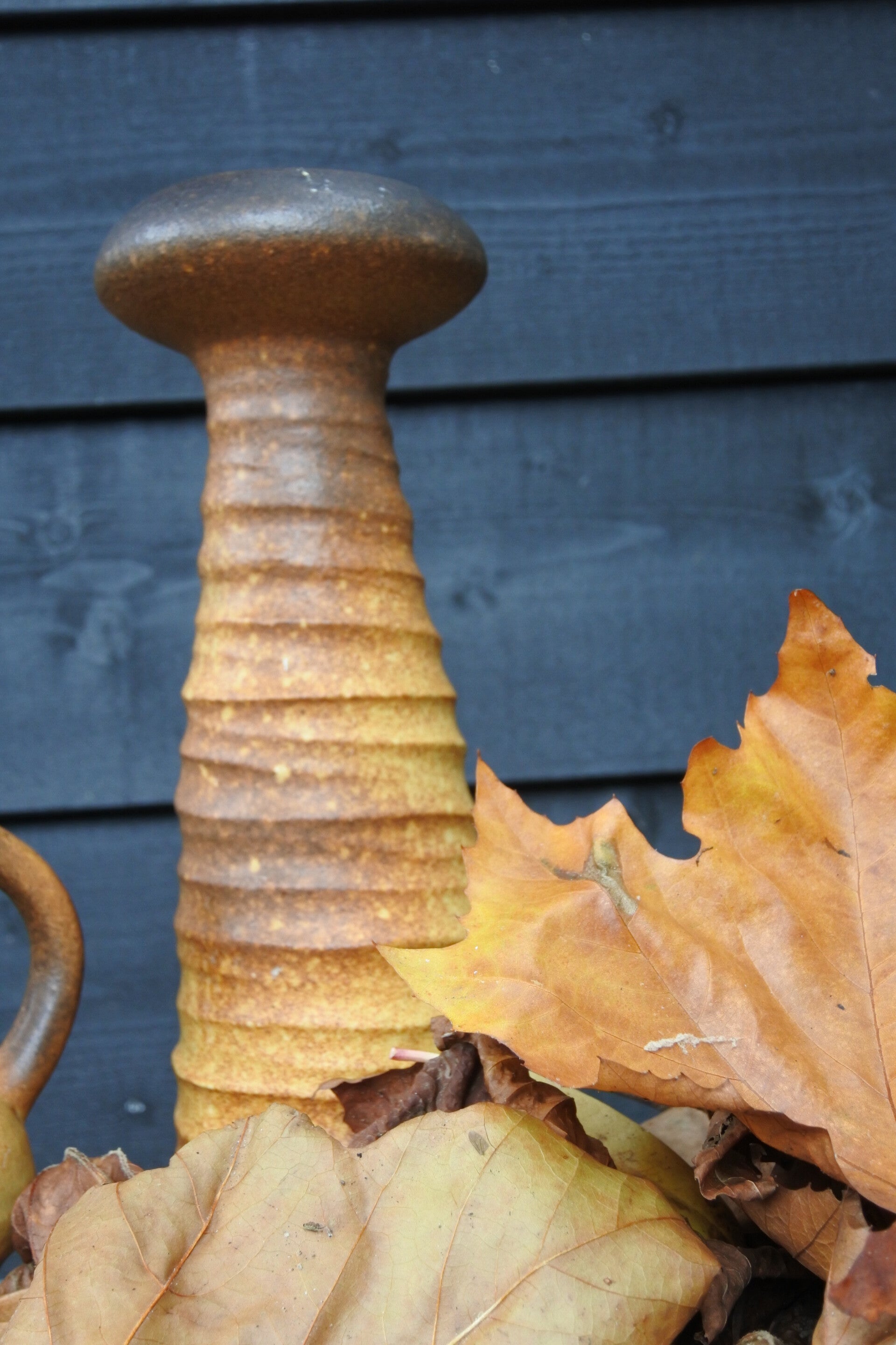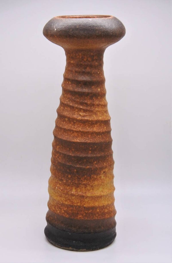 Deze bijzondere vaas van Vest Gouda heeft een mooie tijdloze matte afwerking en de kleur is een prachtige samensmelting van diverse aardetinten met een espressokleurige bovenkant. Het typische en brutalistische ontwerp van Marius van Woerden heeft een spiraalachtige vorm en is een echte mid-century vaas en daarmee een echt collectors item!