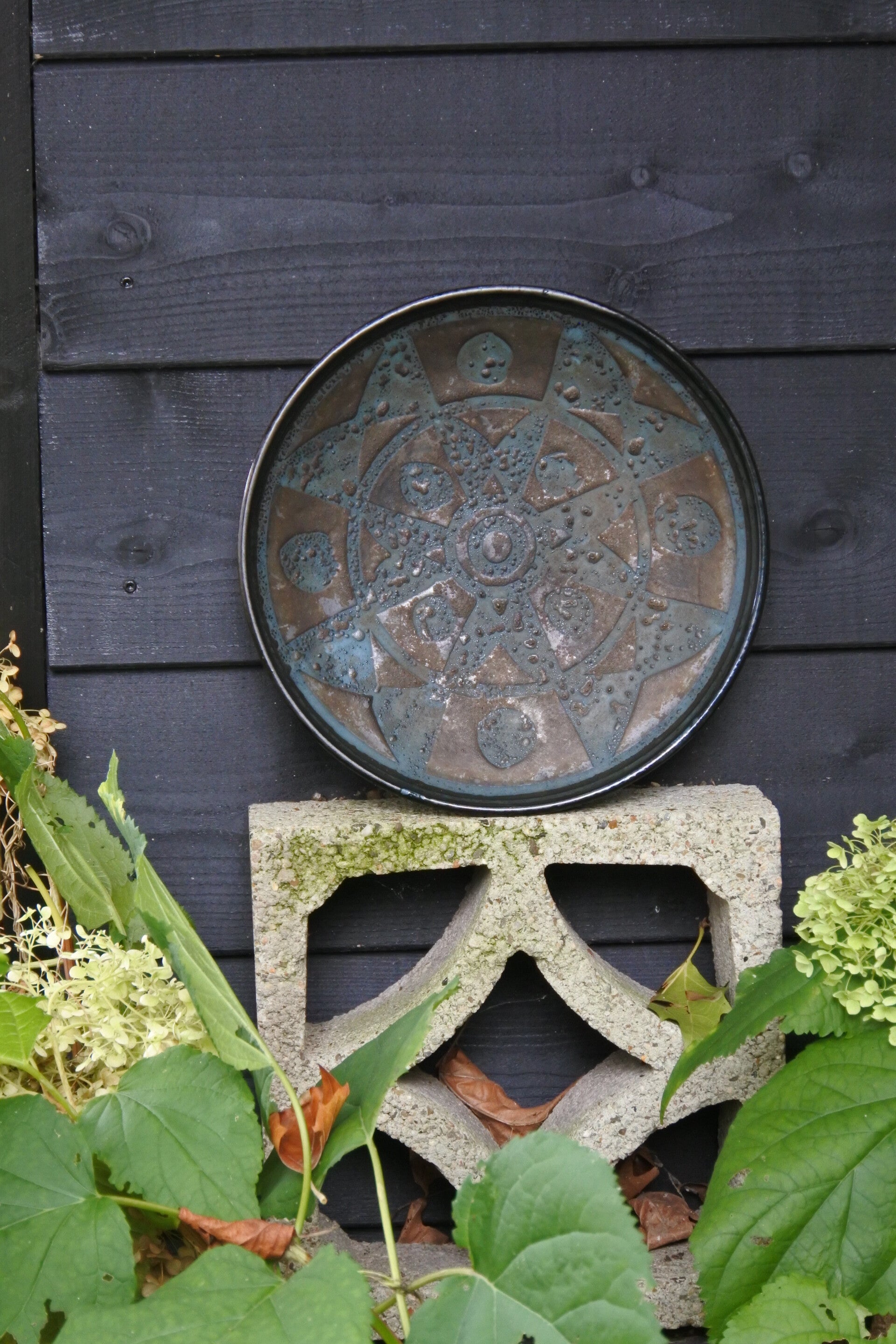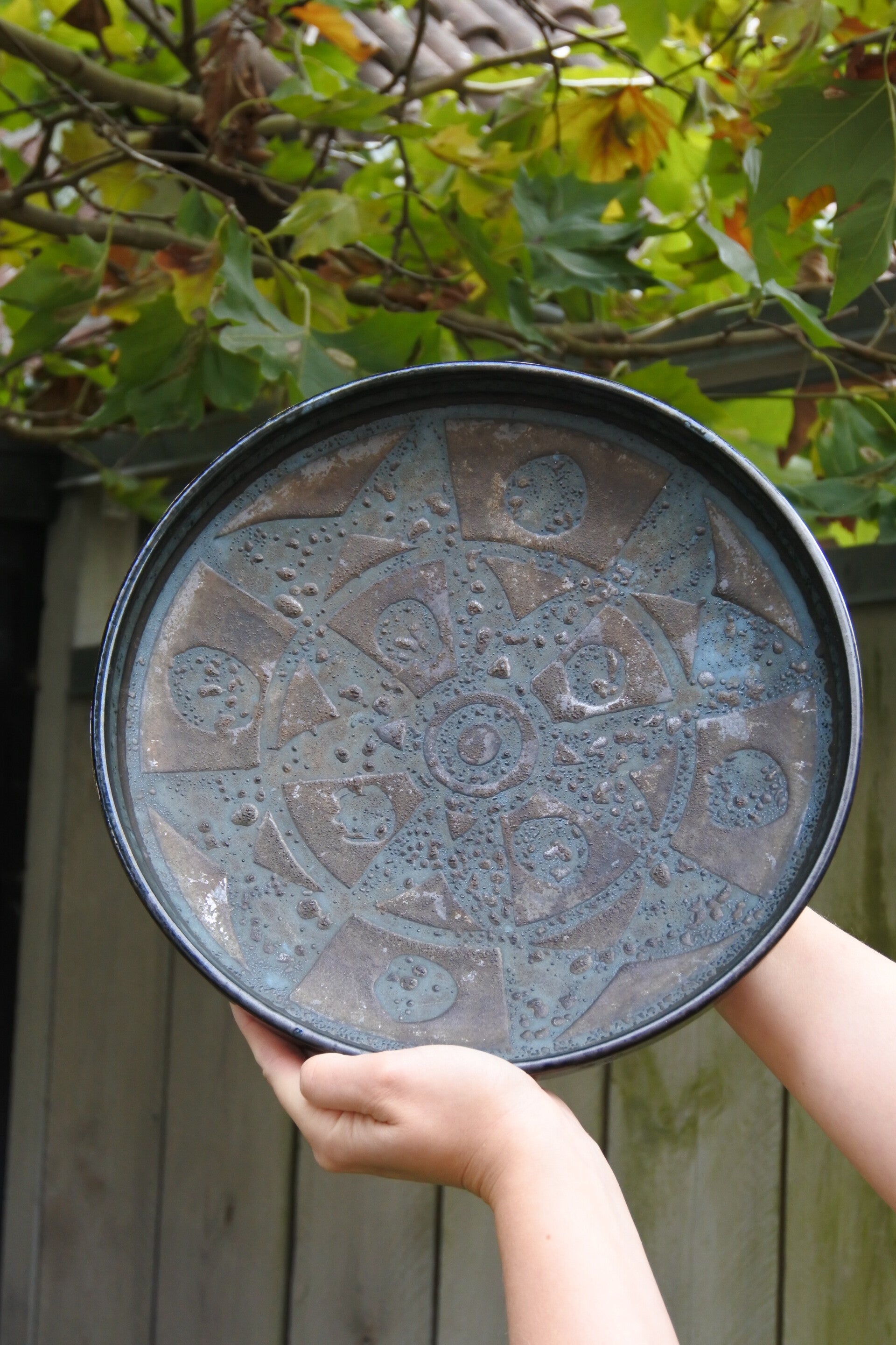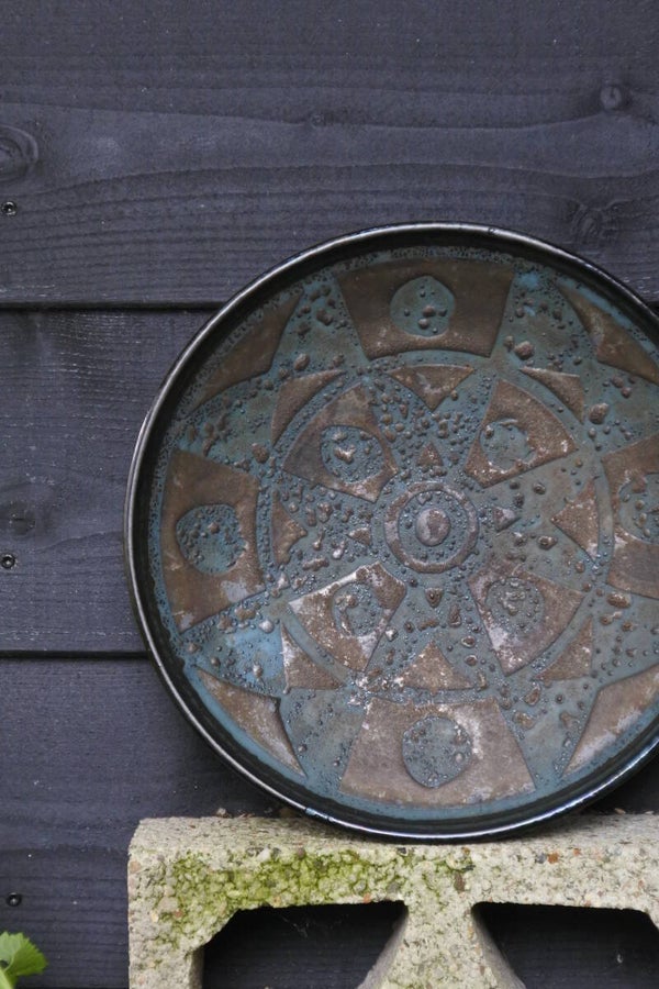 Dit model laat de mooie wax techniek zien die destijds is gebruikt in de serie Ankara. Deze schaal is uitgevoerd in de kleuren metallic zwart/grijs, mineraalblauw en met bronskleurige wax techniek.