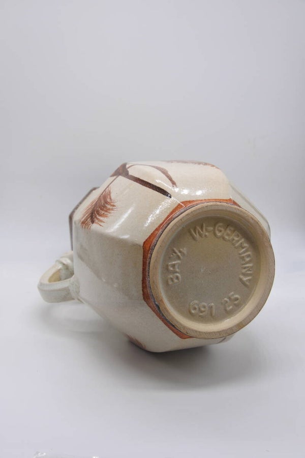 Deze prachtige Bay vaas uit de 60's is een echt pareltje van West Germany! dit model heeft 2 sierlijke handvaten, een zachte creme witte kleur en een cognac kleurige mooie opdruk van veren.