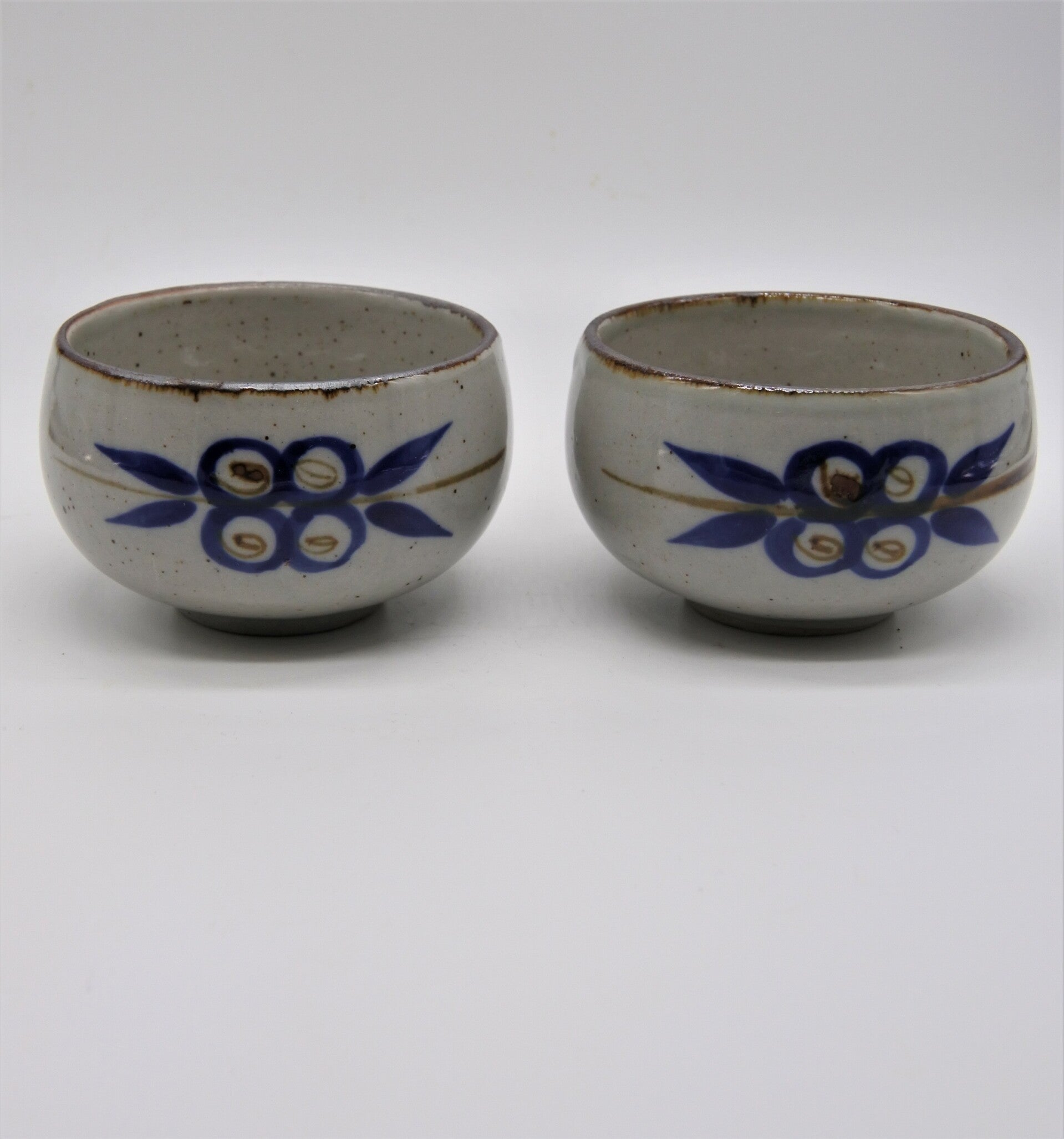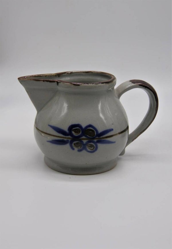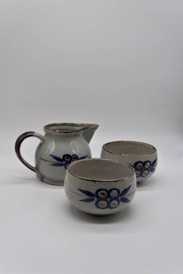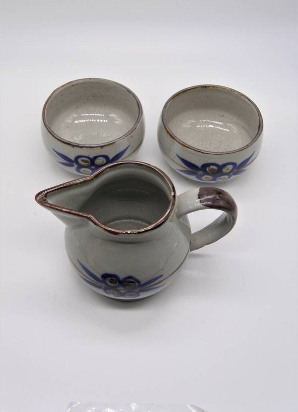 Leuk vintage 3- delig setje in scandinavische stijl in zachtgrijs met mooie handbeschilderde figuurtjes in donkerblauw en bruin. Deze set bestaat uit een kannetje en 2 bijbehorende schaaltjes.