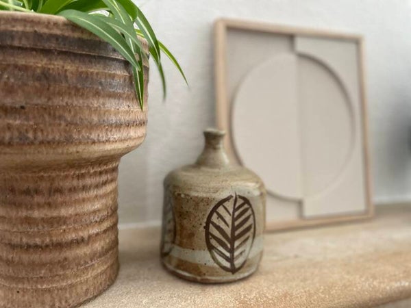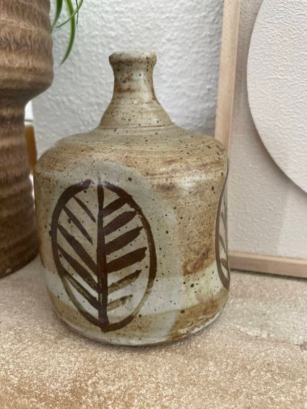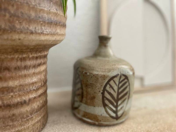Deze prachtige vintage vaas in beige met cremekleur, een fijn spikkeltje en een mokkakleurige opdruk van een blad (of is het toch een veer?) aan alle zijden is een echte lastpak te noemen want we kunnen maar niet achterhalen wat de oorsprong is. Is het een japans vaasje? is het deens? is het misschien van de Vuurvogel uit Milsbeek? conclusie; als het je doet denken aan al deze stijlen vinden wij het mooi. Nee, super mooi. En tot we de oorsprong hebben achterhaalt blijft deze mooierd de naam 'de mysterieuze veer' dragen (bij ons dan, jij mag hem ook corrie noemen als je wilt!)