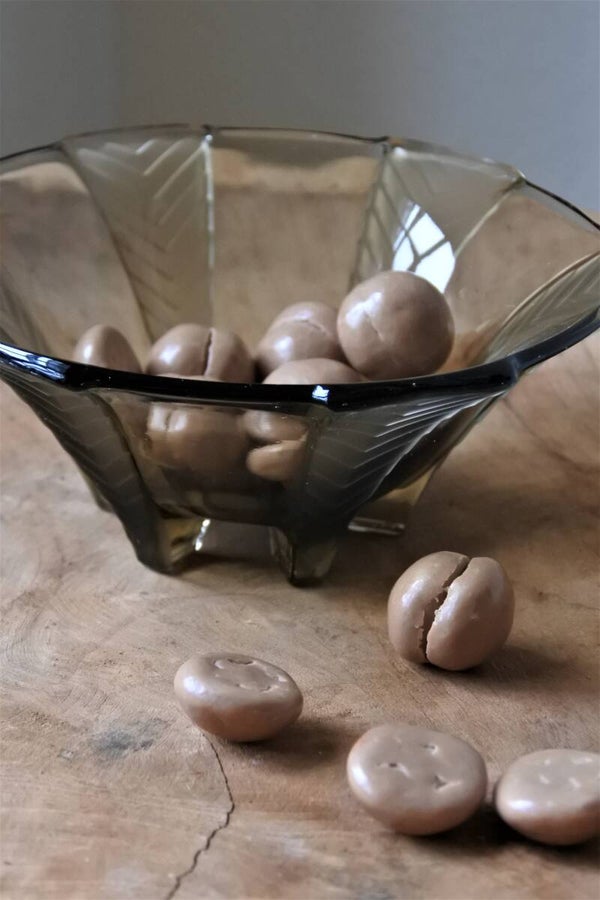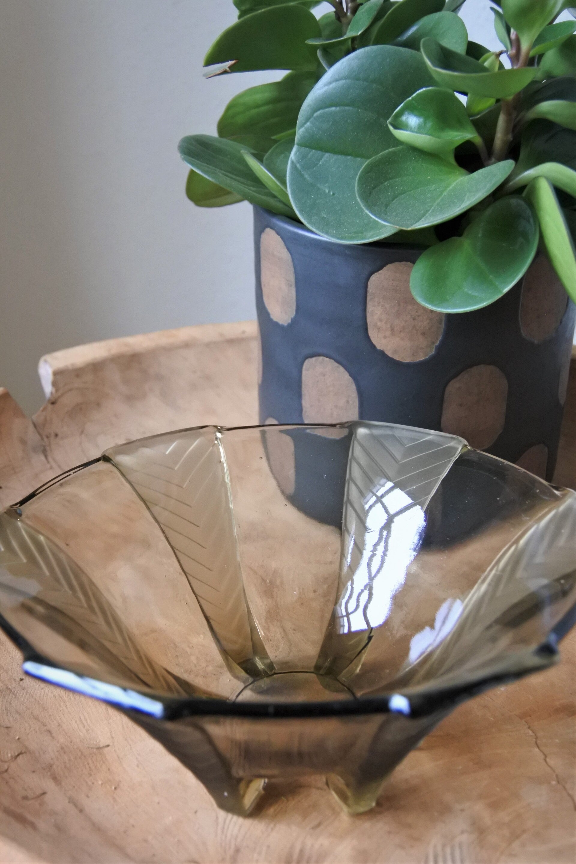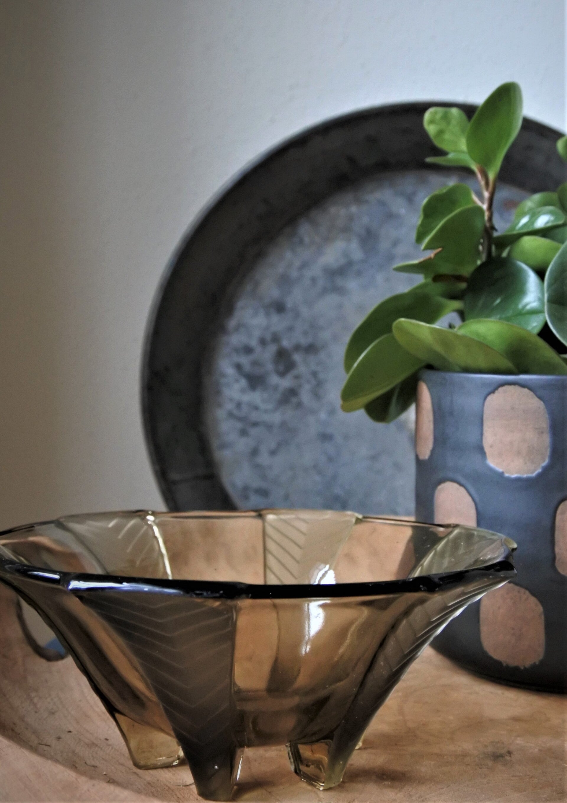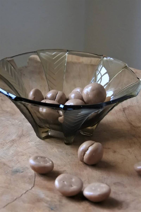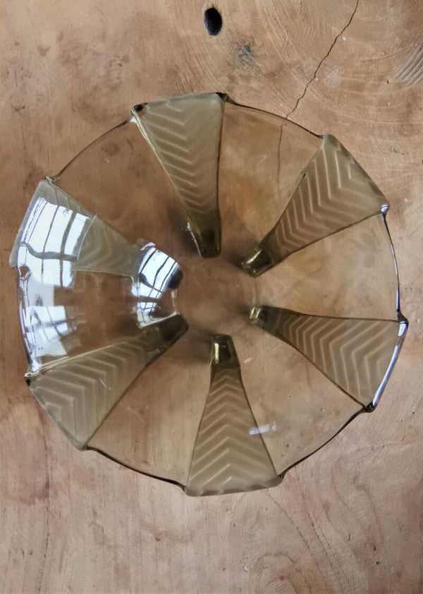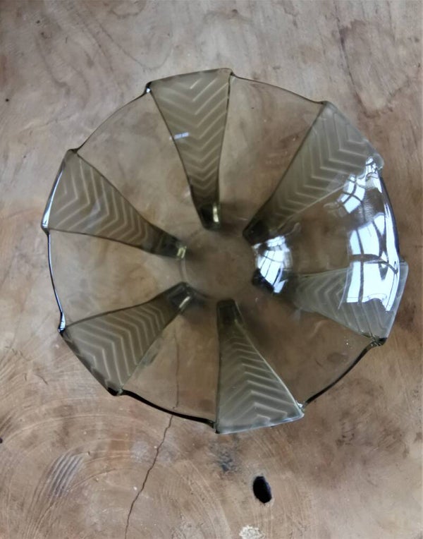 Deze mooie vintage schaal van geperst rookglas is van Walther & Söhne en heeft die echte art deco look van vroeger. De bowl is elegant door de geometrische patroon pootjes, komt uit de Athene serie en is zelfs nog terug te vinden in hun catalogus uit 1934.. nog even wachten (ca. 13 jaar.. ach de tijd vliegt joh) en je hebt zelfs een echt antiek item in handen!