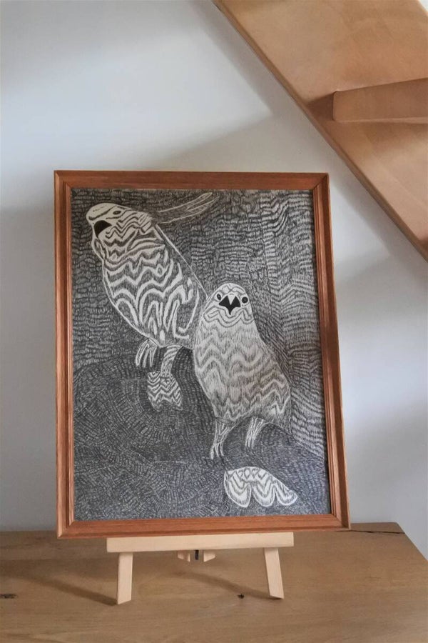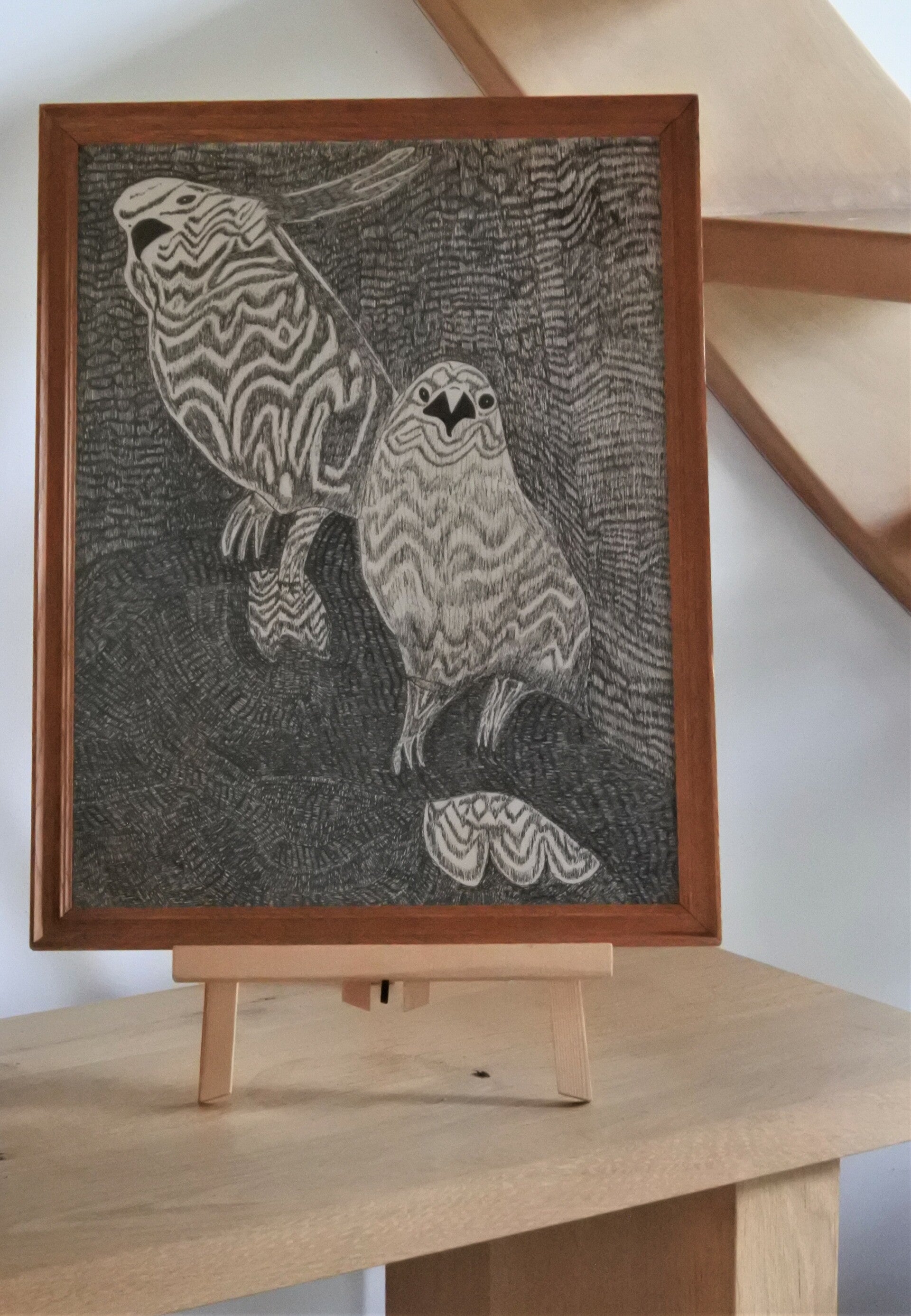 Wat een leuk item deze mooie ingelijste vintage schilderij van 2 vogels in zeer fijne details getekend in de kleuren zwart, grijs en wit. Met mooie houten omlijsting.