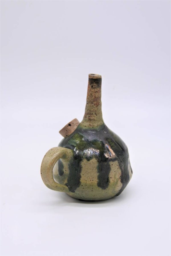 Vintage olielampje in stijl van Jan de Graaf in lichtgroen met mooi dripeffect in donkergroen met groot oortje en opmerkelijk krom halsje.
