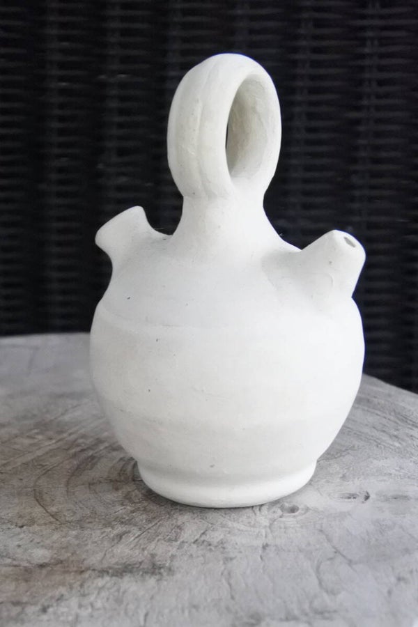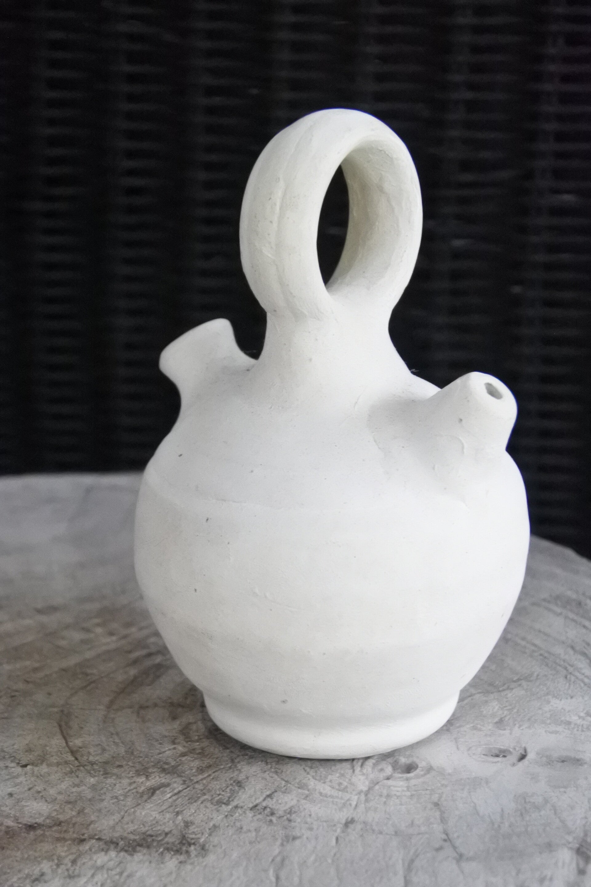 Dit onwijs leuke botijo... een wat? horen we je denken.. Een botijo, ook wel búcaro genoemd, is een traditionele poreuze kleicontainer die is ontworpen om water te bevatten. De botijo heeft de eigenschap dat eenmaal gevuld, het het water koelt dat het bevat en fungeert als een verdampingskoeler. Deze heeft een fris witte kleur en is misschien wel erg klein om functioneel in te zetten maar past door zijn tijdloze design in ieders interieur als decoratief object.